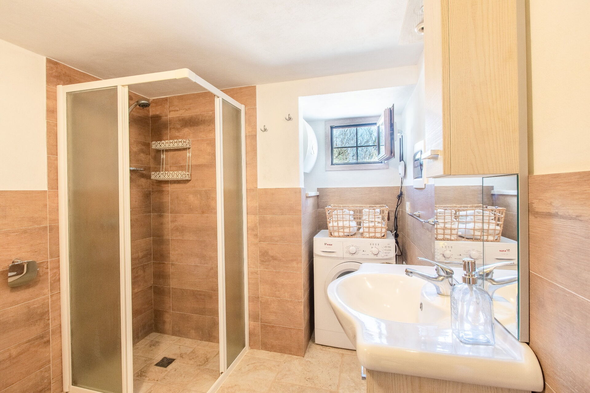 Badkamer: wastafel, bidet, douche, wasmachine.