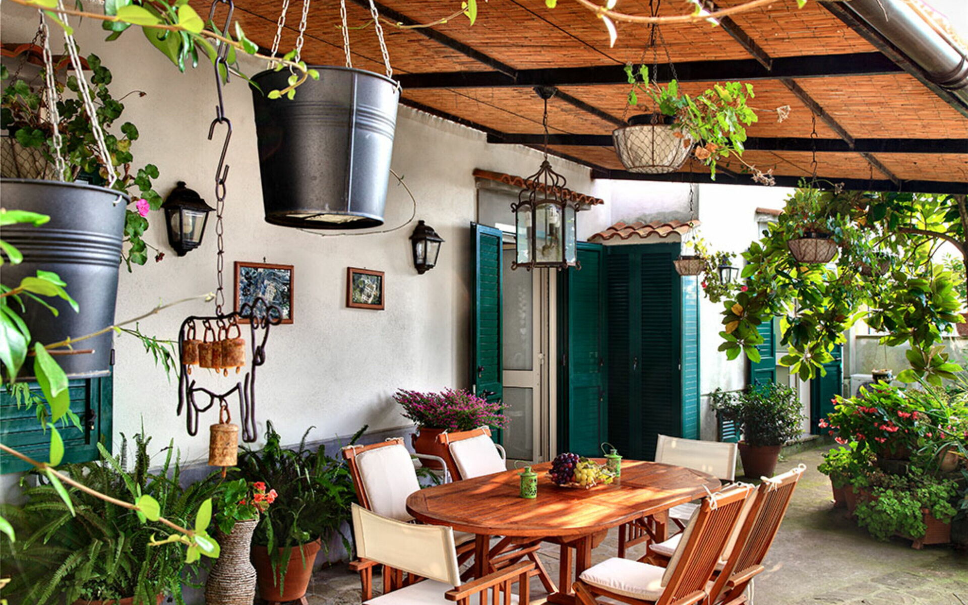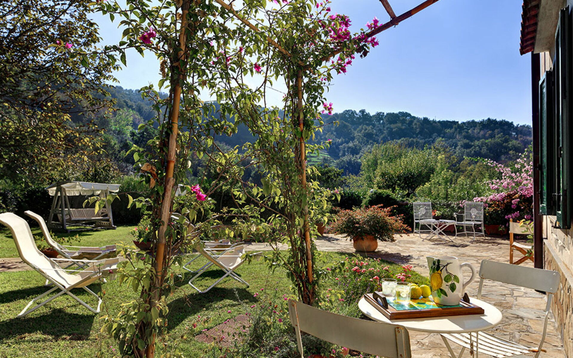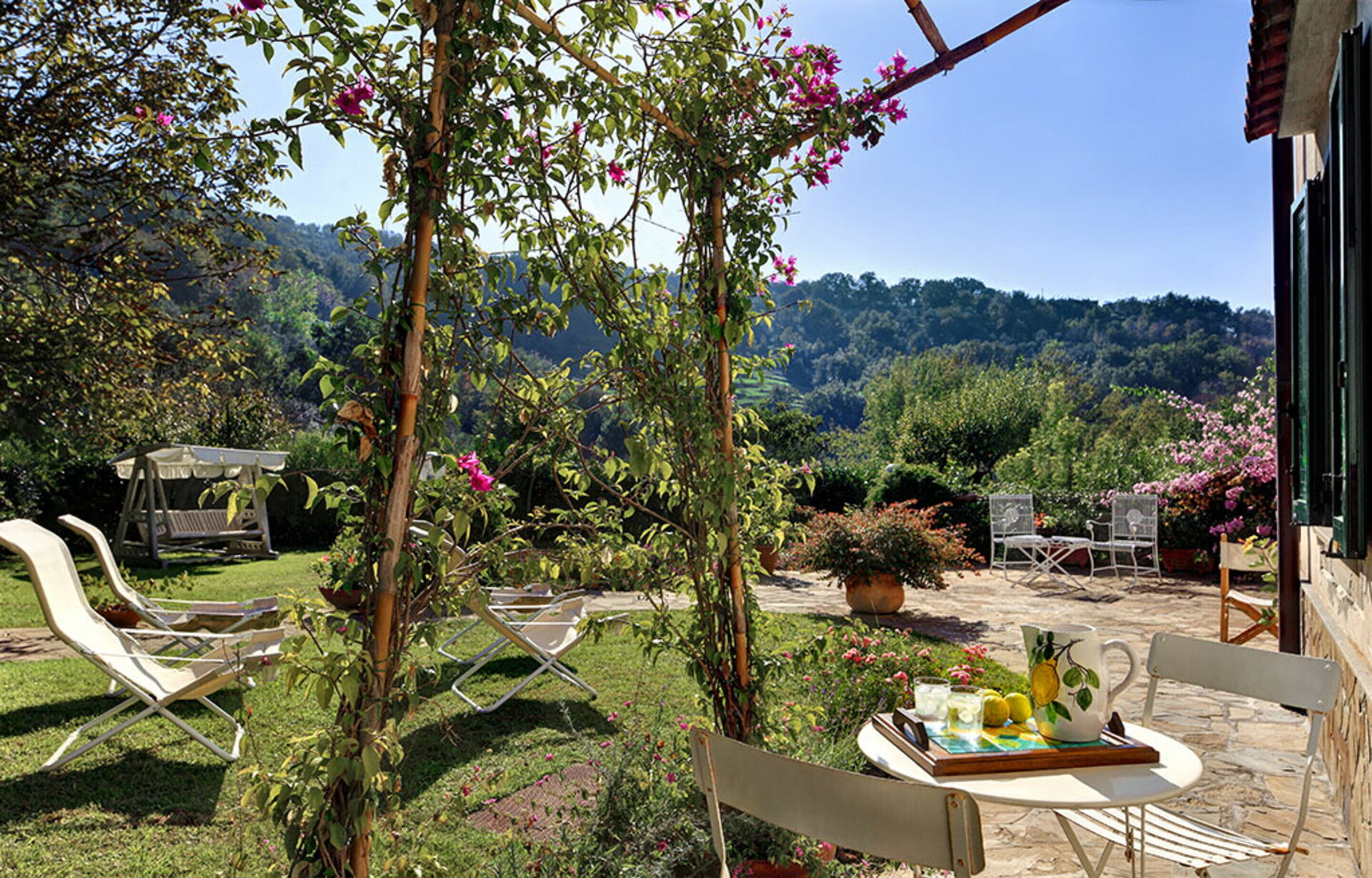 Terras: dineren in de buitenlucht, eettafel, terrasmeubilair, ligstoel.