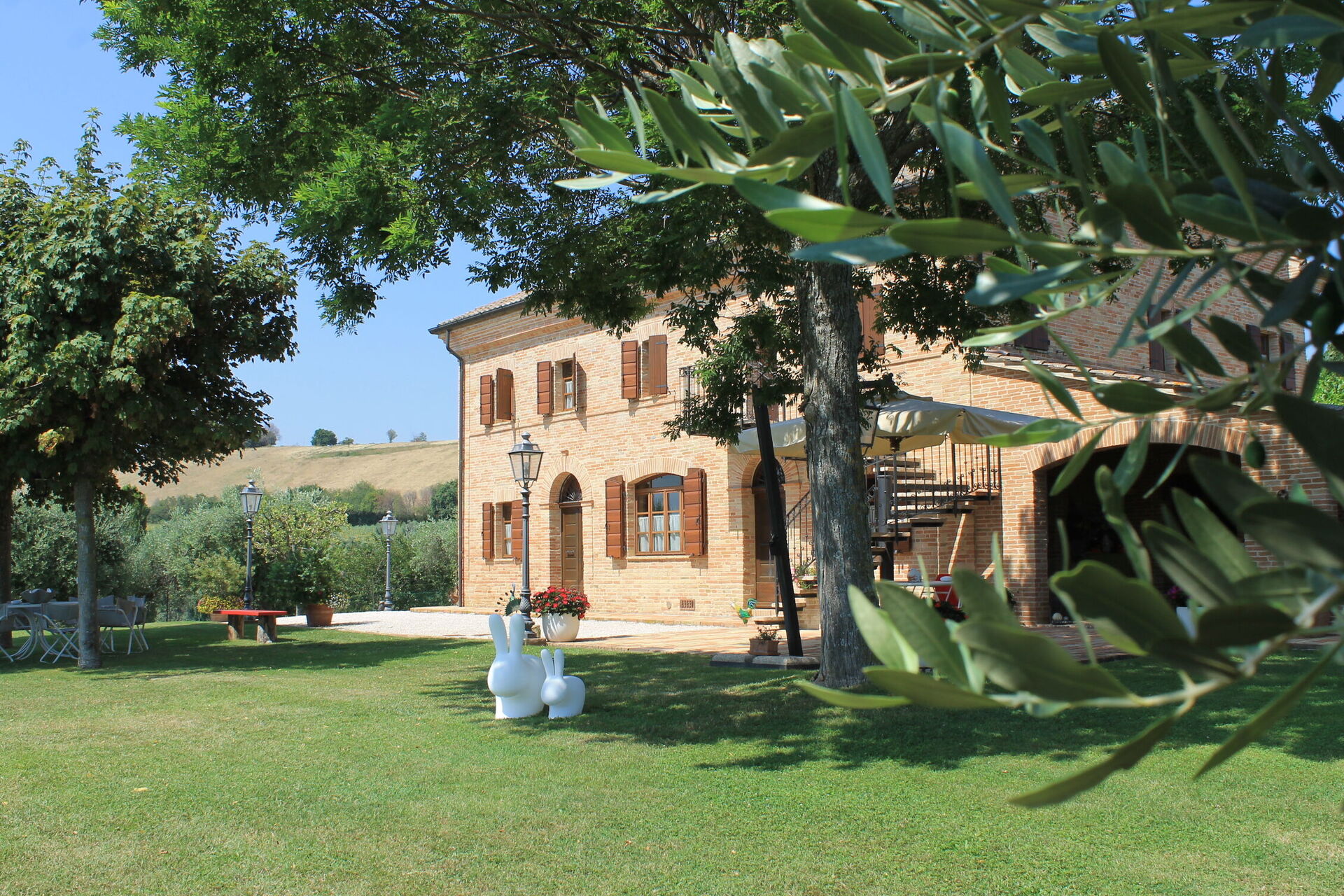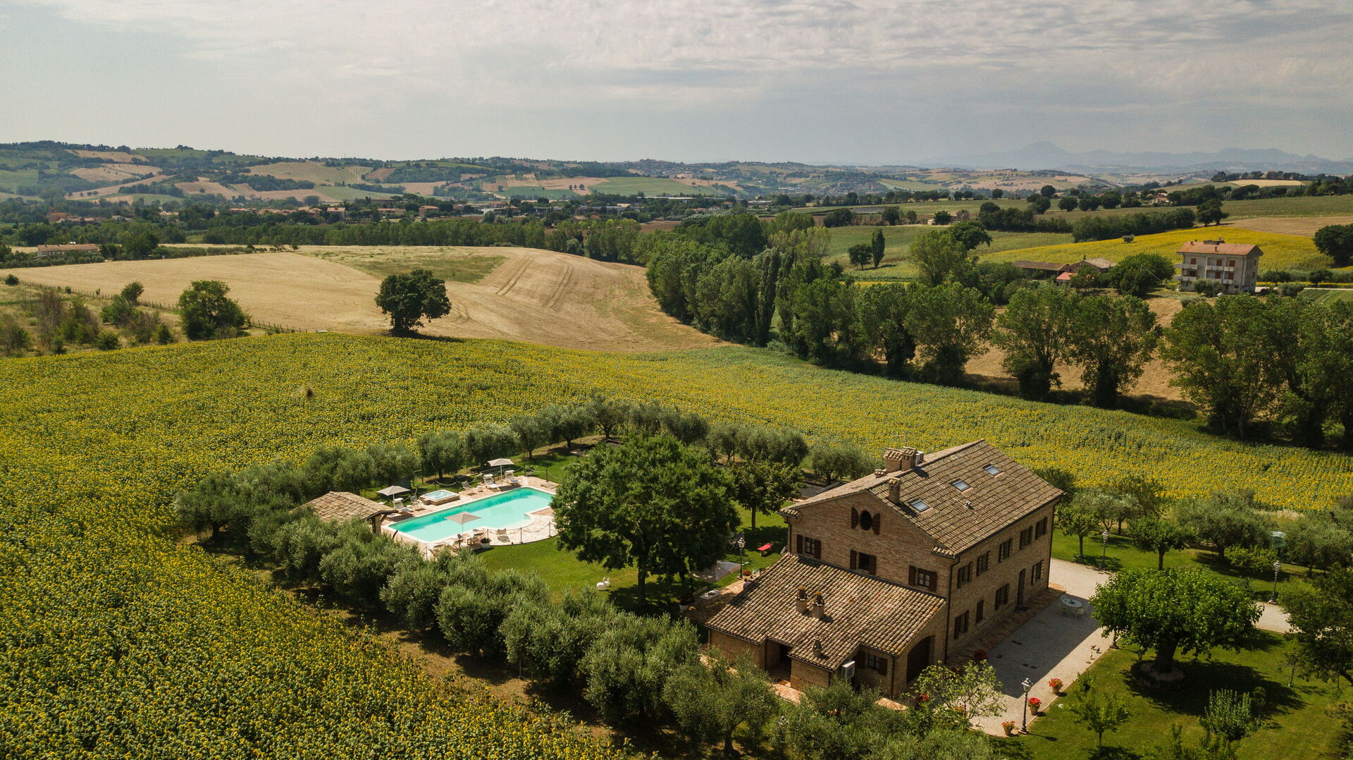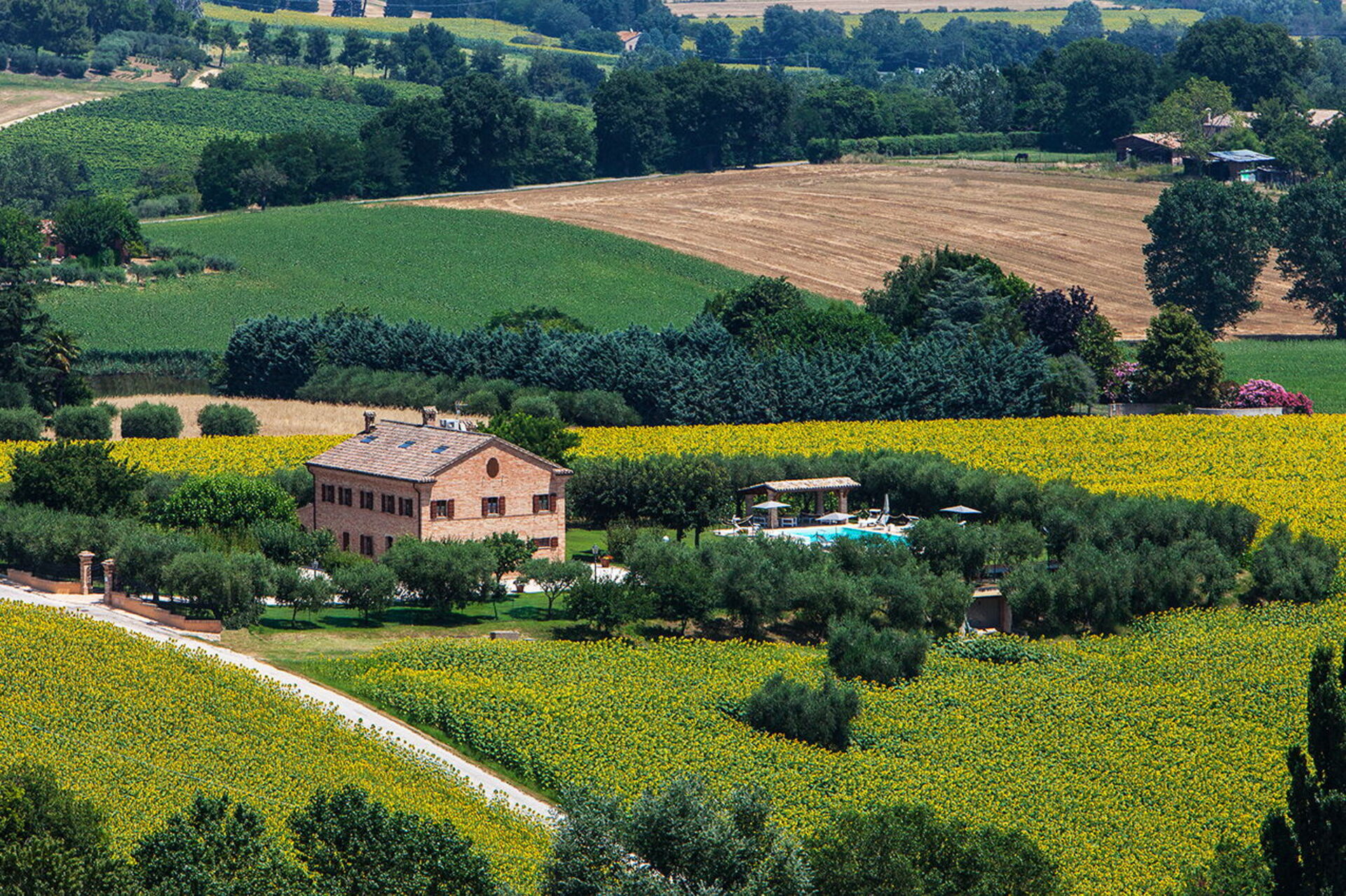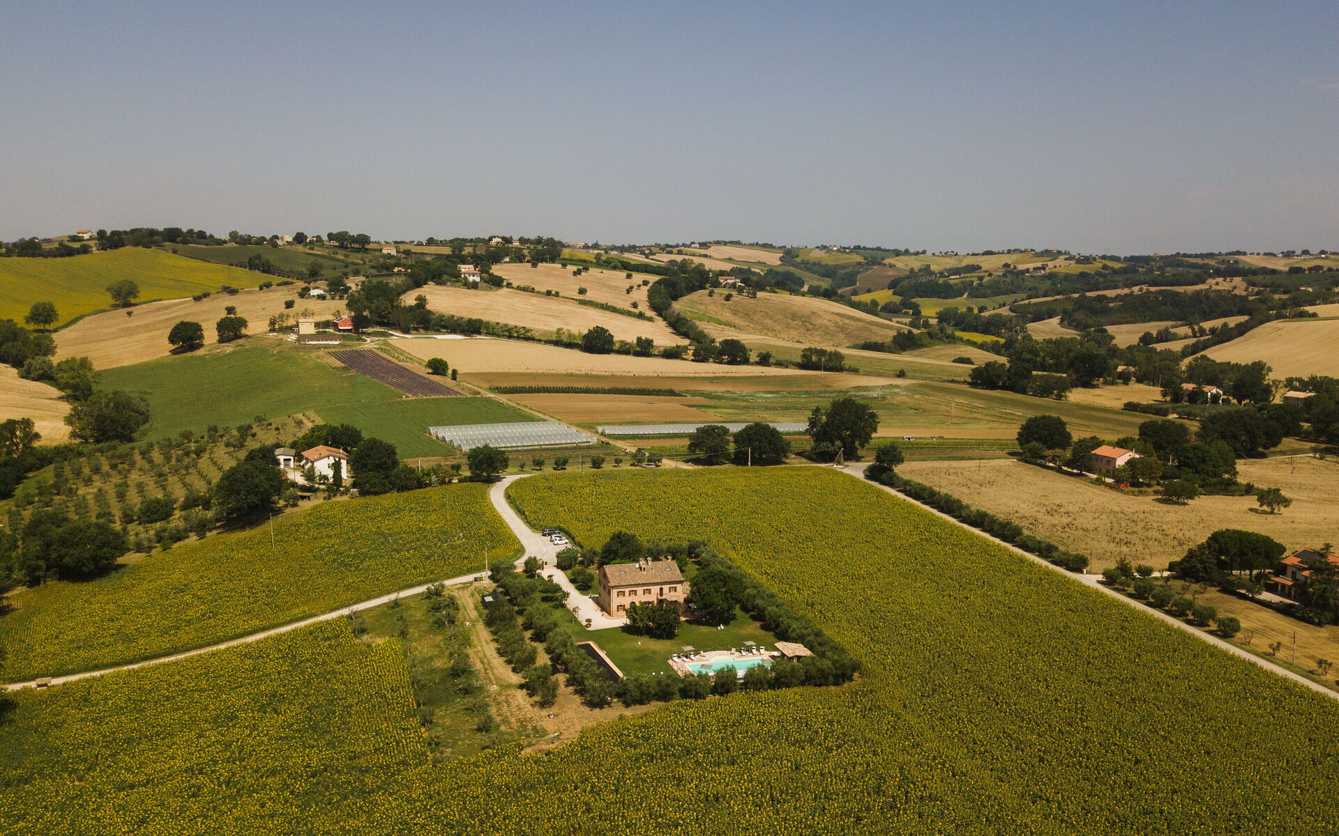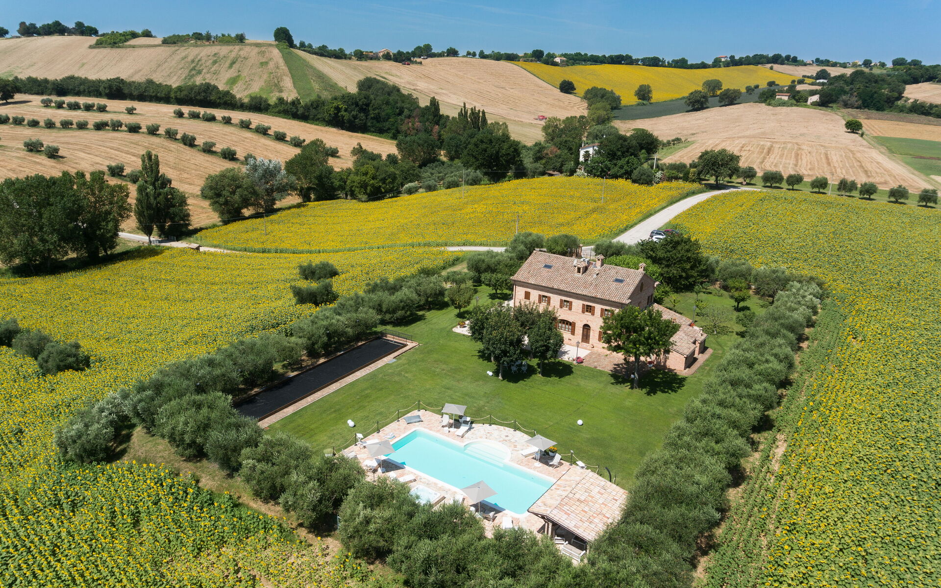 Villa Il Grano is surrounded by its 11 hectares of land planted with wheat and sunflowers, which give the surrounding landscape wonderful colors, and by more than one hundred olive trees that characterize this area of the Marche countryside and from which the family obtains an excellent extra virgin olive oil. .