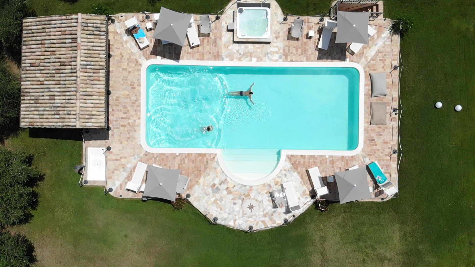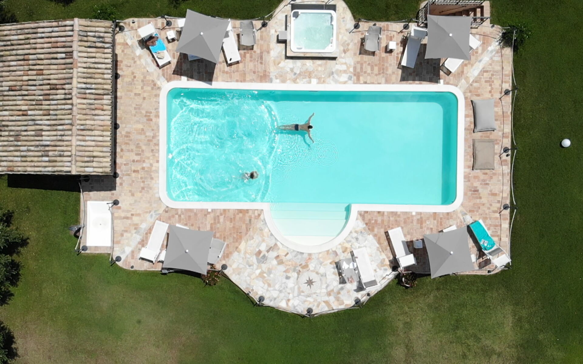 In the quiet sloping down of the lawn, the pool area opens up a space for rest: at Villa Pedossa wellness meets nature by communicating with the landscape.