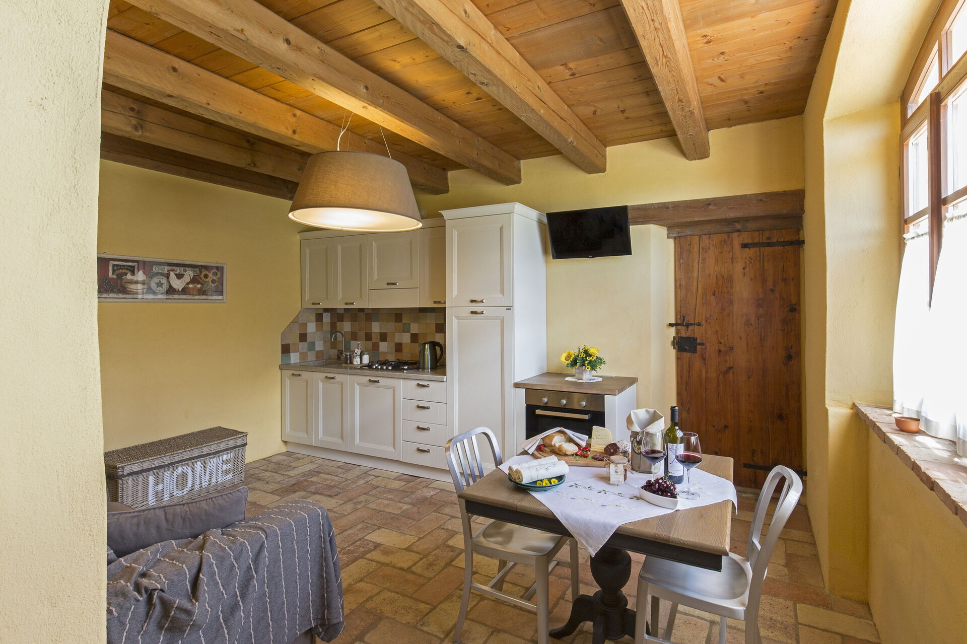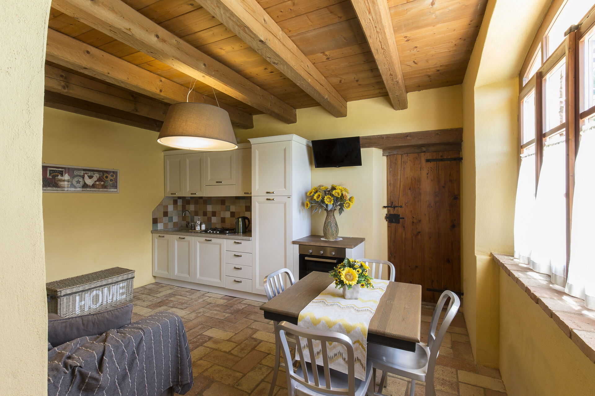 Keuken – woonkamer 1: goed uitgeruste keuken, eettafel, vaatwasser, ijskast, diepvriezer, magnetron, houtkachel, oven, broodrooster, italiaans koffiezetapparaat, koffiezetapparaat, bank, fauteuil, bureau, tweepersoons-slaapbank, WIFI internet, satelliet tv, uitgang naar de tuin.
