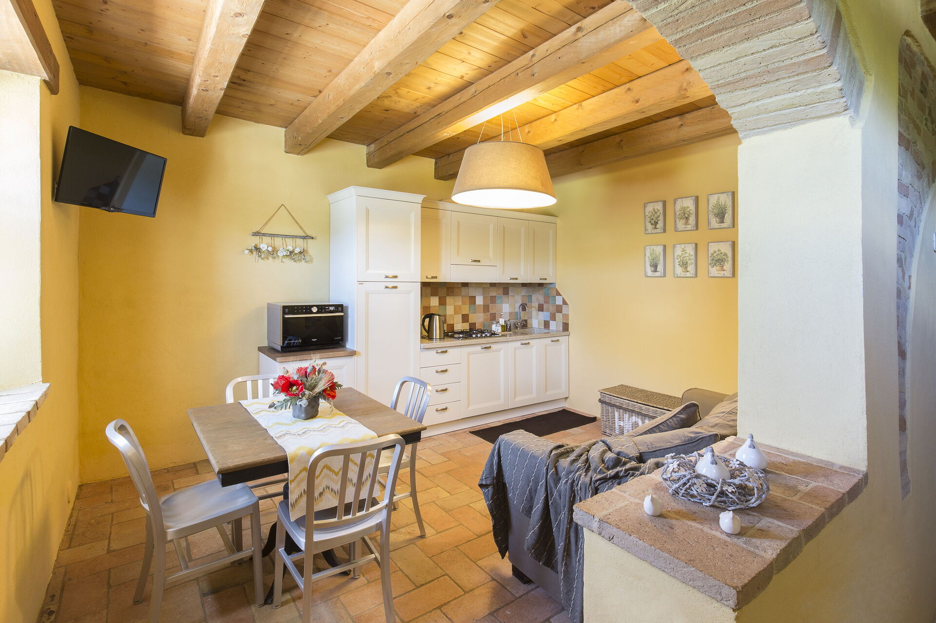 Keuken – woonkamer 2: goed uitgeruste keuken, eettafel, vaatwasser, ijskast, diepvriezer, kookplaat, houtkachel, oven, broodrooster, italiaans koffiezetapparaat, koffiezetapparaat, bank, fauteuil, bureau, tweepersoons-slaapbank, WIFI internet, airconditioning, satelliet tv, uitgang naar de tuin.