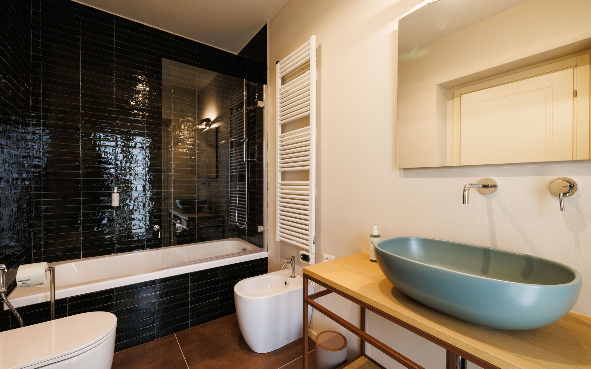 Slaapkamer met badkamer 1: tweepersoonsbed, WIFI internet, airconditioning, wastafel, toilet , bidet, bad, haardroger.