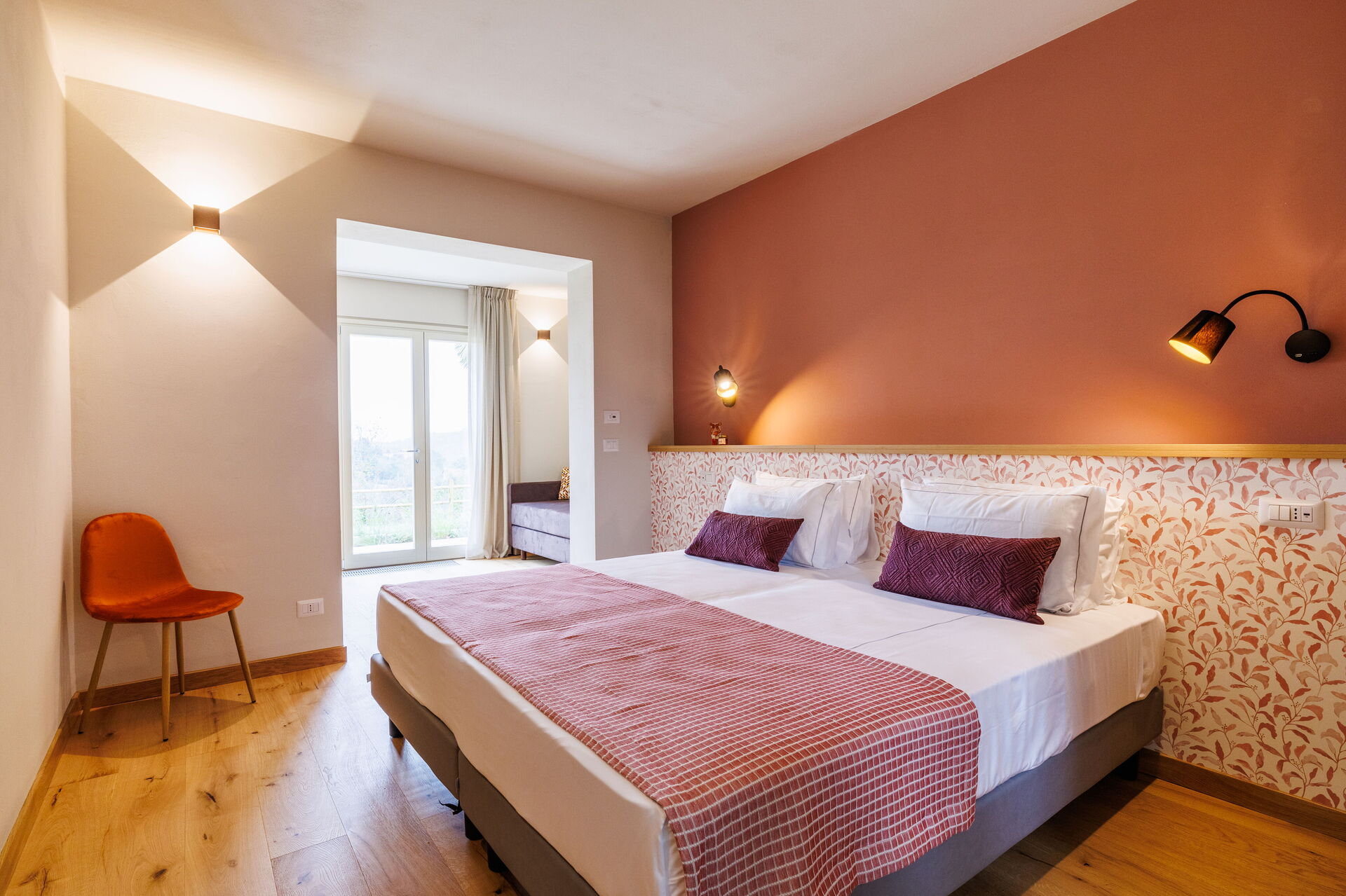 Slaapkamer met badkamer 2: tweepersoonsbed, slaapbank, WIFI internet, airconditioning, wastafel, toilet , bidet, douche, haardroger.