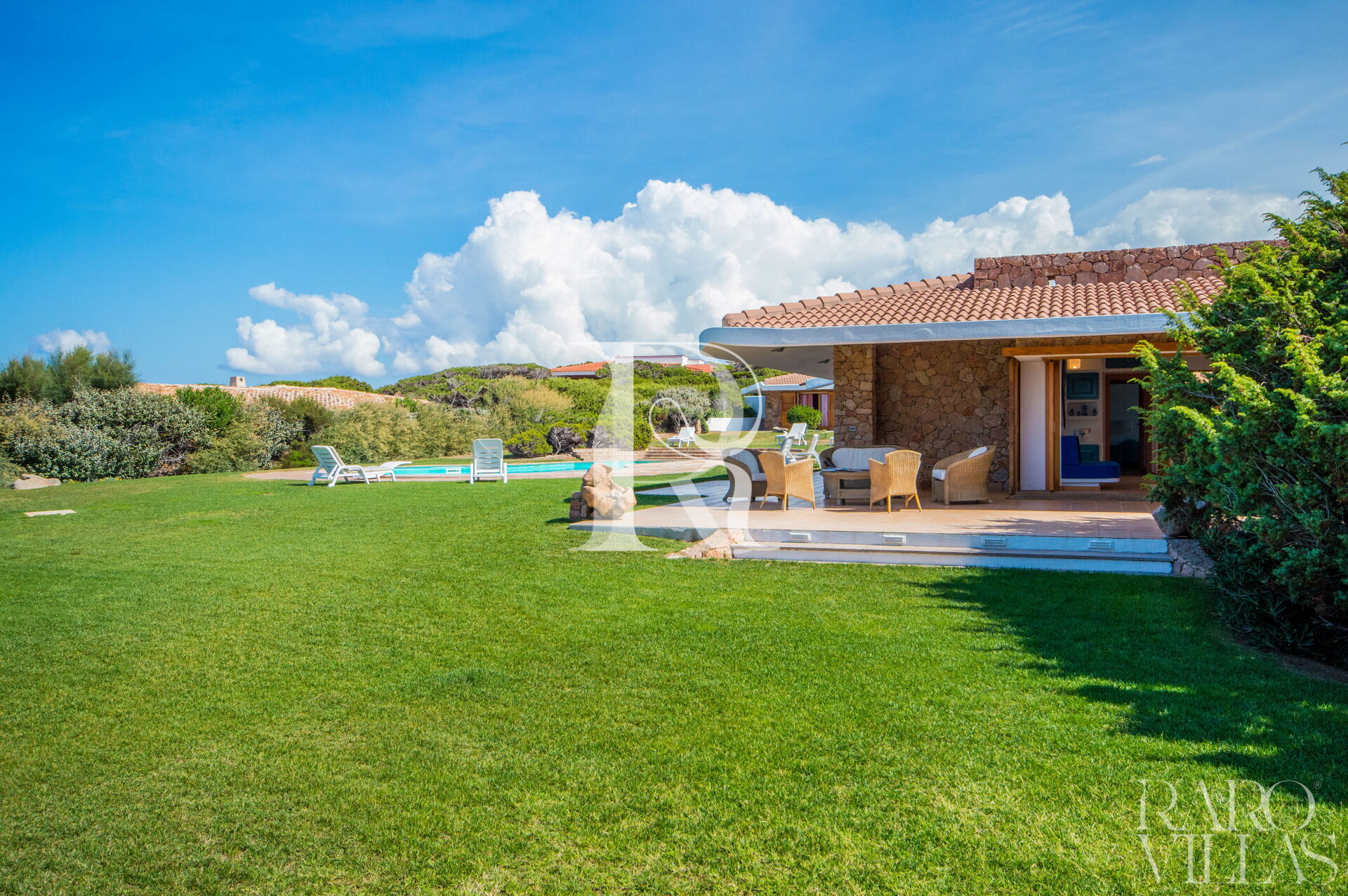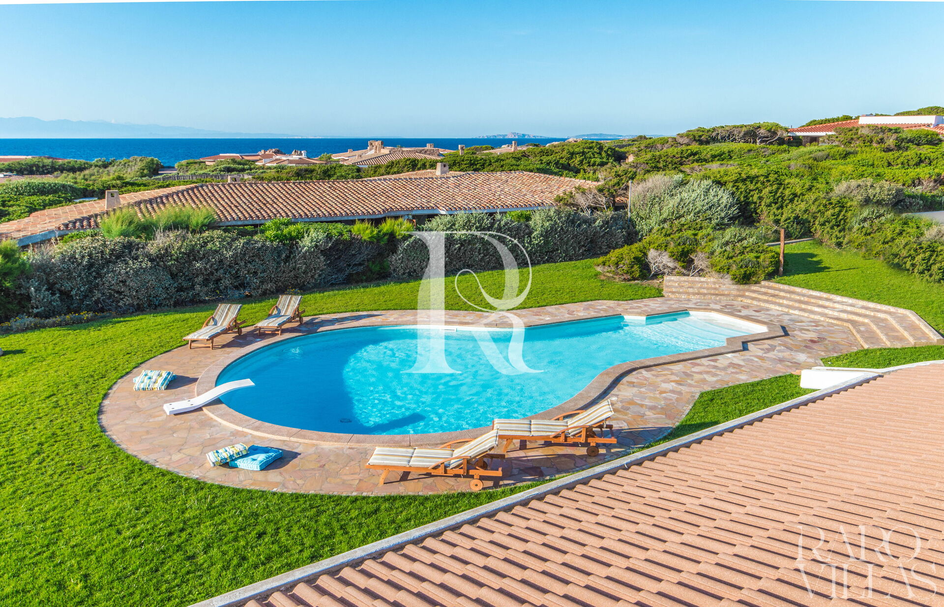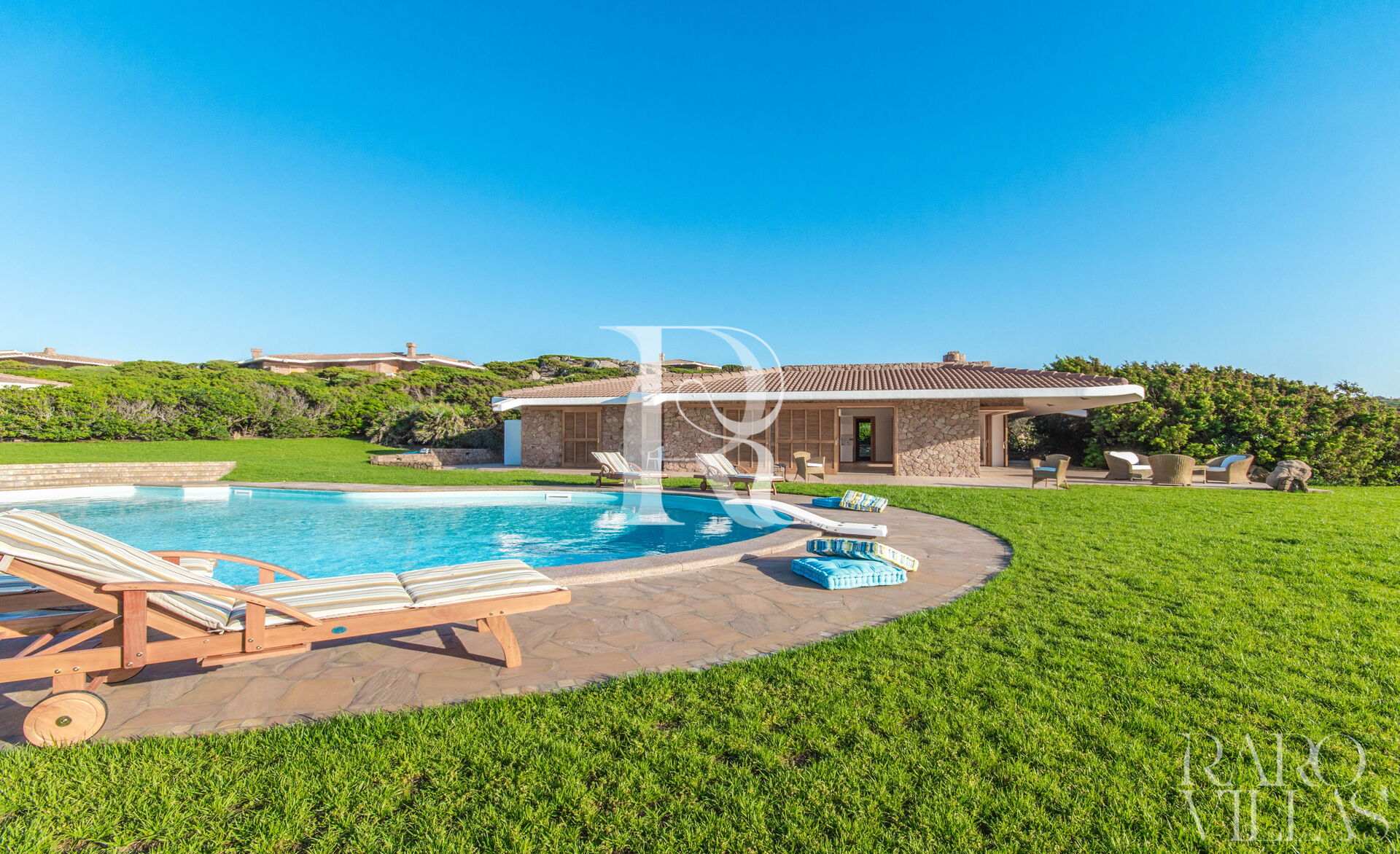 Villa Luce is a prestigious villa for rent in Sardinia, with sea view, which can accommodate up to 14 people in 7 bedrooms and 6 bathrooms. The property consists of two villas with a very large, well-kept garden and a bulb-shaped swimming pool.