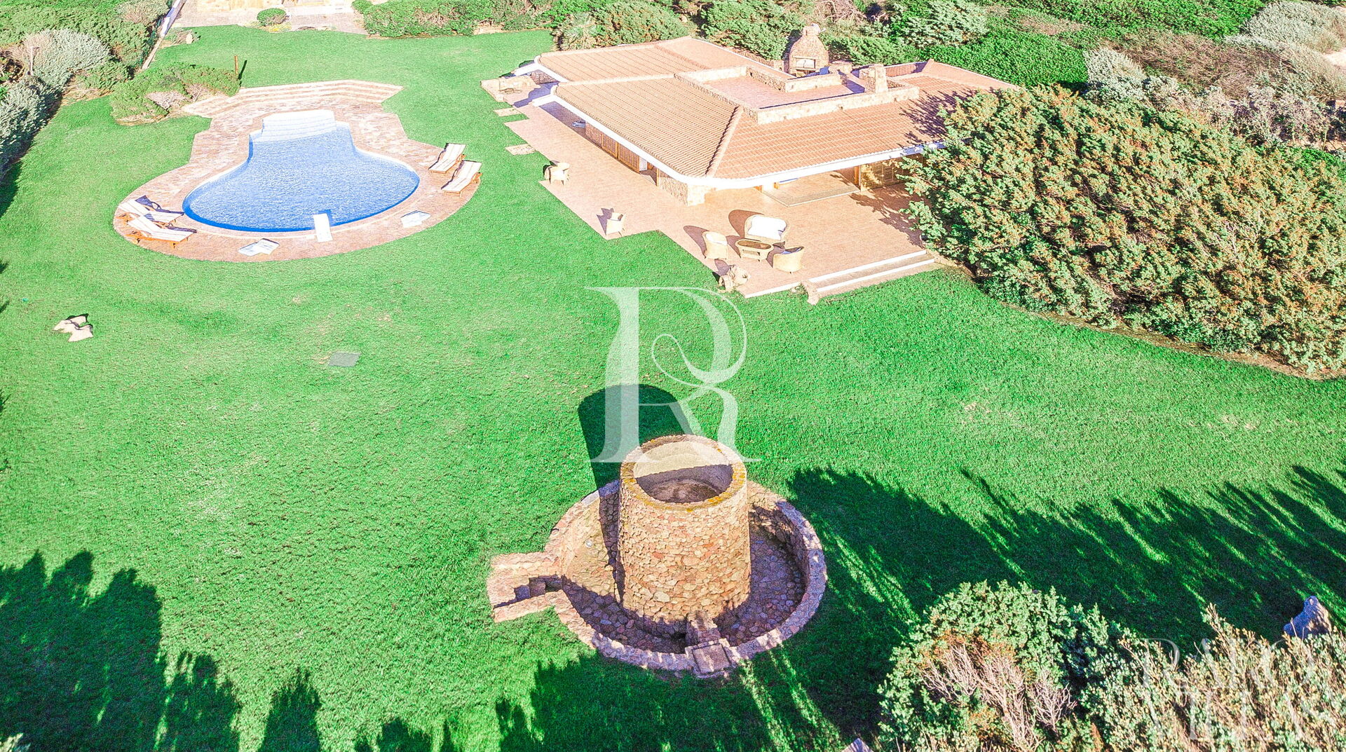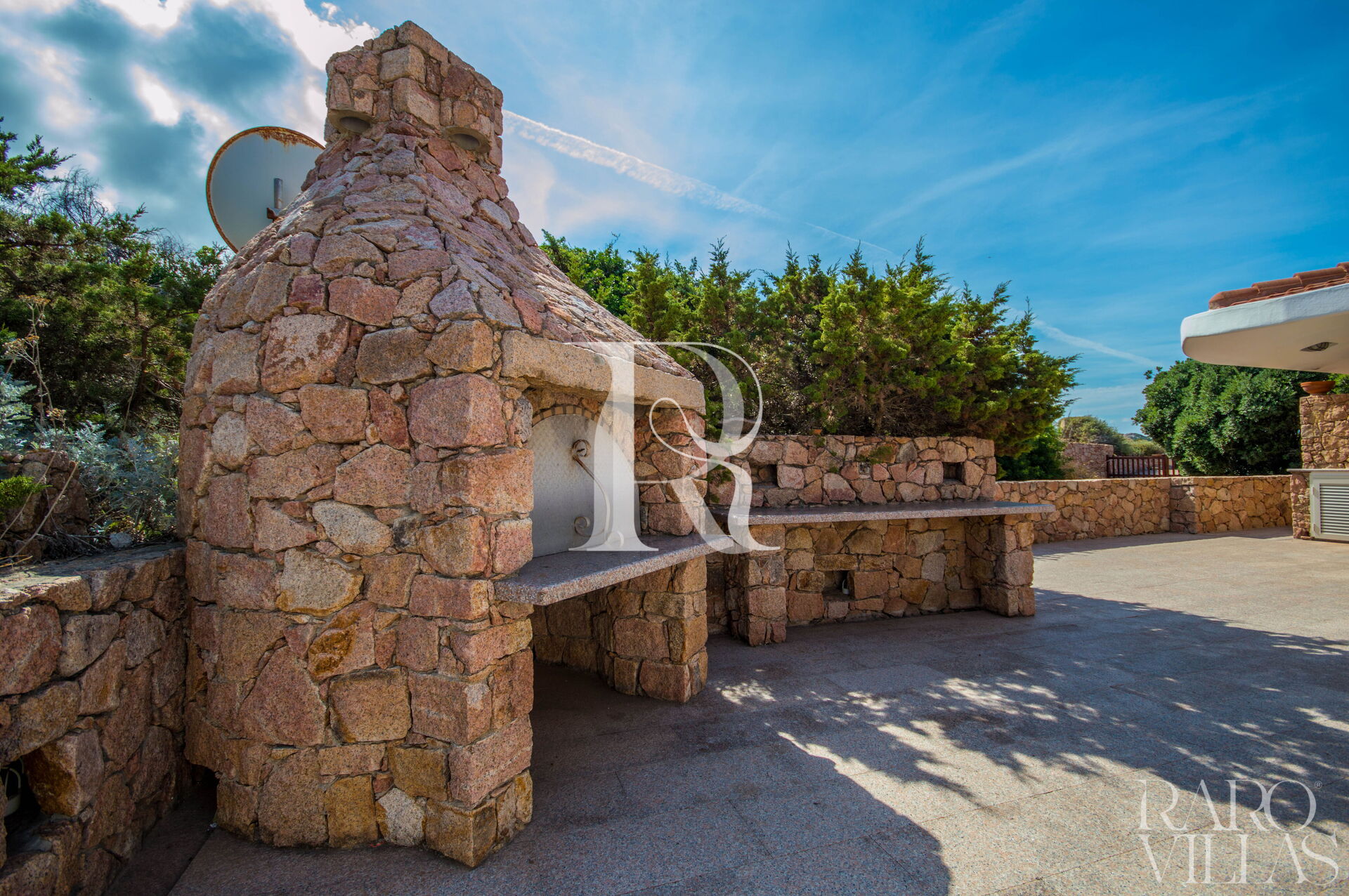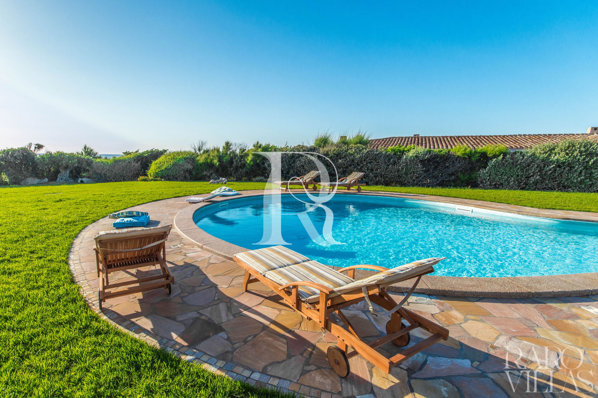 Villa Luce is a prestigious villa for rent in Sardinia, with sea view, which can accommodate up to 14 people in 7 bedrooms and 6 bathrooms. The property consists of two villas with a very large, well-kept garden and a bulb-shaped swimming pool.