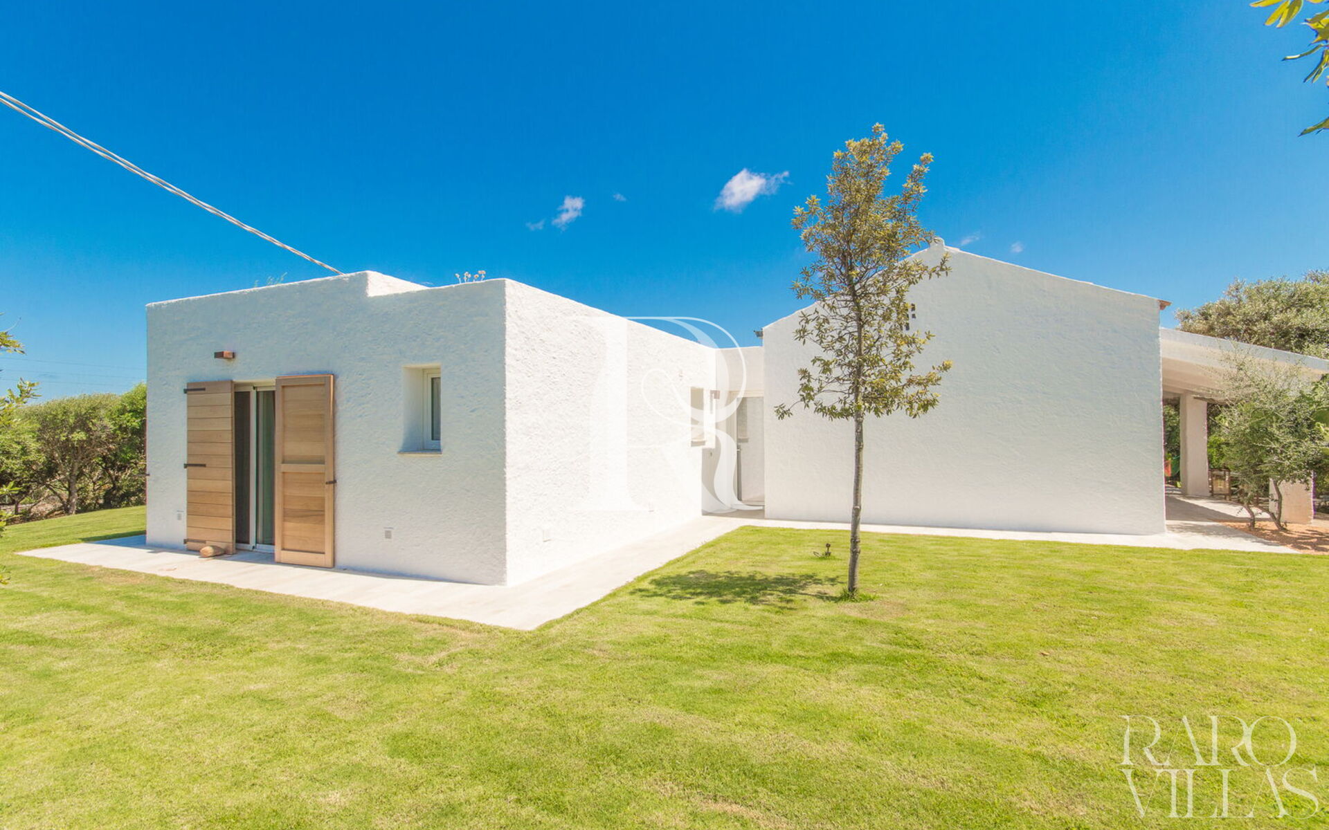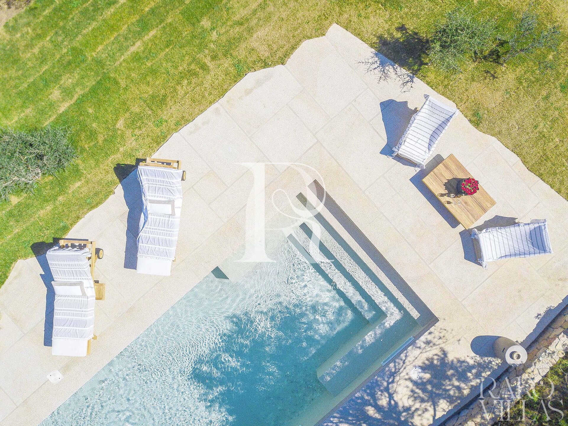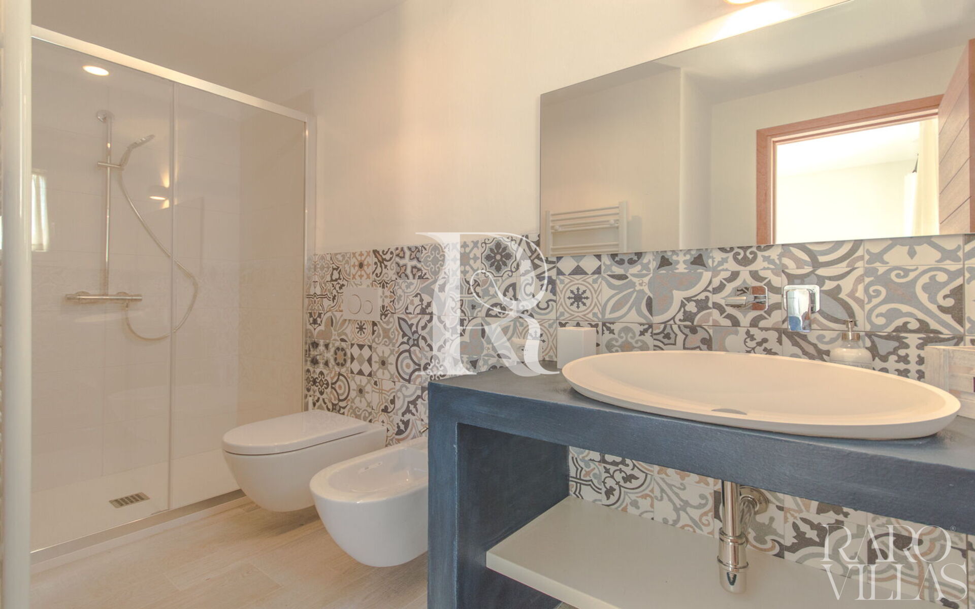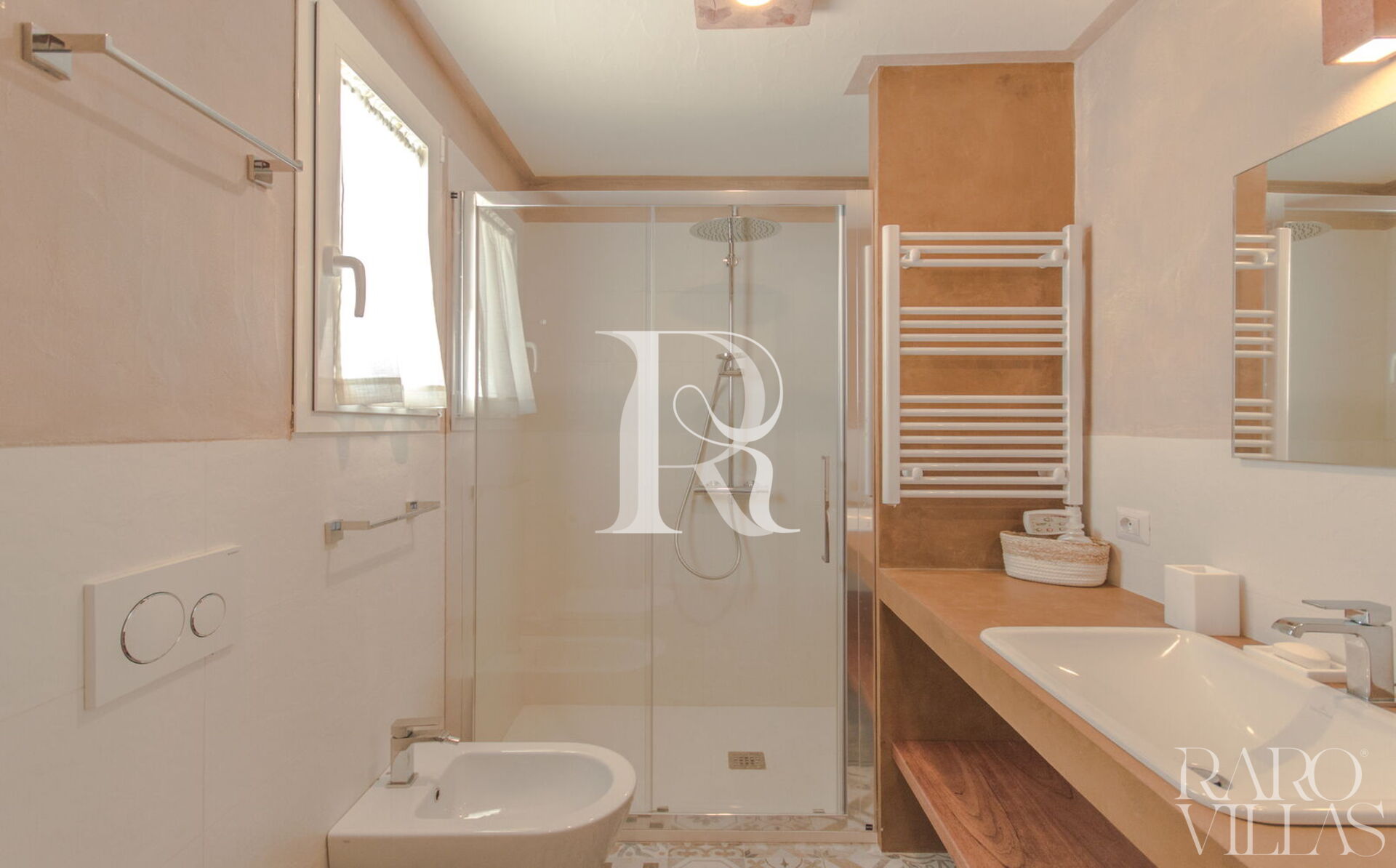The five bedrooms, all air-conditioned and with direct access to the garden-pool, have a luxurious design. Three of them are double and have en suite bathrooms with shower, while a double bedroom offers an external bathroom with shower, which also serves the living area.