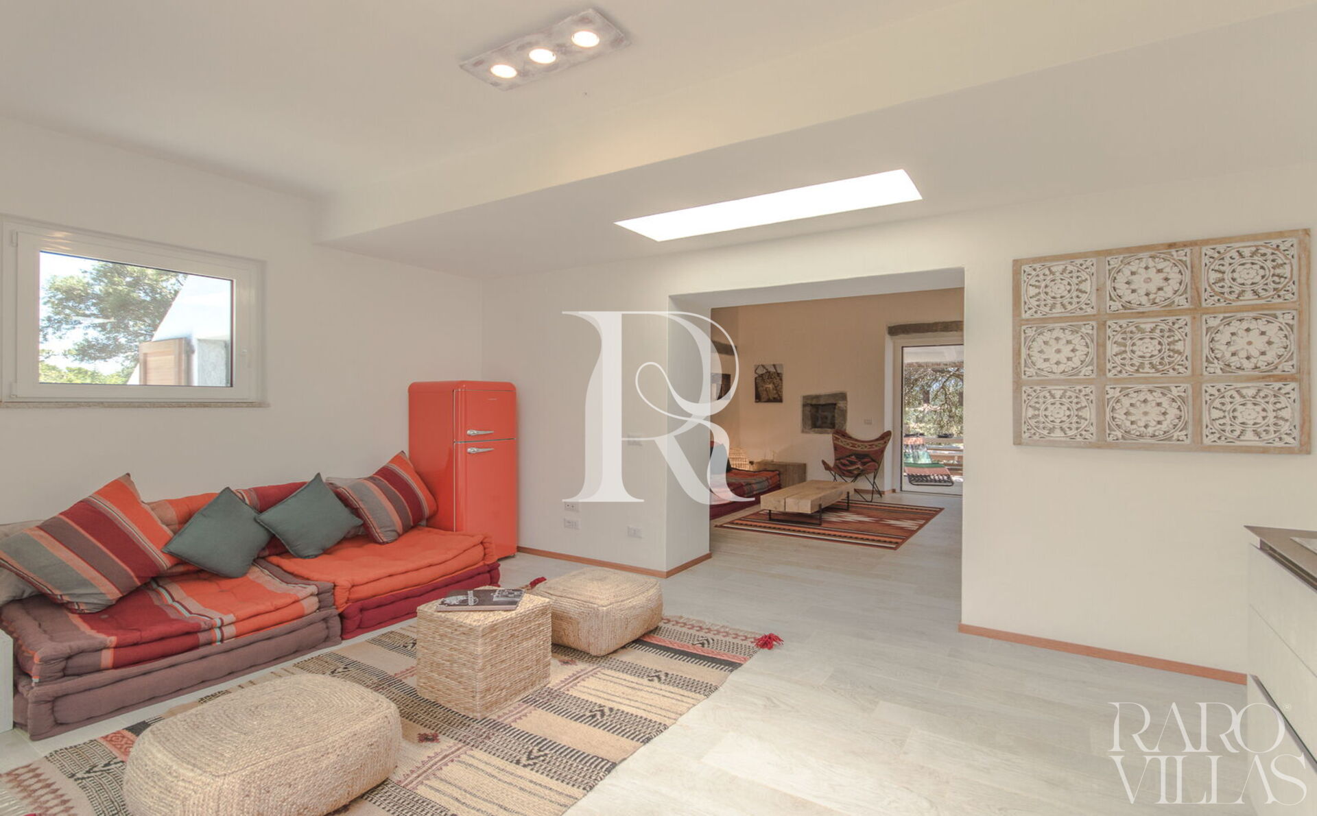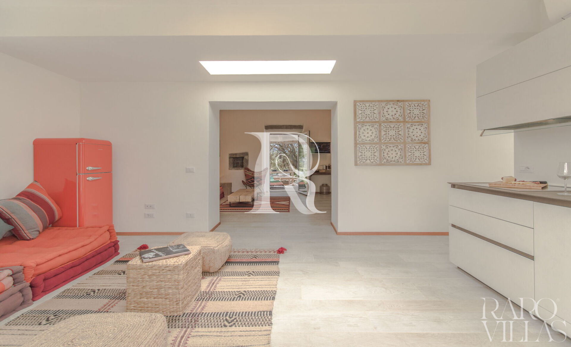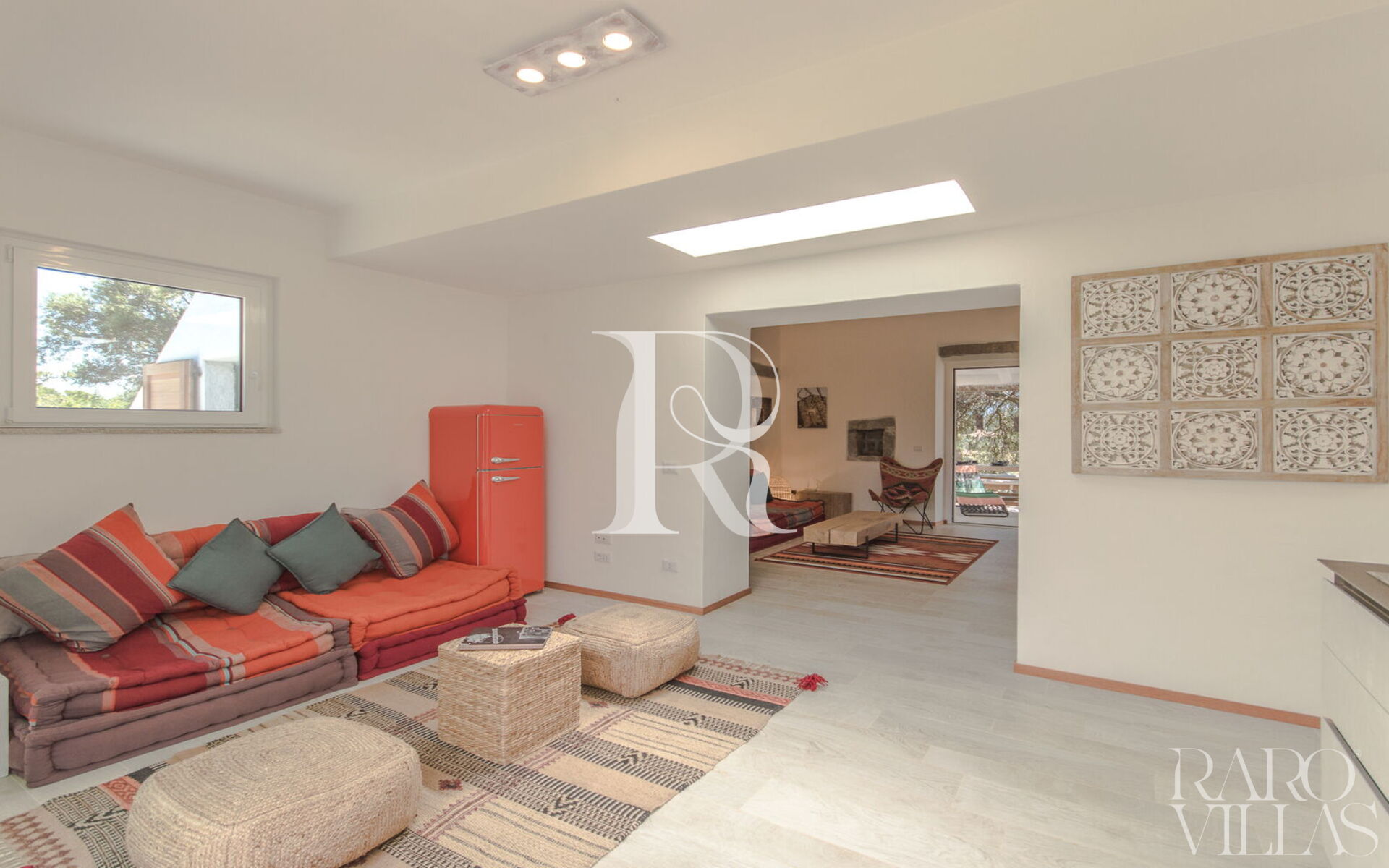 The two living rooms have comfortable sofas, poufs, armchairs, coffee tables and all the furnishings to make these rooms cosy and comfortable for your moments of relaxation, as well as different styles to suit all tastes. They are illuminated by the large French windows overlooking the villa's two verandas, a smaller window and a skylight.