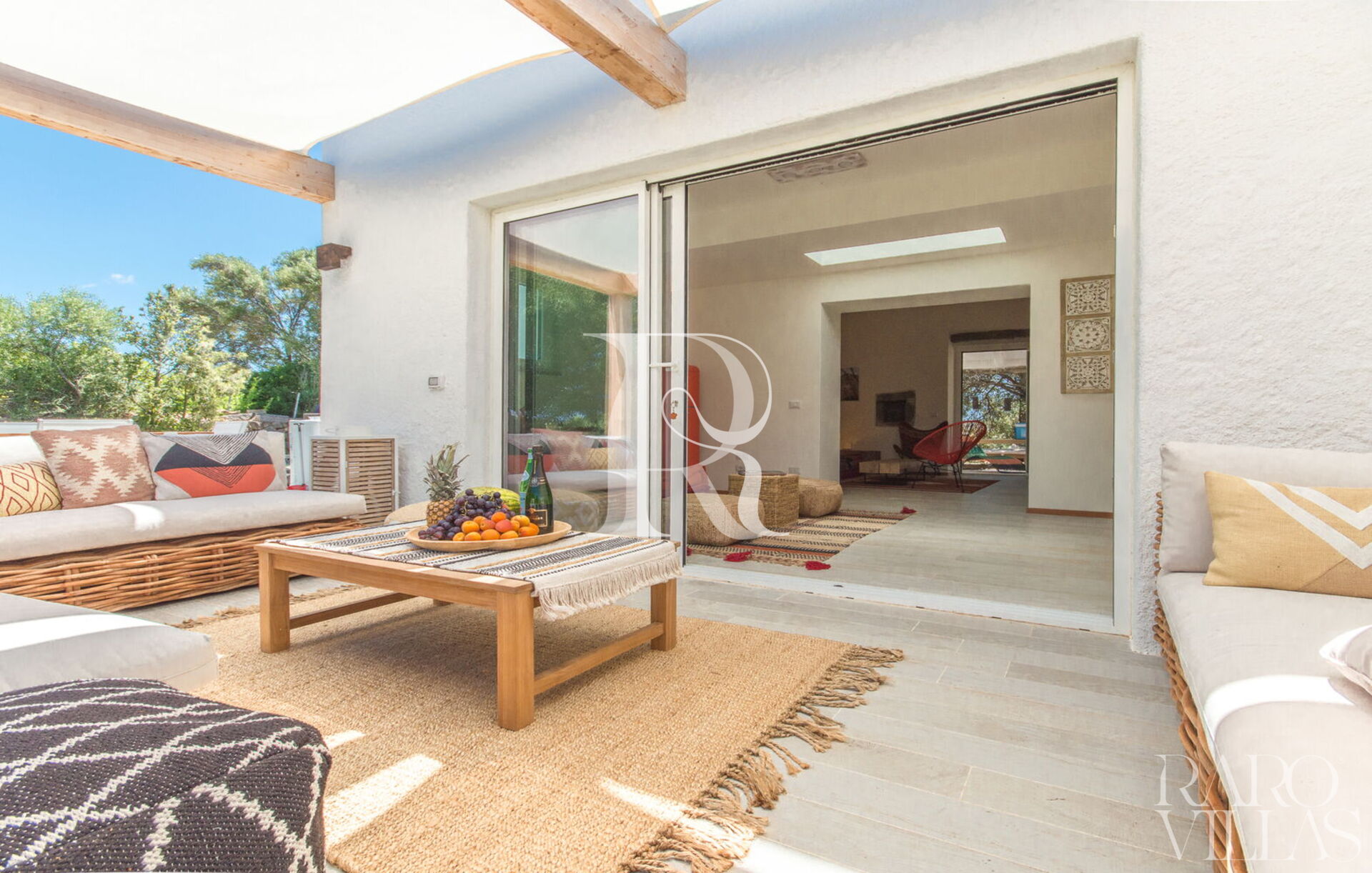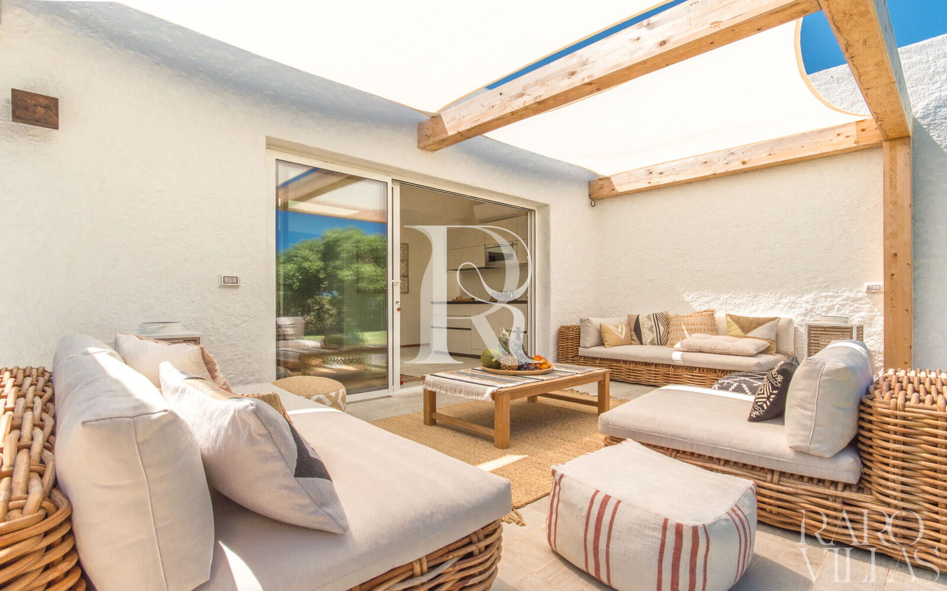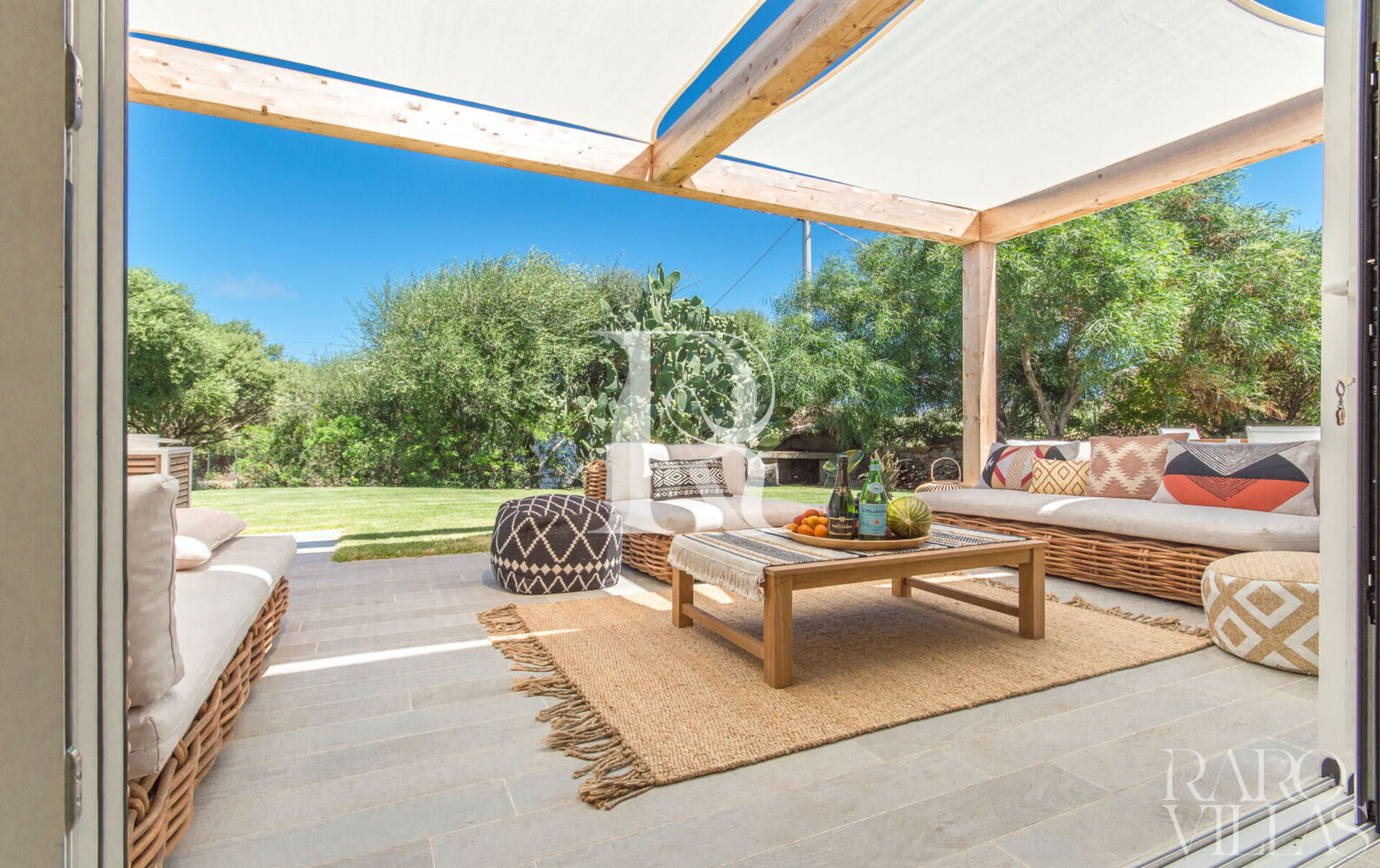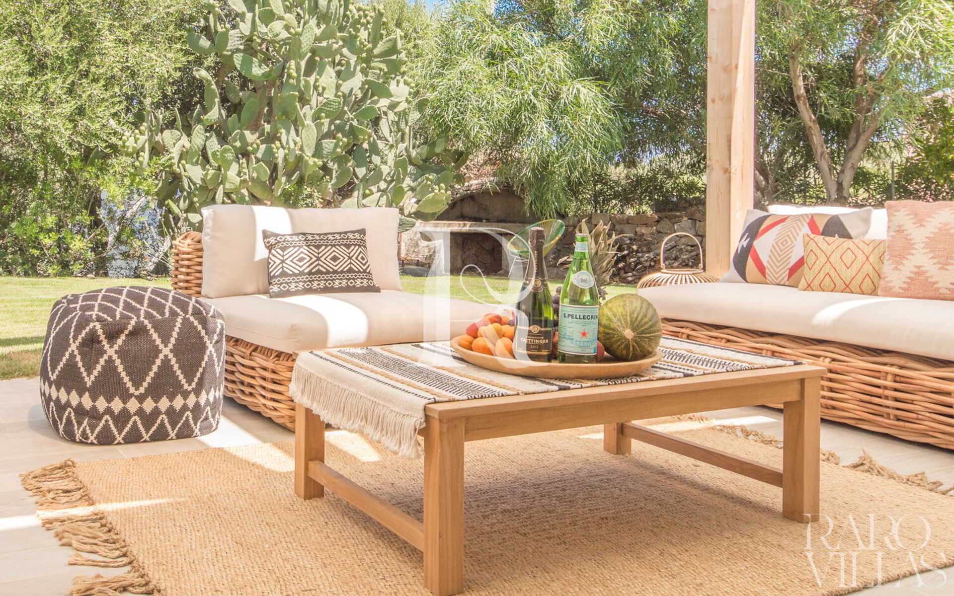The living room, having the main entrance, opens onto a veranda furnished with a comfortable outdoor sitting area, overlooking the villa's manicured garden, and a dining area for eating outside and al fresco.