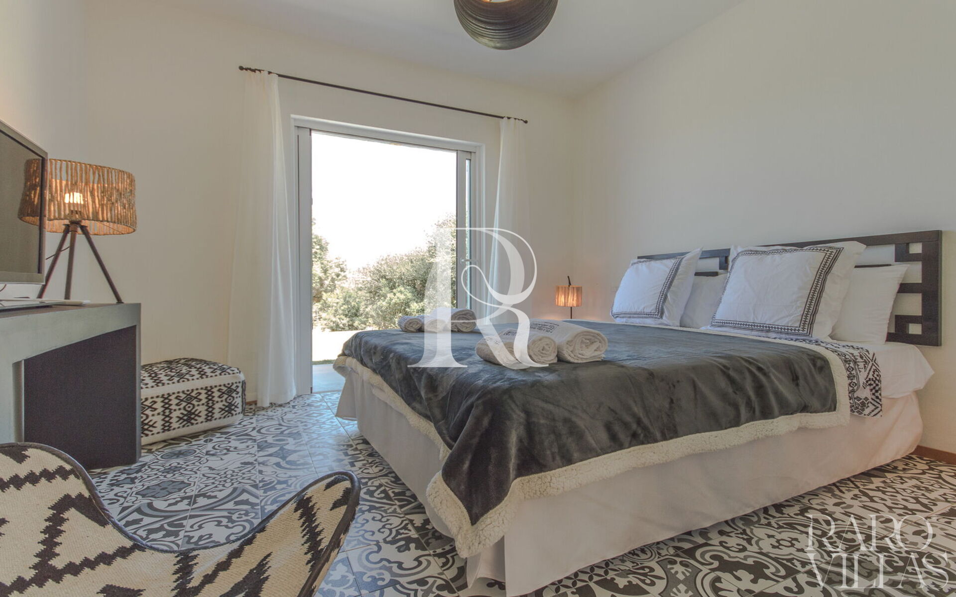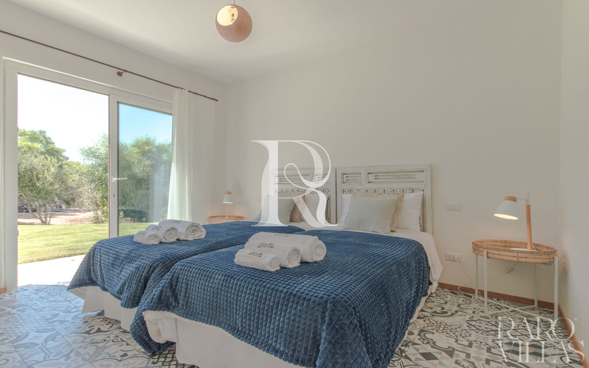 The living area leads to the 5 bedrooms. All rooms have air conditioning and a door/window with access to the garden. The unique style of the rooms will bring tranquillity to your stay. In addition, all rooms feature different decorated stoneware tiles on the floor and elsewhere.