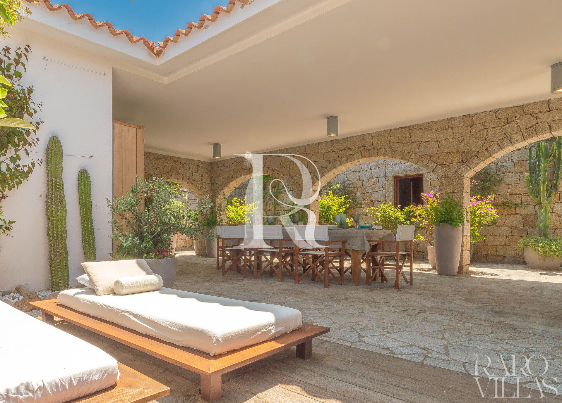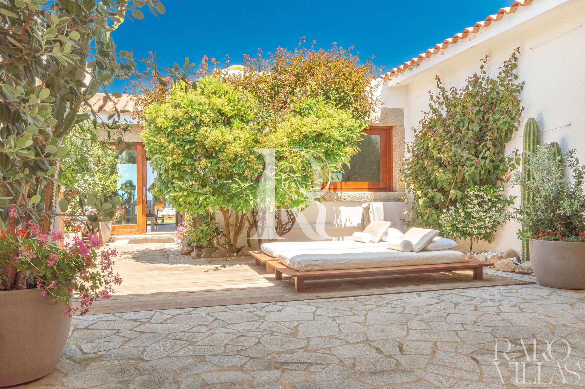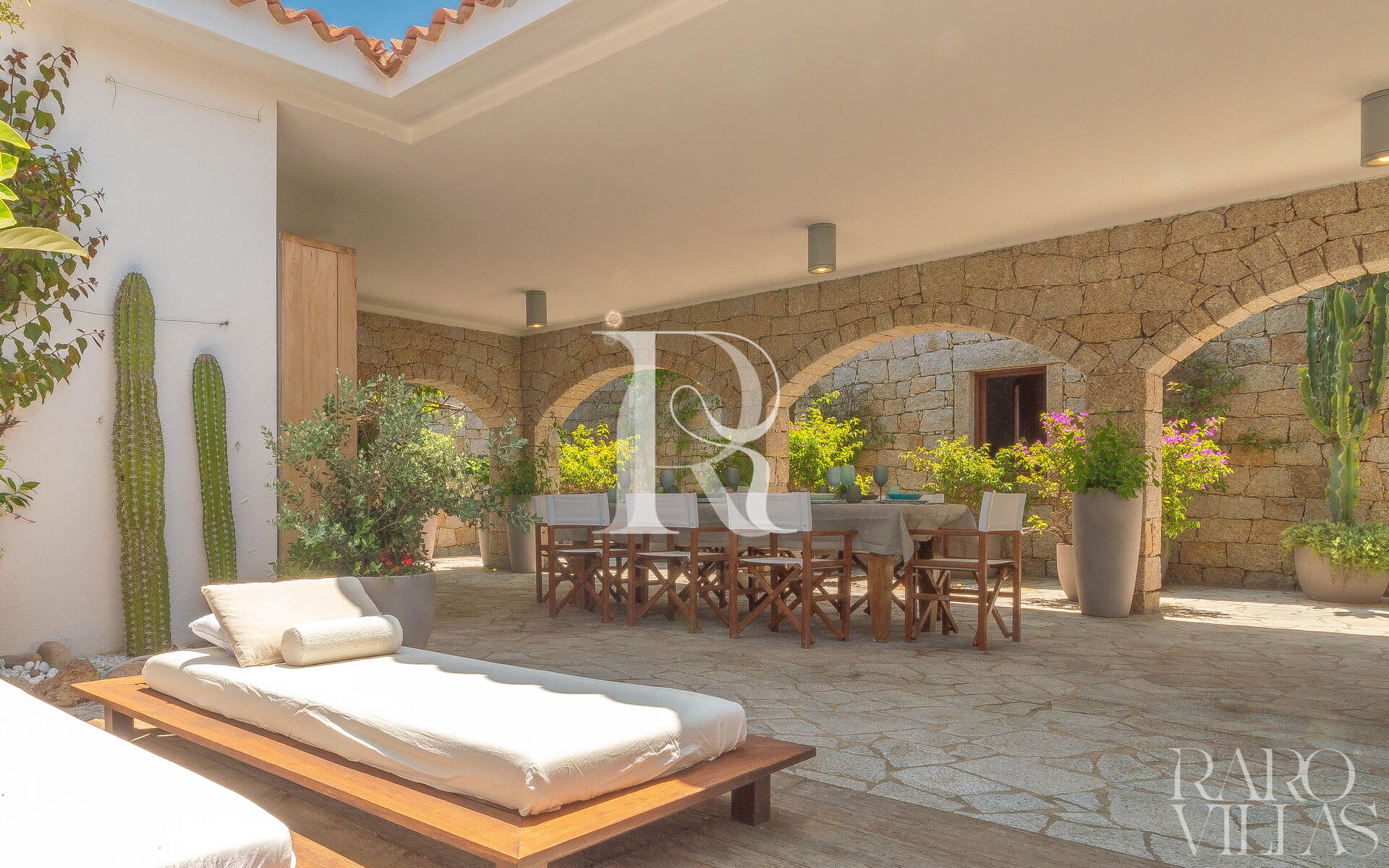 Immersed in the Mediterranean maquis and lapped by a turquoise sea, the villa offers outdoor spaces equipped as a large outdoor patio with sofas, sunbeds and dining area perfect for outdoor dining or for relaxing moments in the open air.