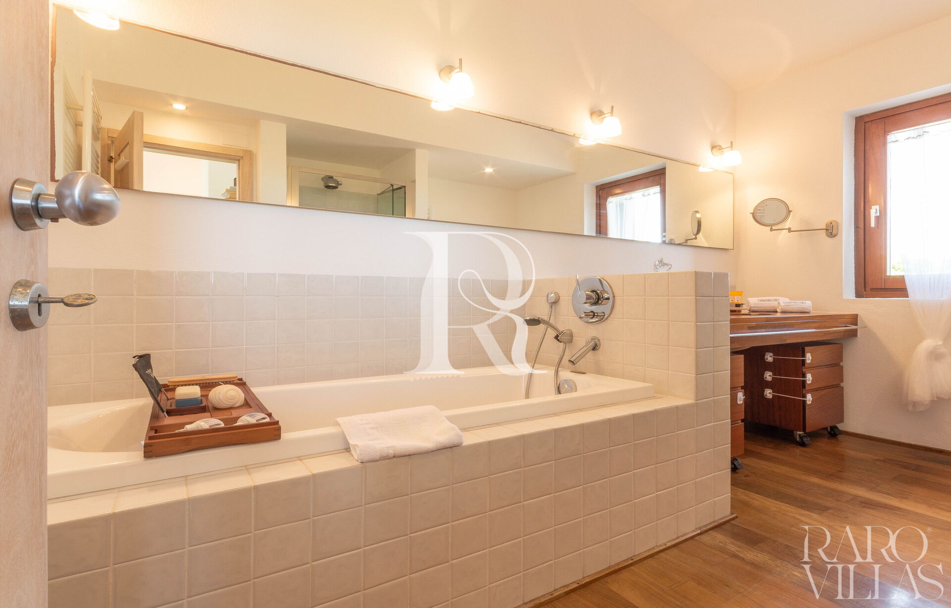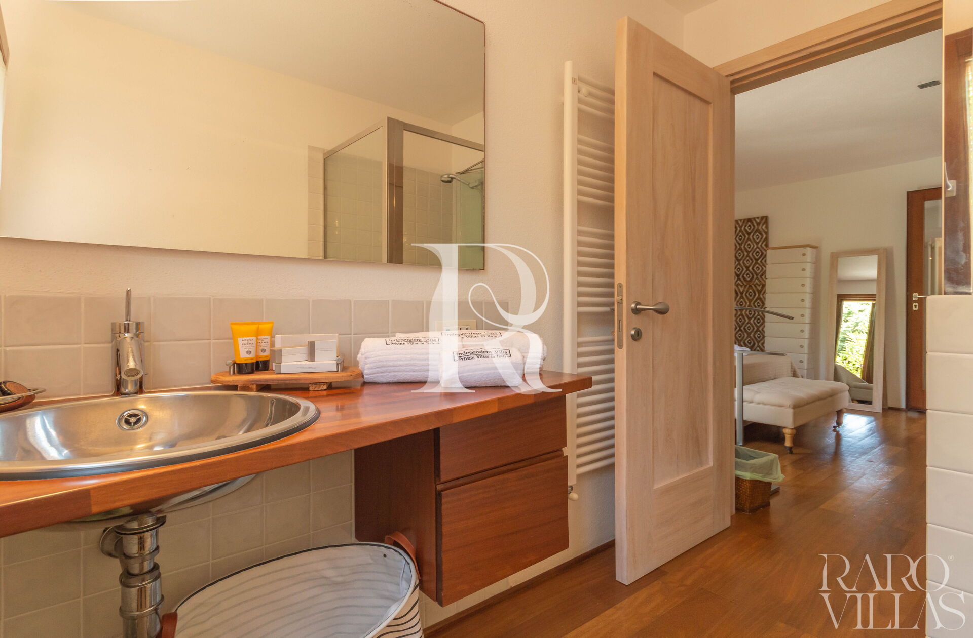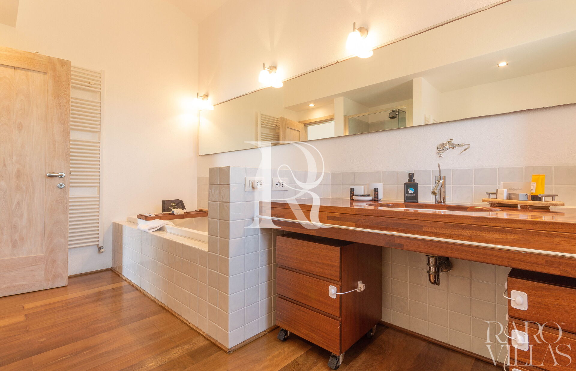 The sleeping area of the villa offers three double bedrooms, all air-conditioned, furnished with elegance and style for a comfortable and welcoming environment for a regenerating rest. The three full bathrooms, two in the room with shower and one with shower and bath are large and bright, ensuring maximum comfort and hygiene.