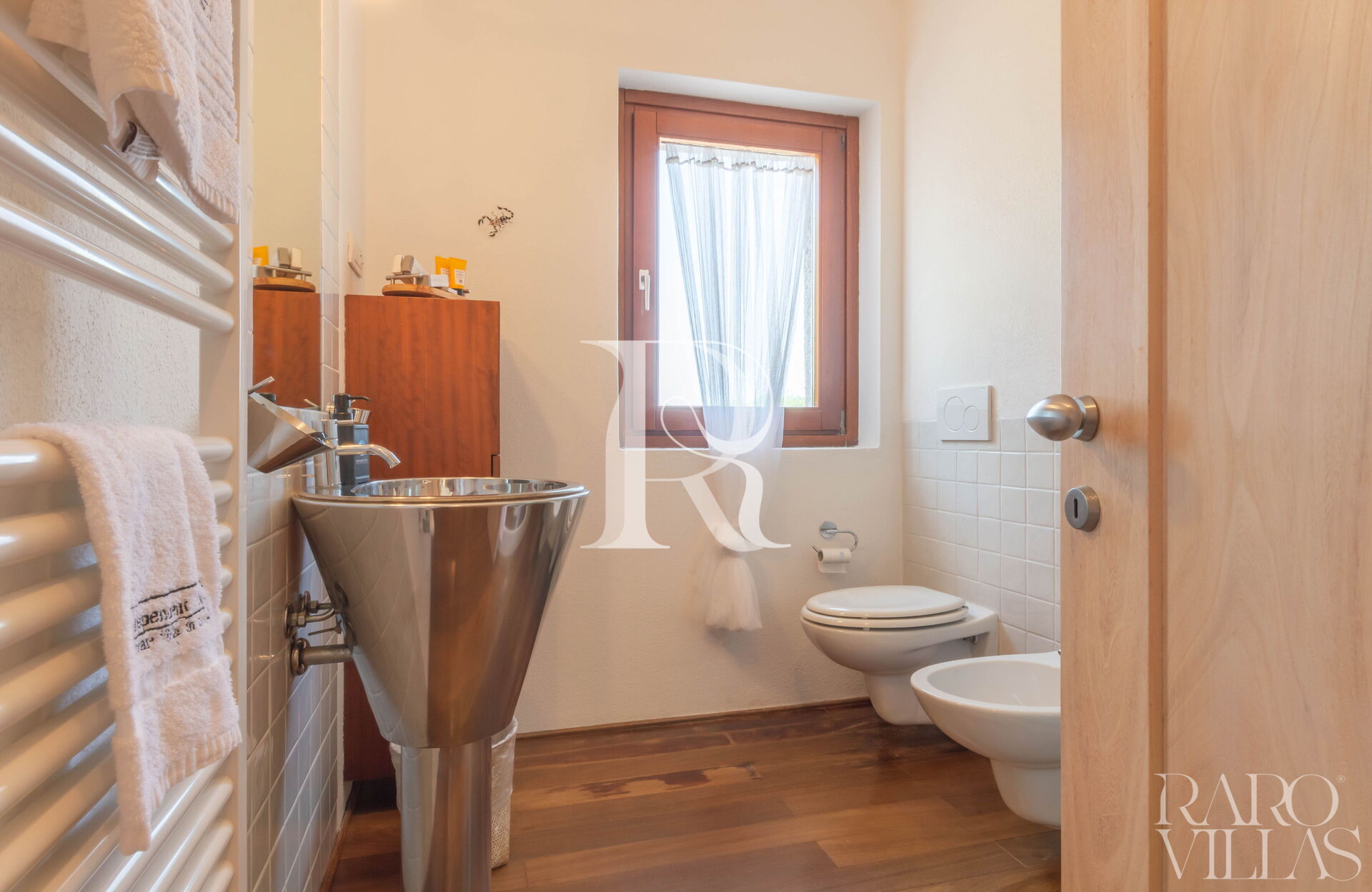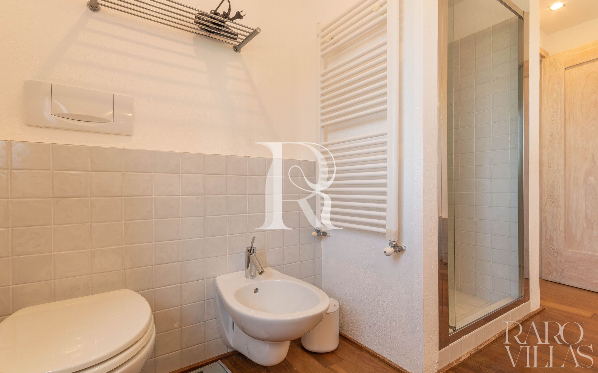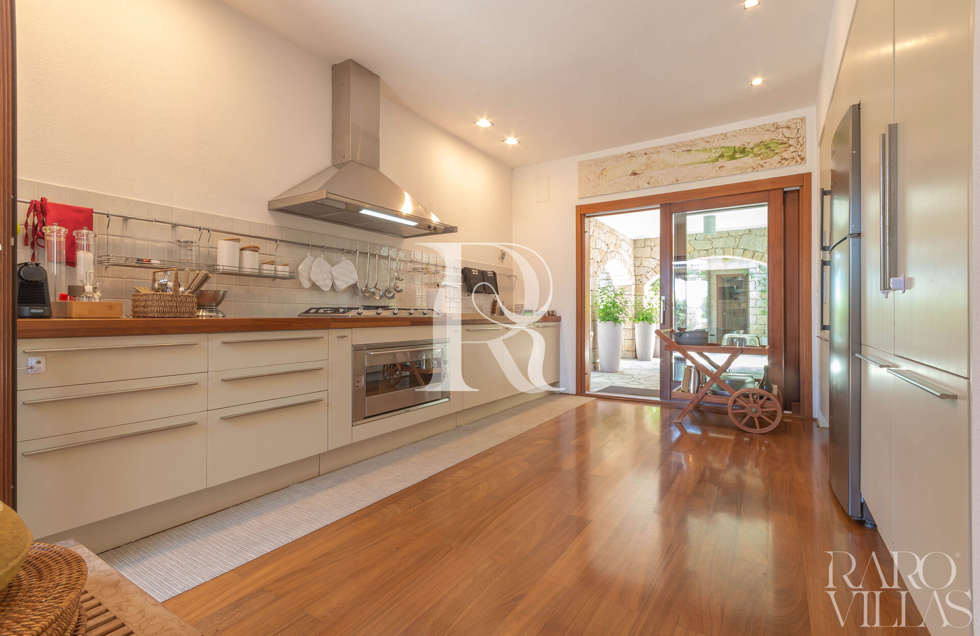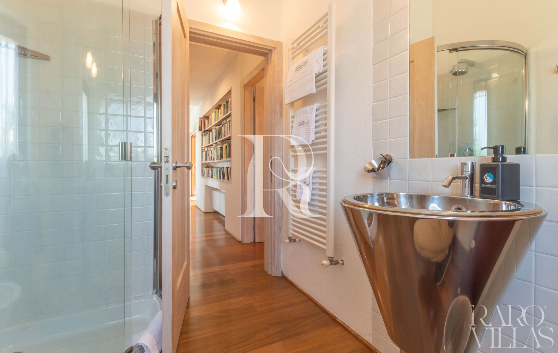 The sleeping area of the villa offers three double bedrooms, all air-conditioned, furnished with elegance and style for a comfortable and welcoming environment for a regenerating rest. The three full bathrooms, two in the room with shower and one with shower and bath are large and bright, ensuring maximum comfort and hygiene.