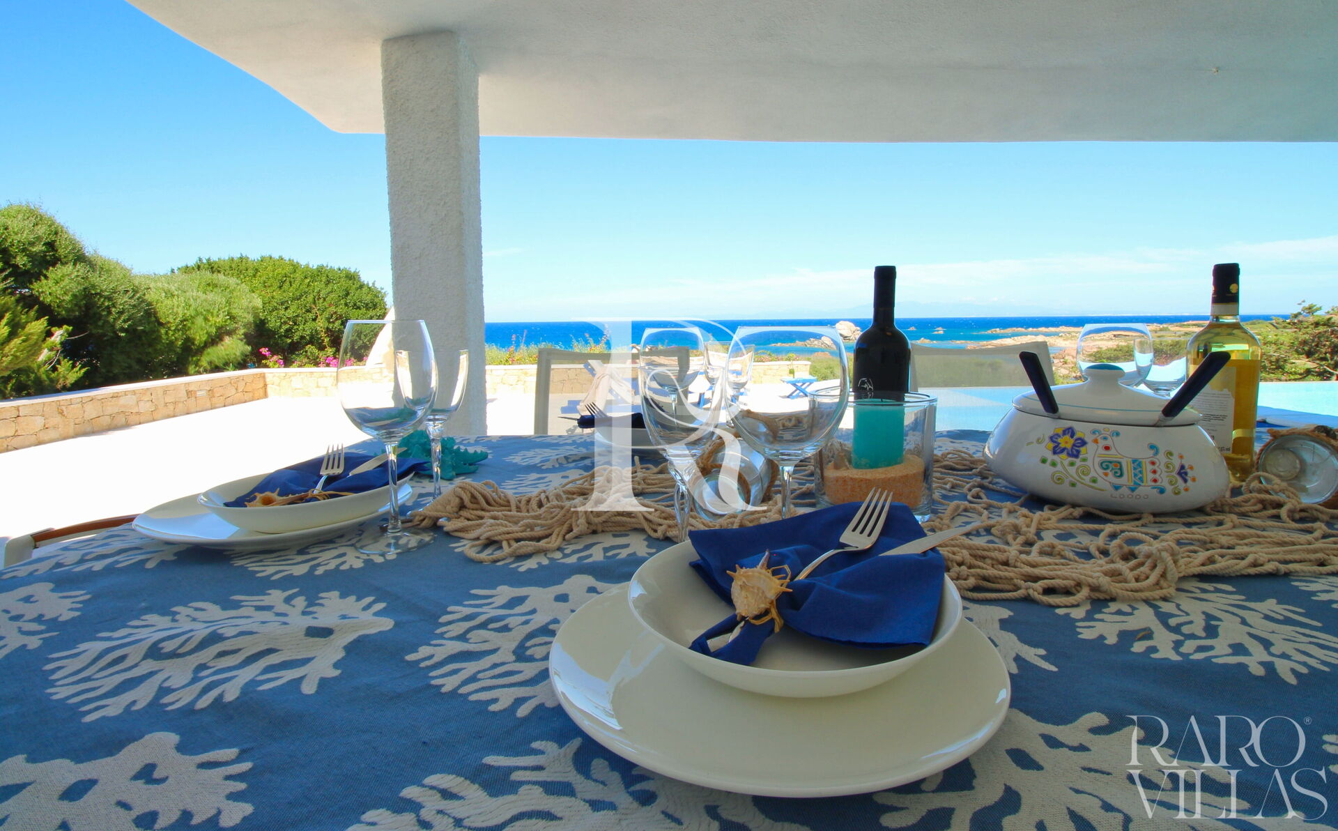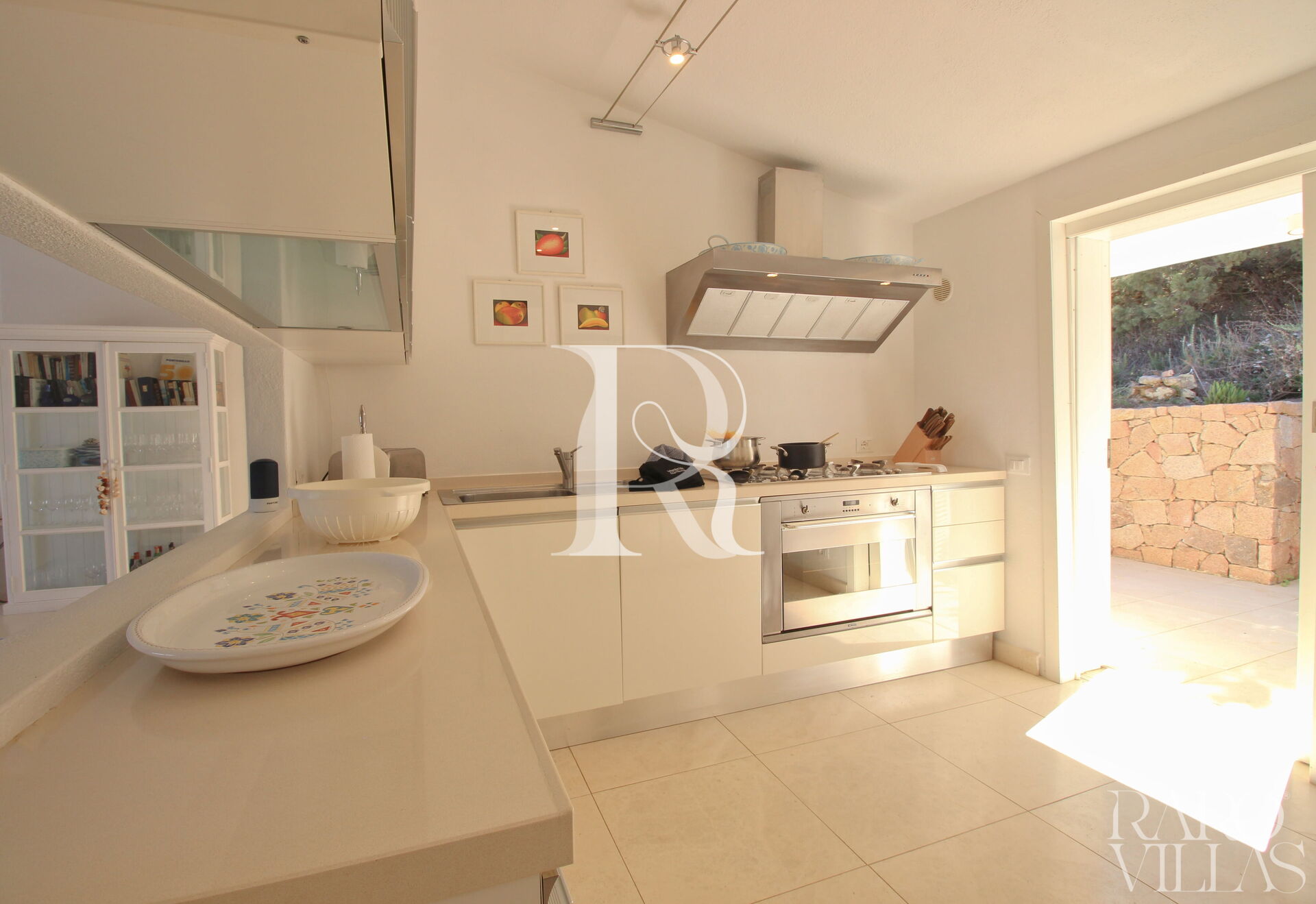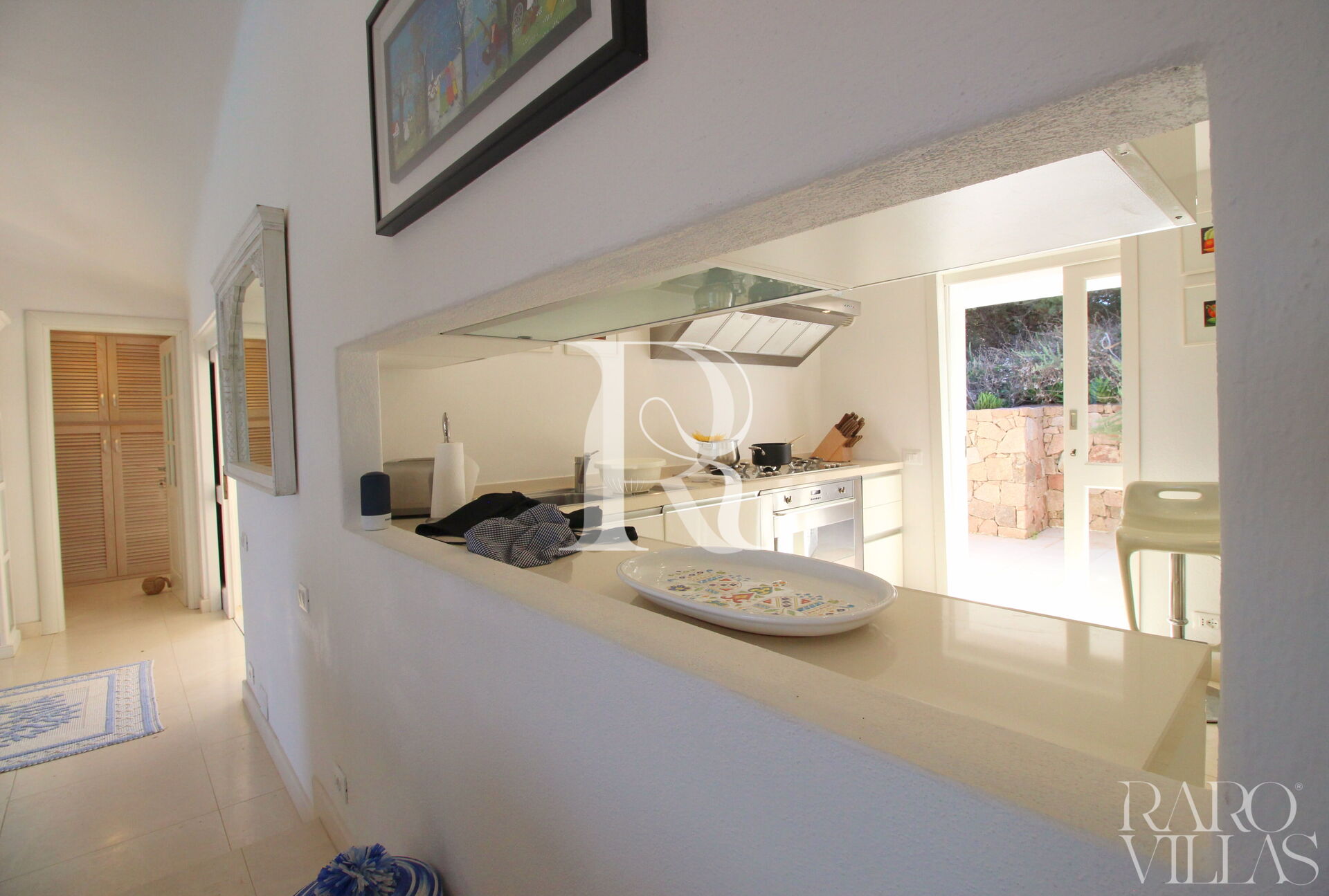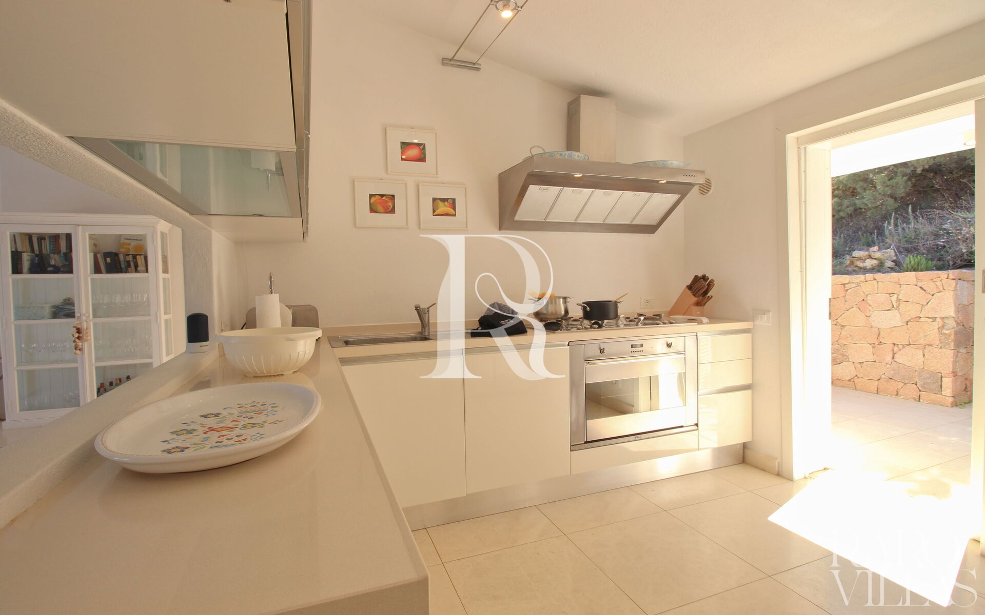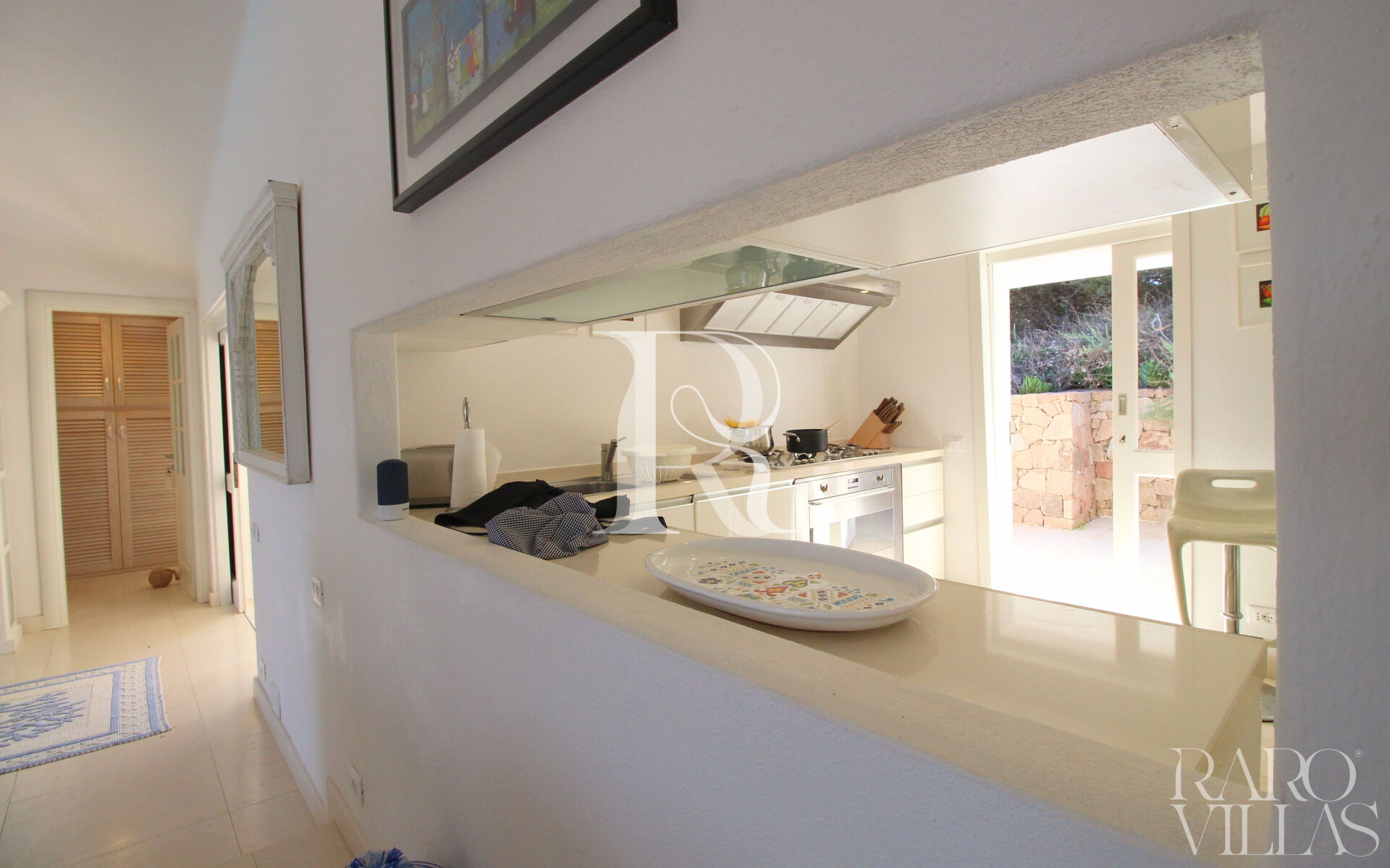 The interior of the villa offers a panoramic living area, bright thanks to the French window overlooking the sea, and tastefully furnished in Sardinian style, with attention to detail. In the left wing there is an open kitchen of modern design, complete with dishwasher, oven, fridge and professional 6-burner hob.