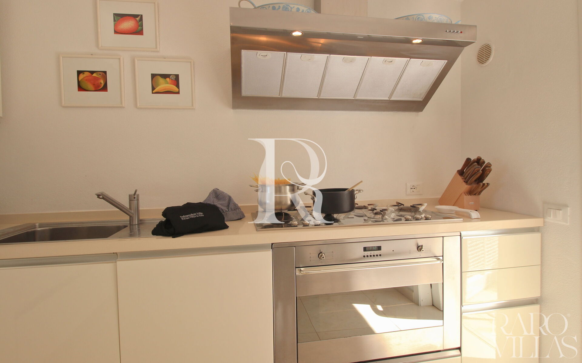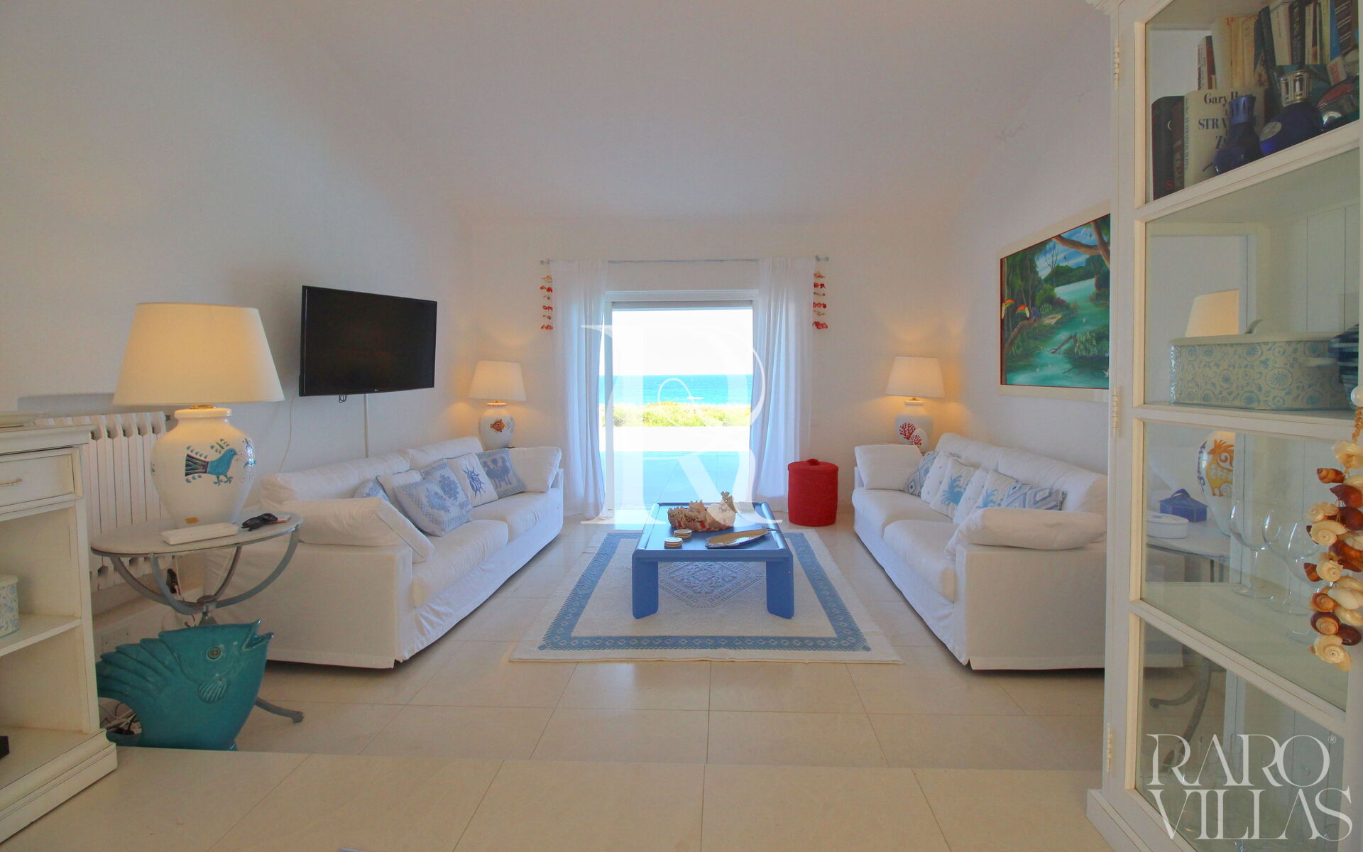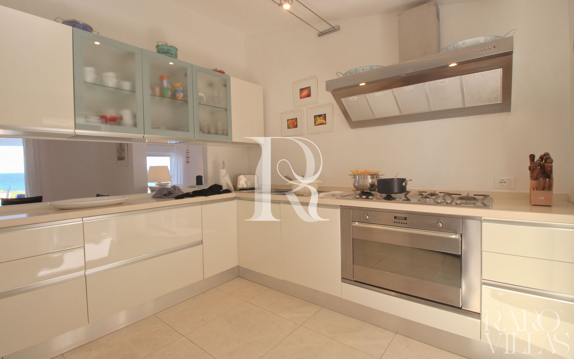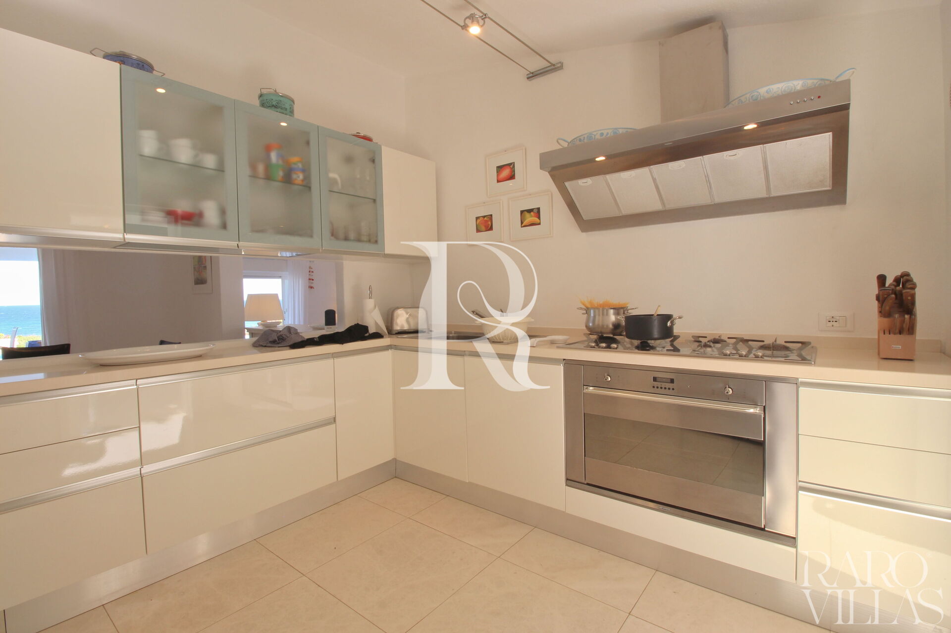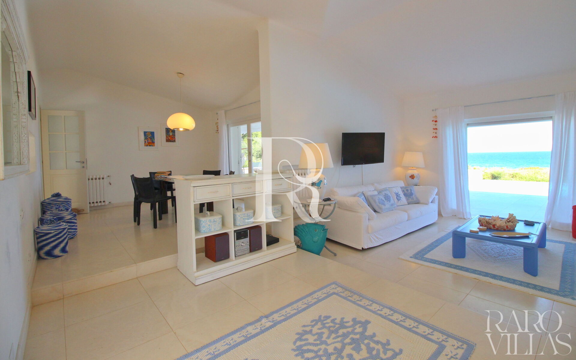 The interior of the villa offers a panoramic living area, bright thanks to the French window overlooking the sea, and tastefully furnished in Sardinian style, with attention to detail. In the left wing there is an open kitchen of modern design, complete with dishwasher, oven, fridge and professional 6-burner hob.