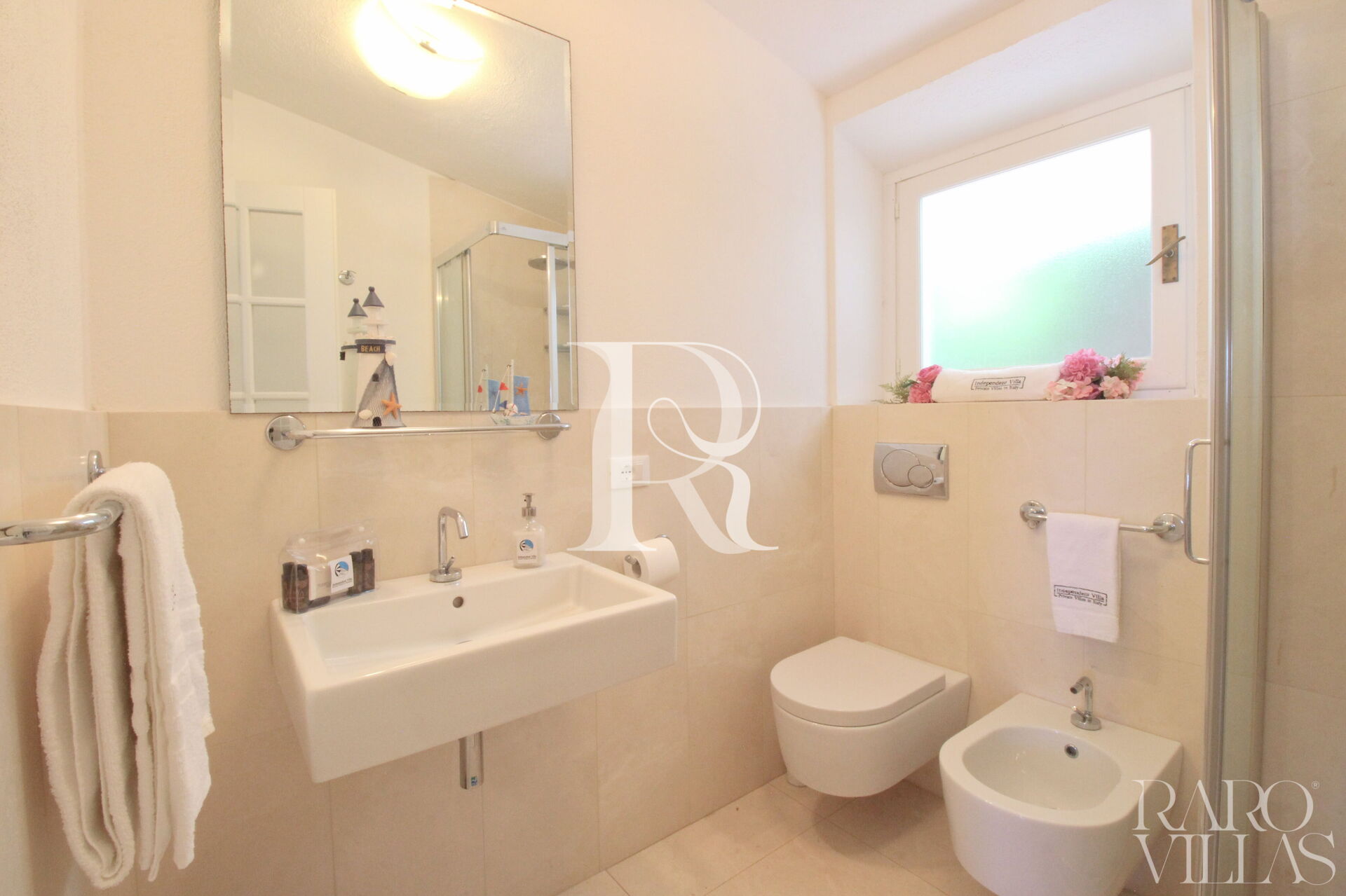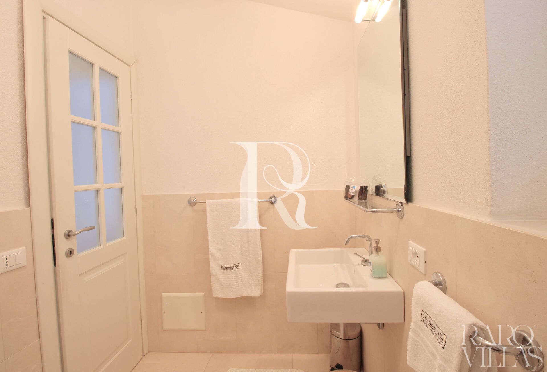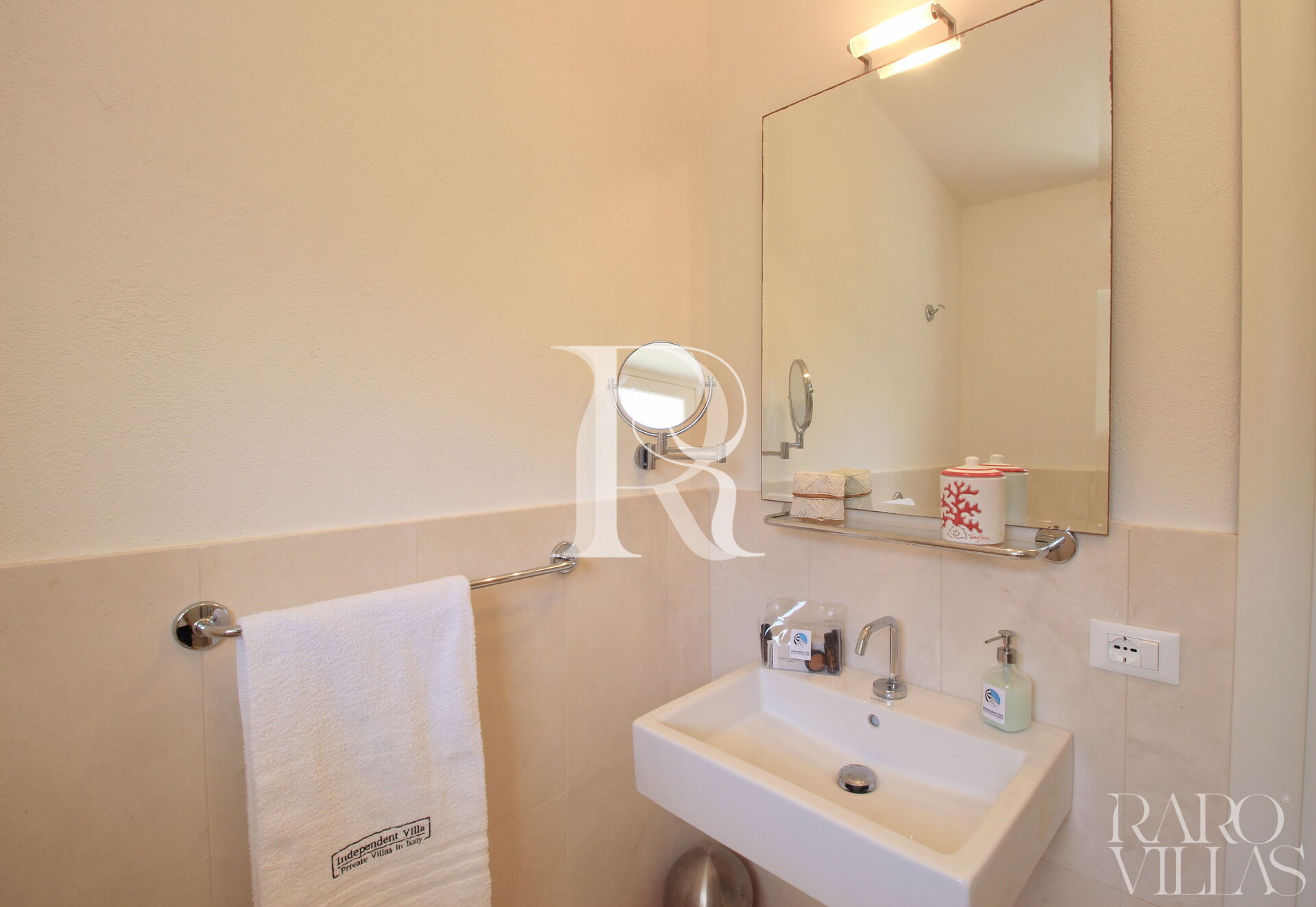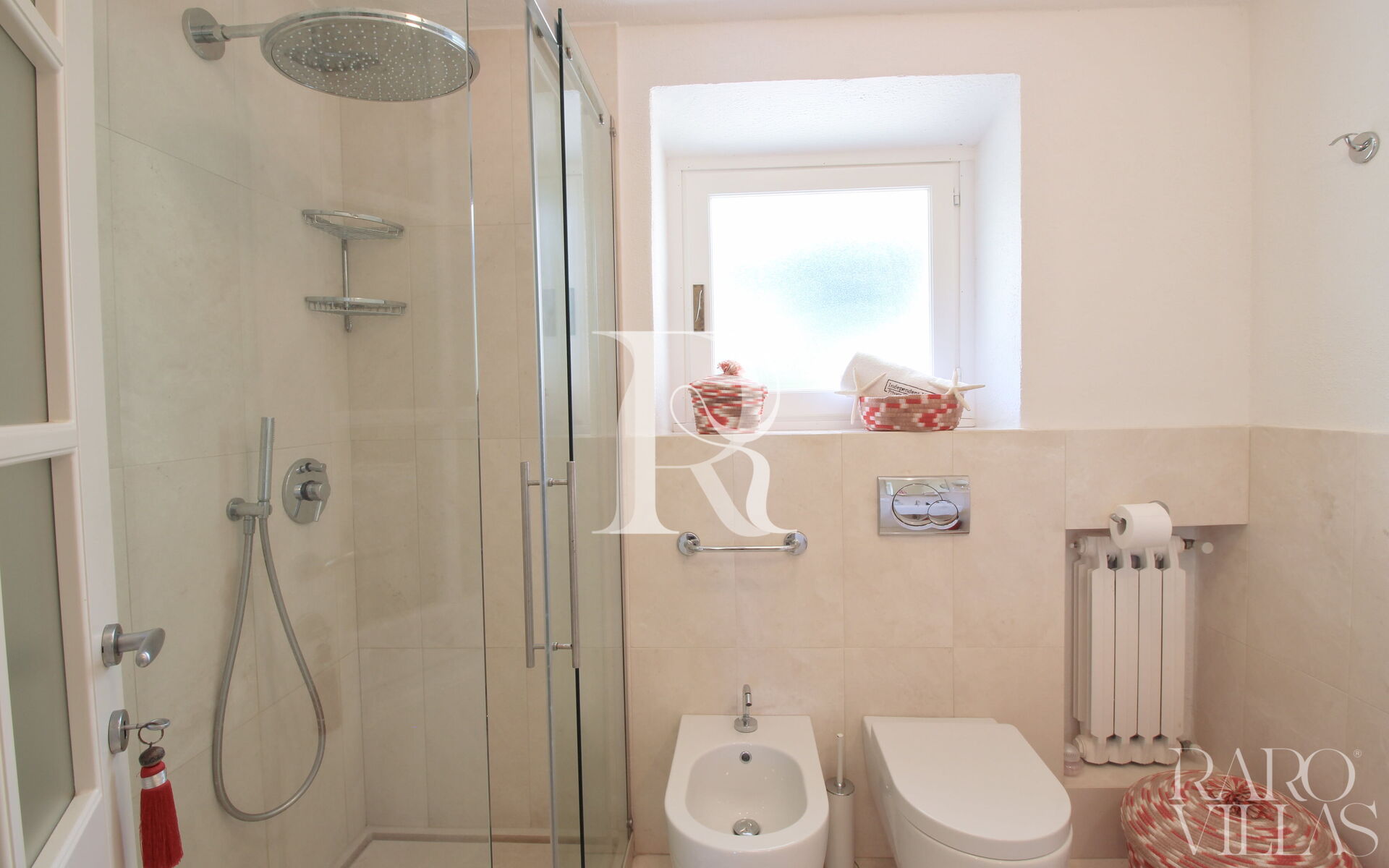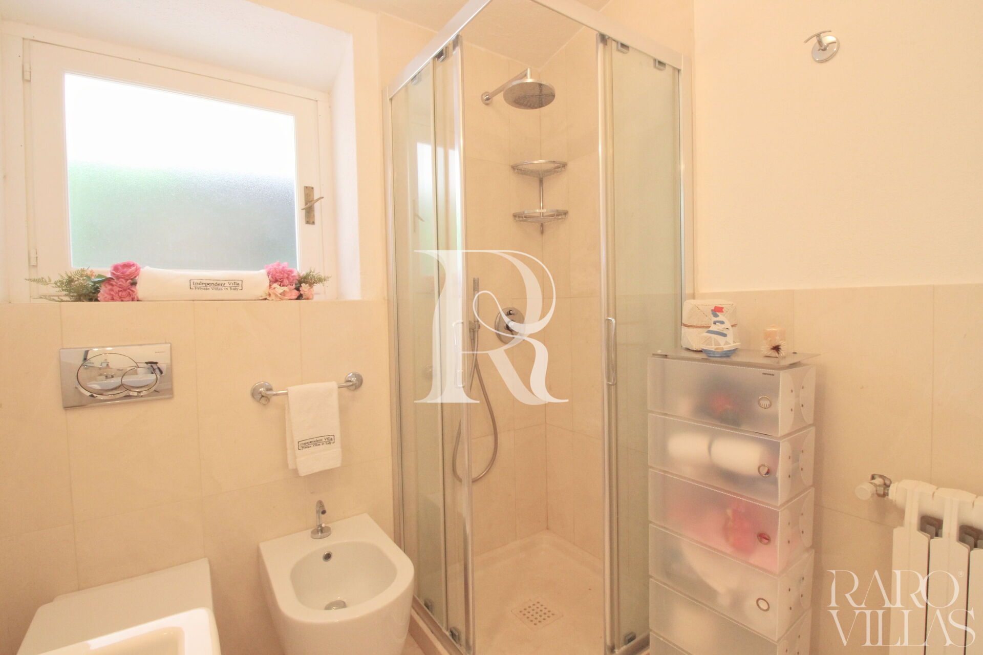 On the right, there are two further bedrooms, one double and one twin, both overlooking the pool, and two bathrooms with shower. In the basement, there is a room with twin beds convertible into a double bed, air conditioning and a bathroom with shower. The laundry, equipped with a washing machine, is located in another basement of the villa.