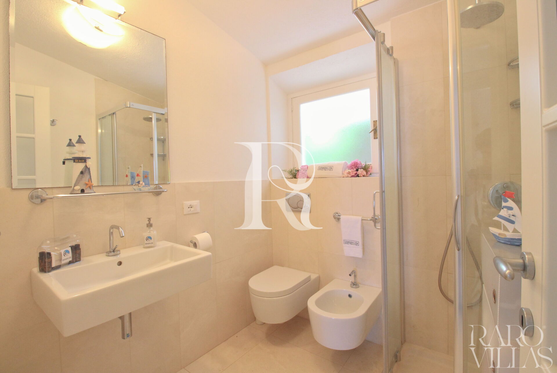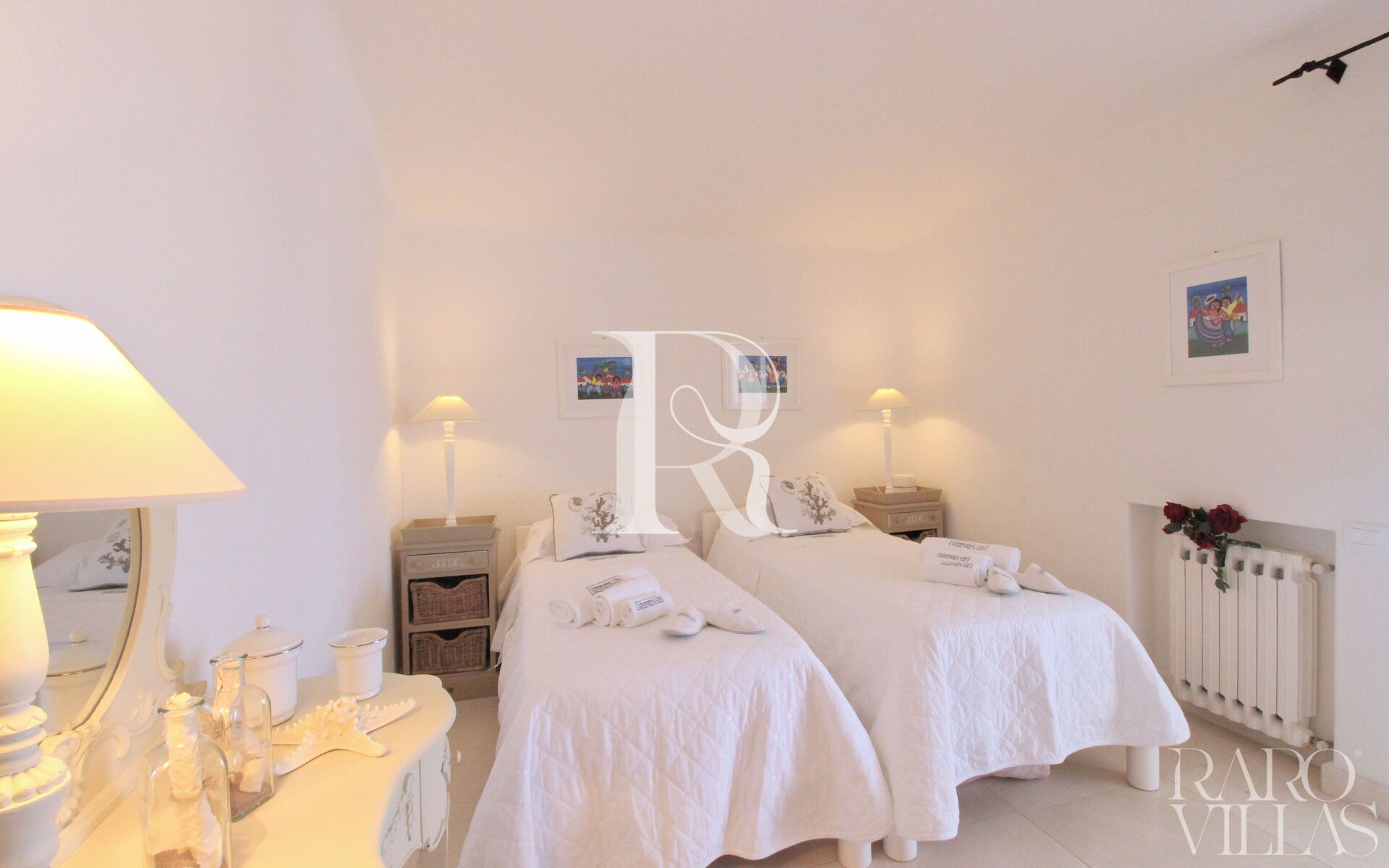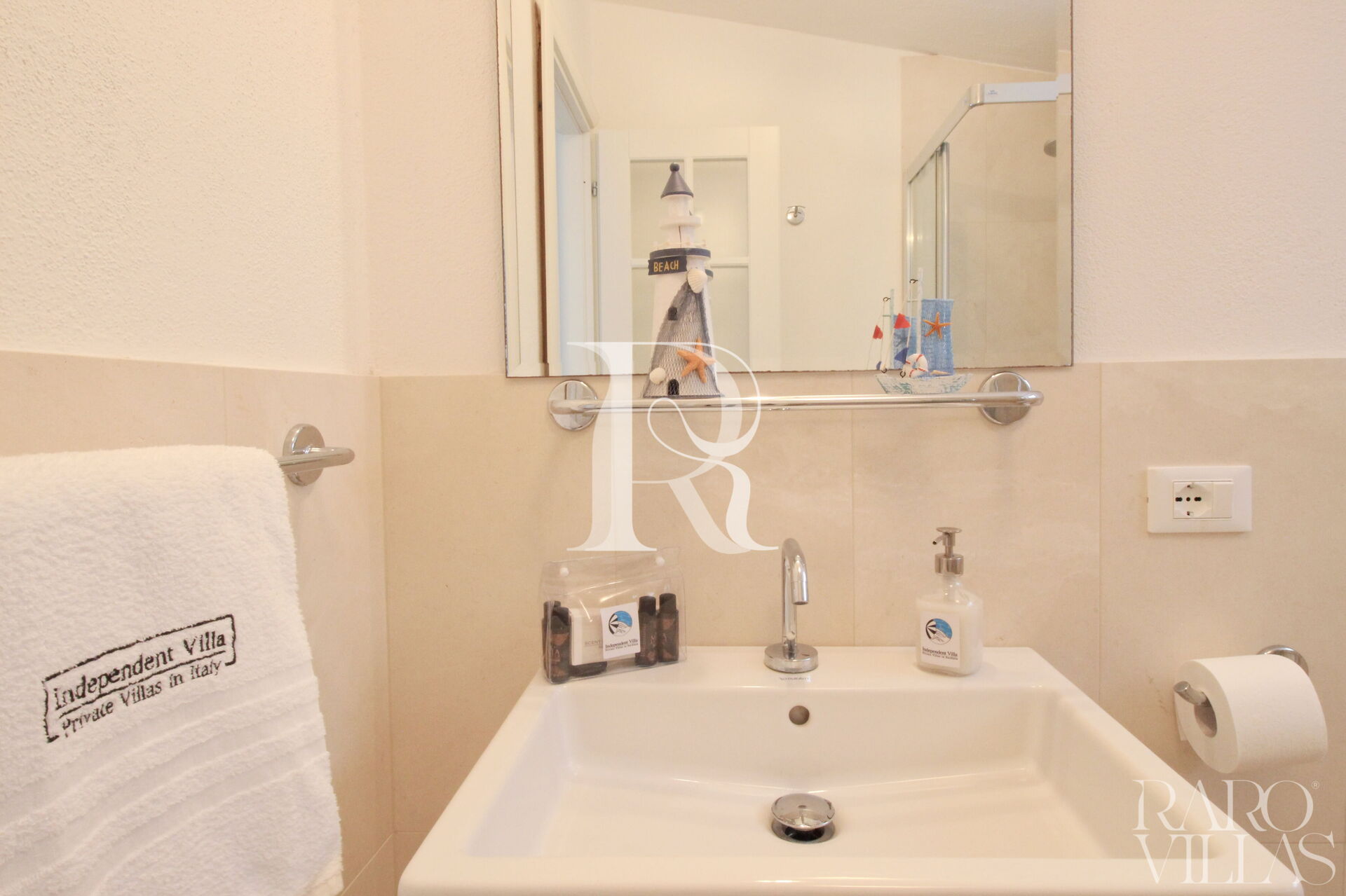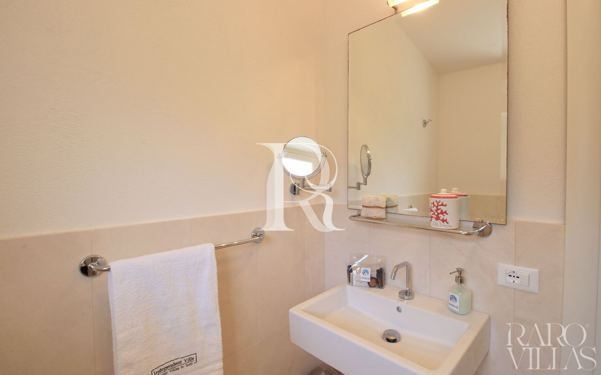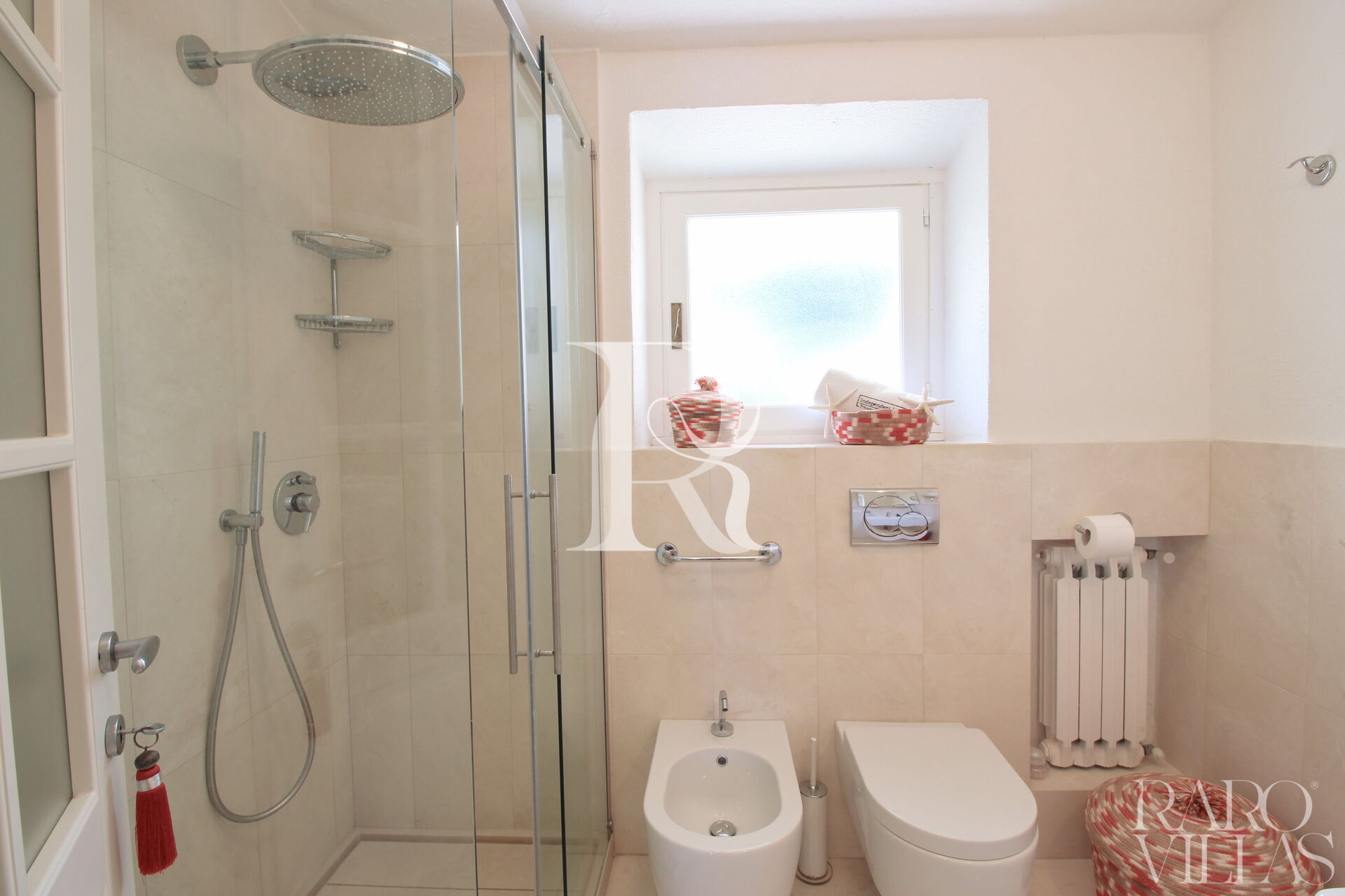 On the right, there are two further bedrooms, one double and one twin, both overlooking the pool, and two bathrooms with shower. In the basement, there is a room with twin beds convertible into a double bed, air conditioning and a bathroom with shower. The laundry, equipped with a washing machine, is located in another basement of the villa.