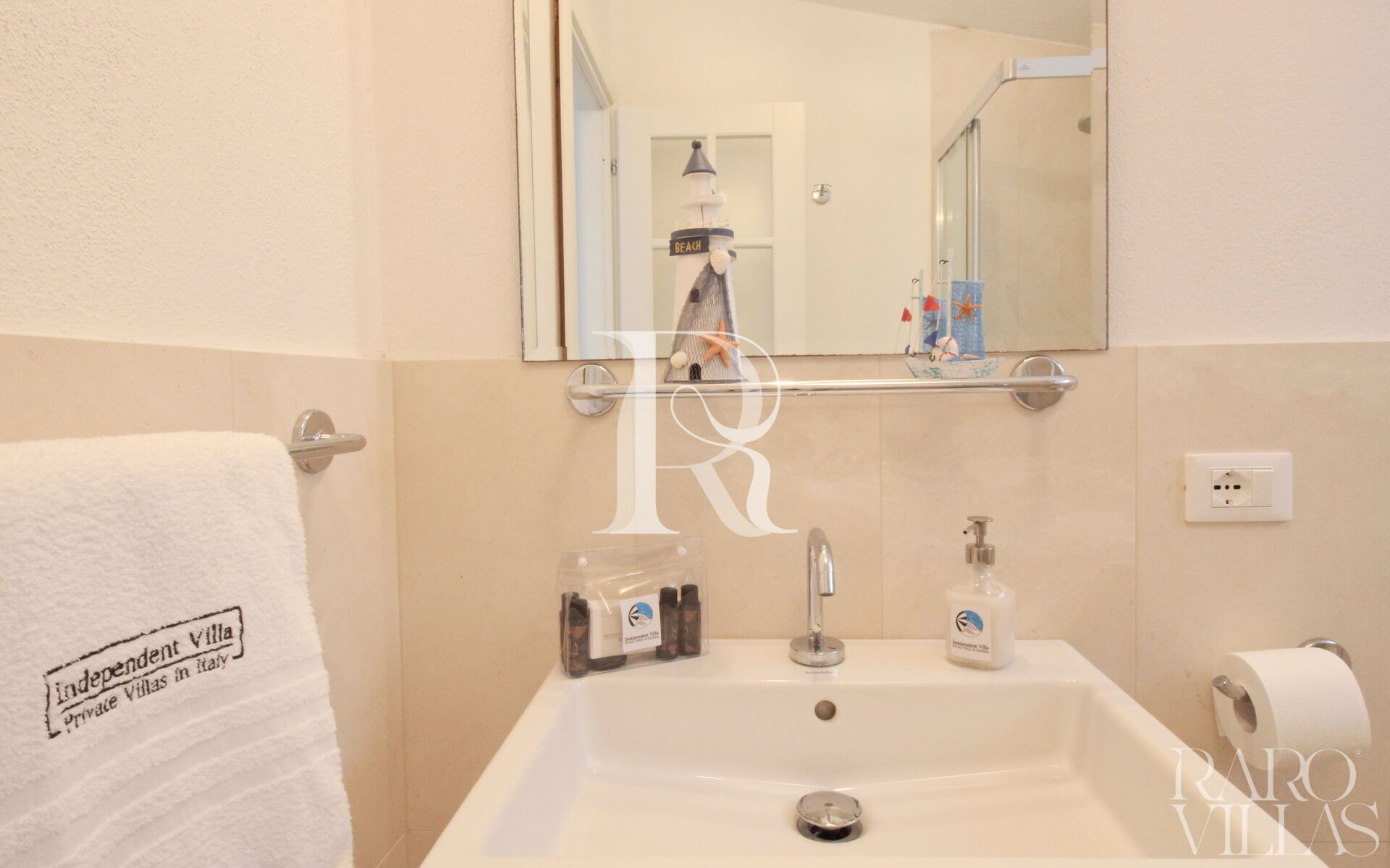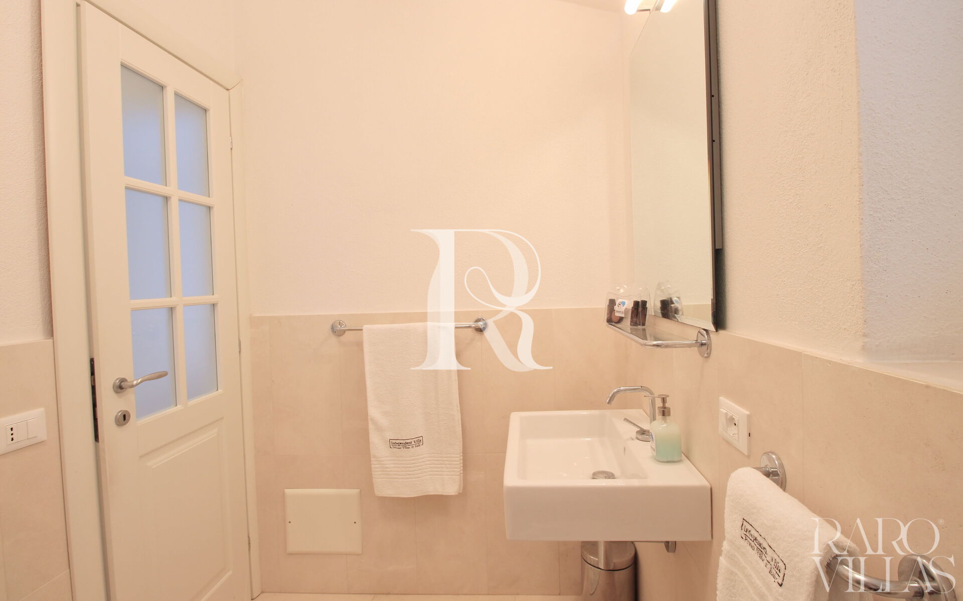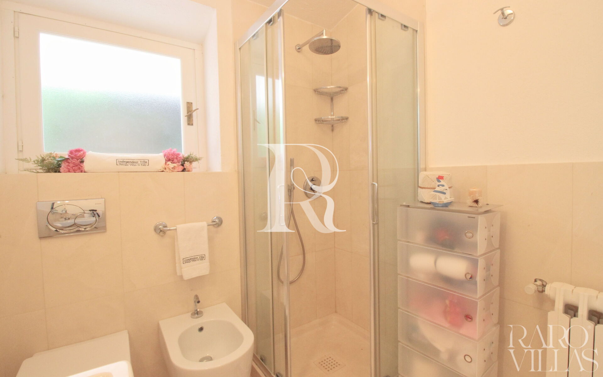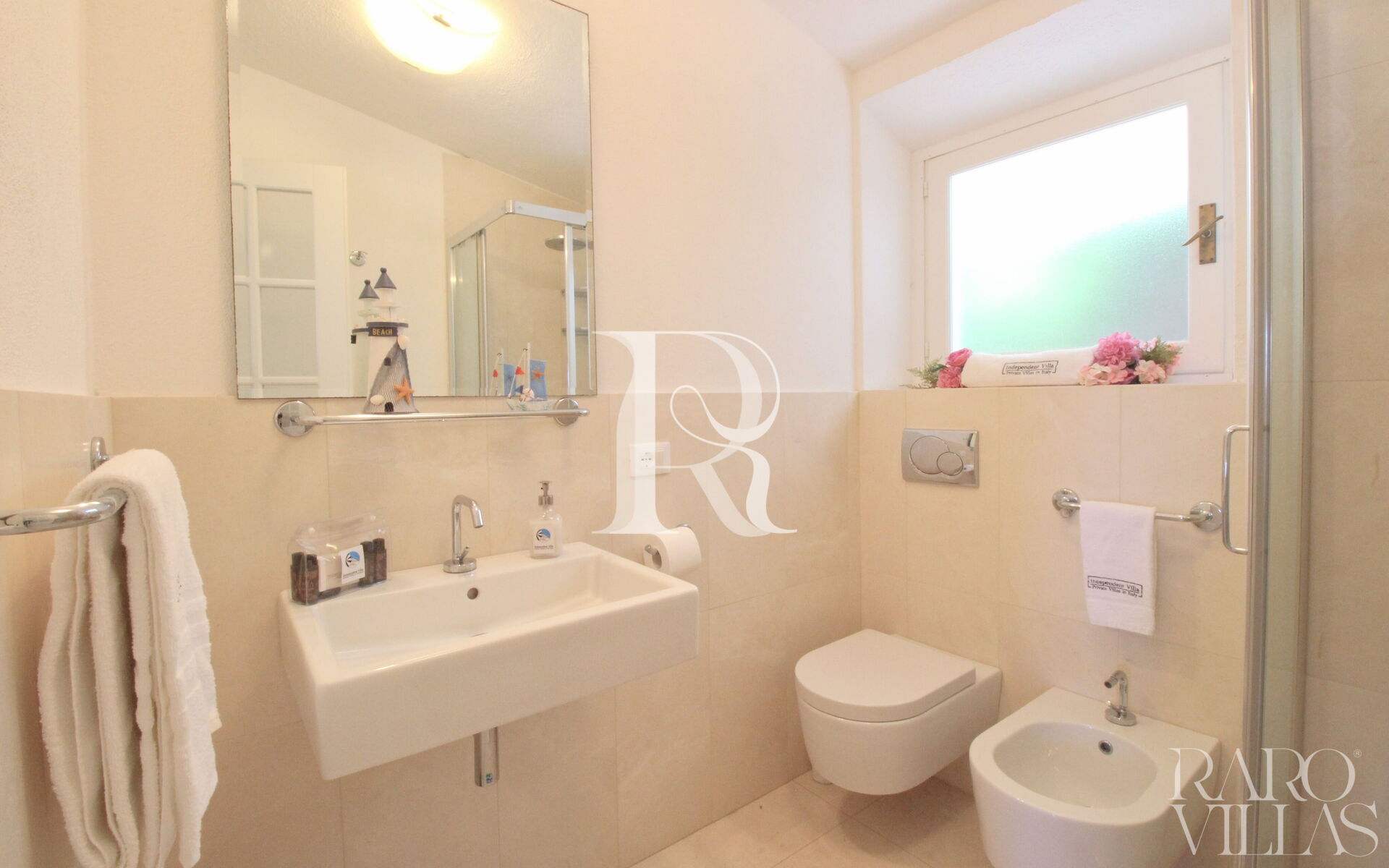On the right, there are two further bedrooms, one double and one twin, both overlooking the pool, and two bathrooms with shower. In the basement, there is a room with twin beds convertible into a double bed, air conditioning and a bathroom with shower. The laundry, equipped with a washing machine, is located in another basement of the villa.
