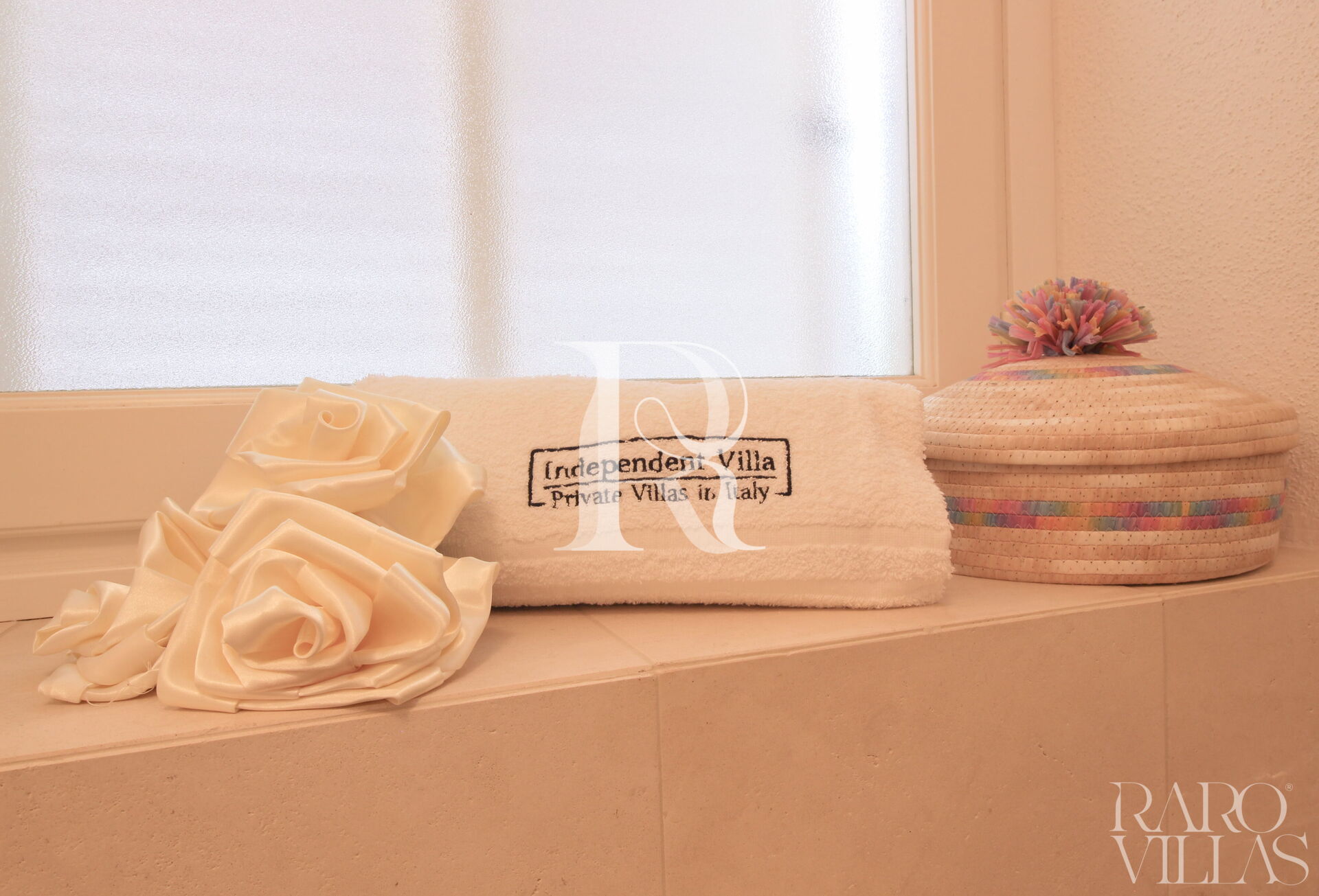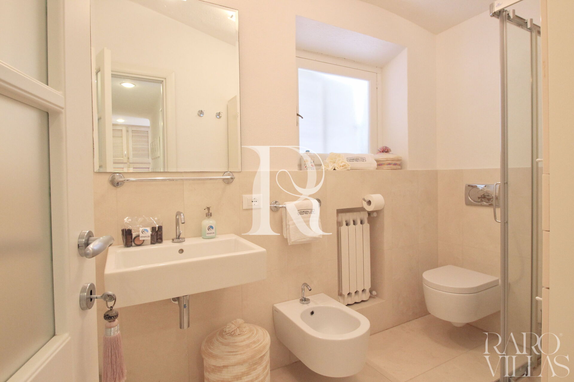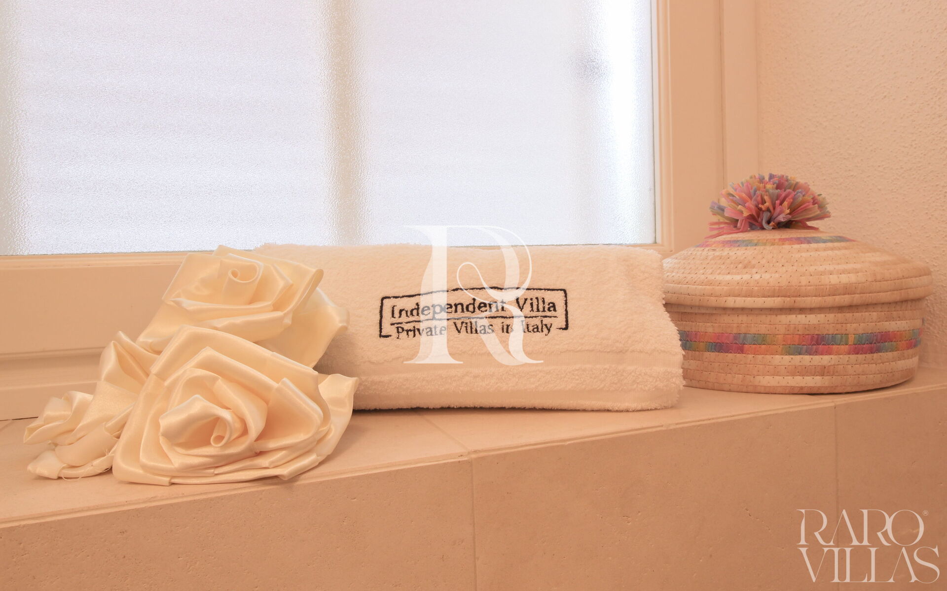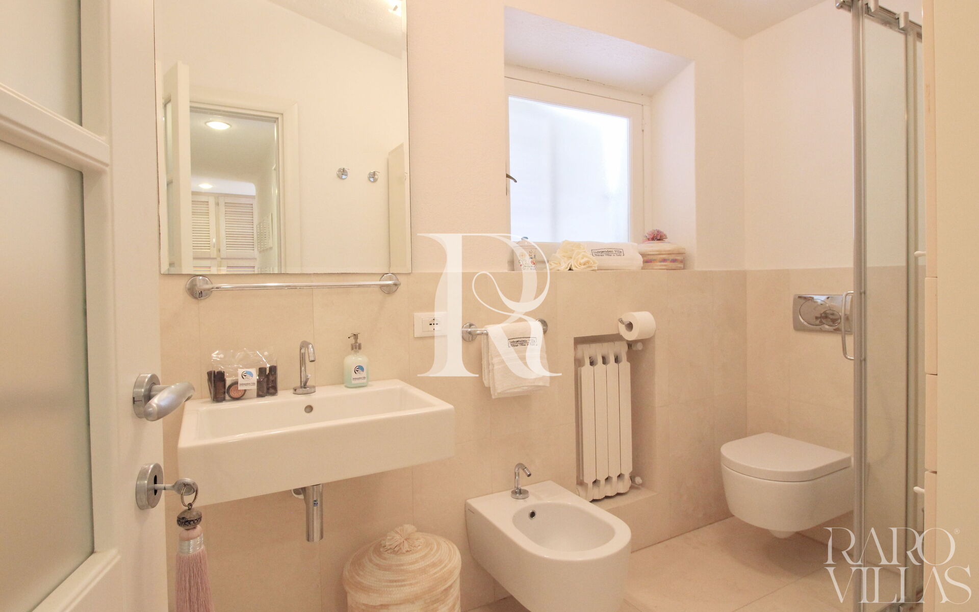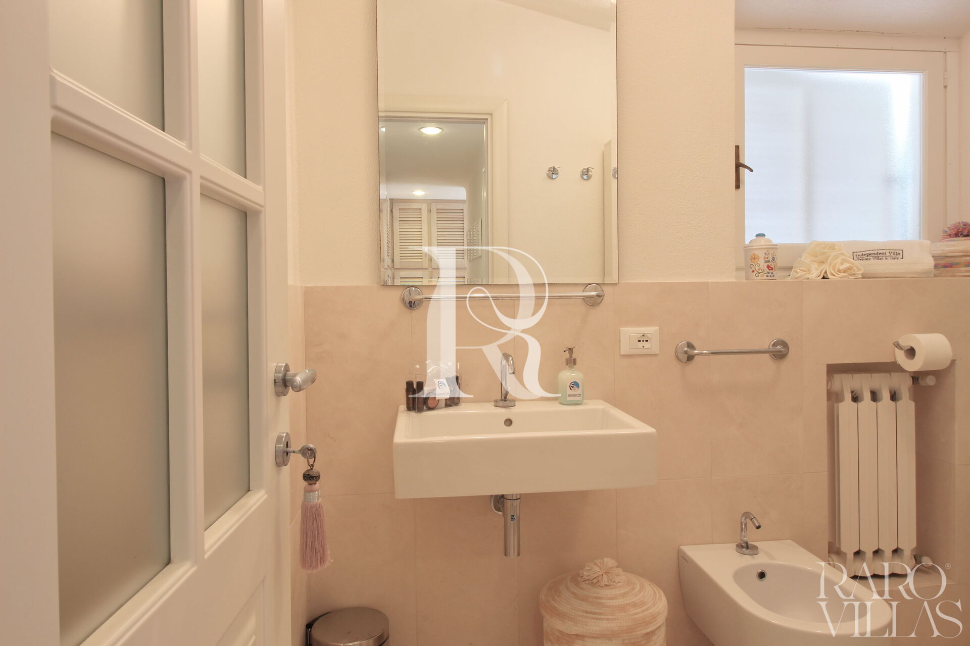 On the right, there are two further bedrooms, one double and one twin, both overlooking the pool, and two bathrooms with shower. In the basement, there is a room with twin beds convertible into a double bed, air conditioning and a bathroom with shower. The laundry, equipped with a washing machine, is located in another basement of the villa.