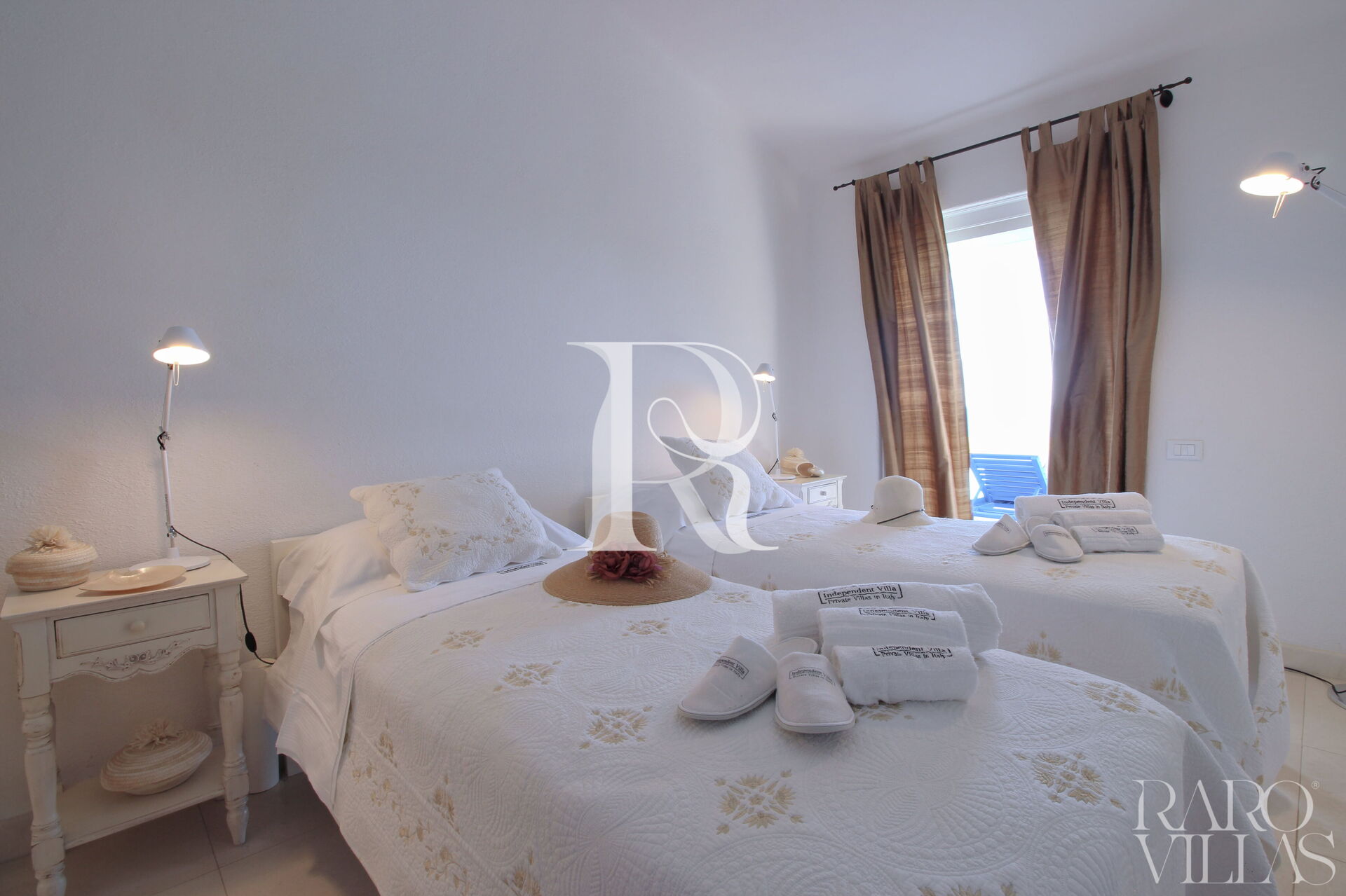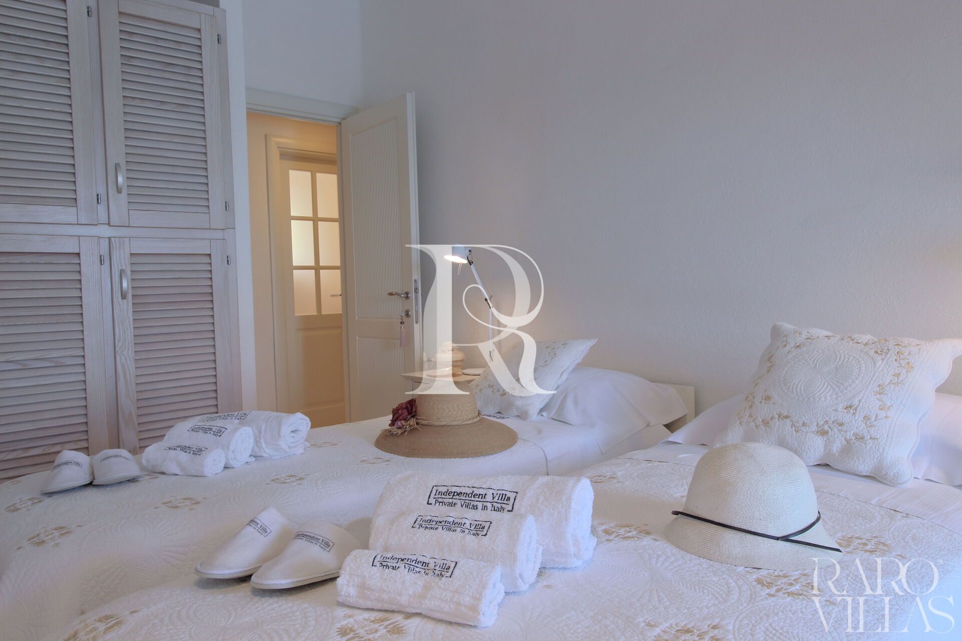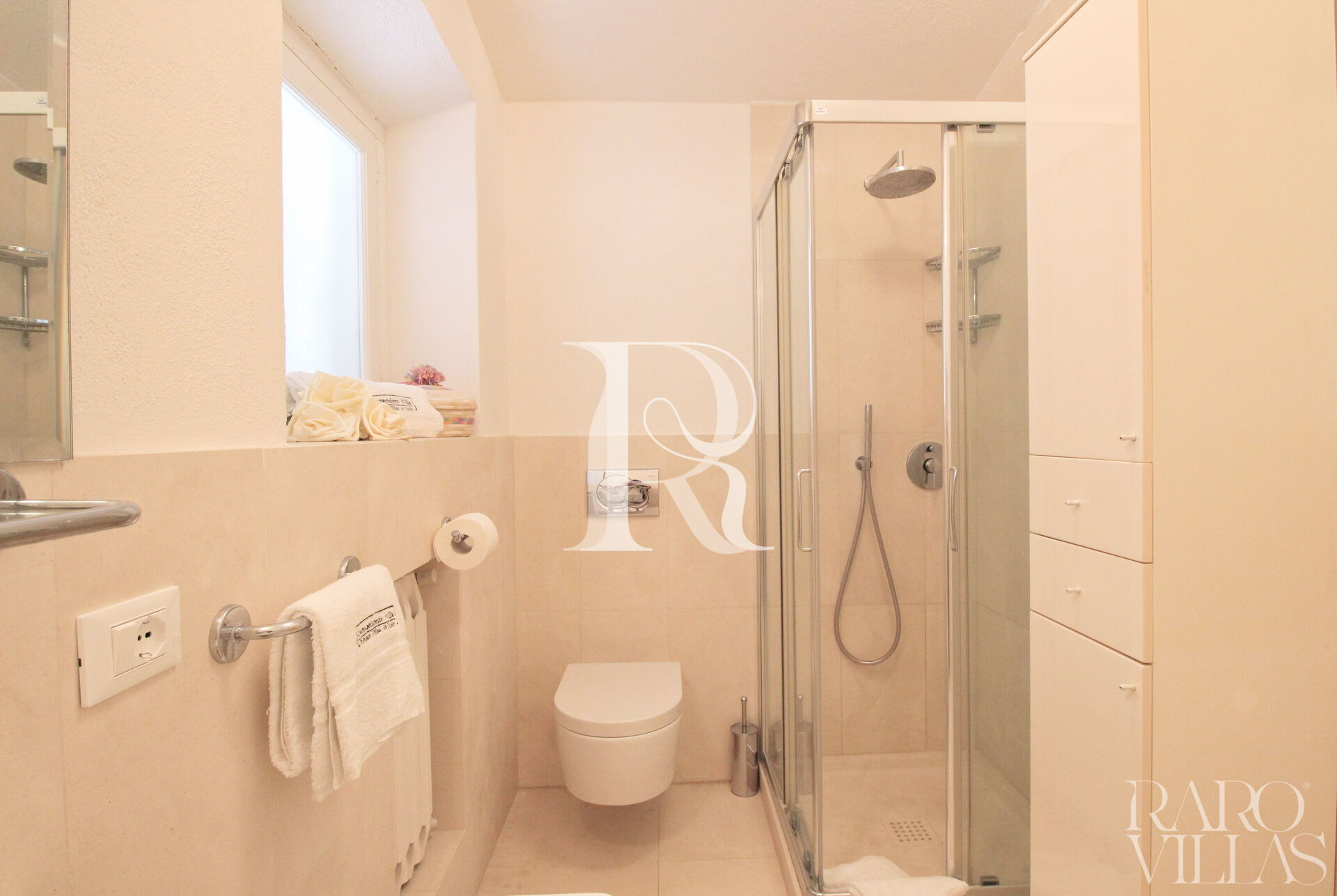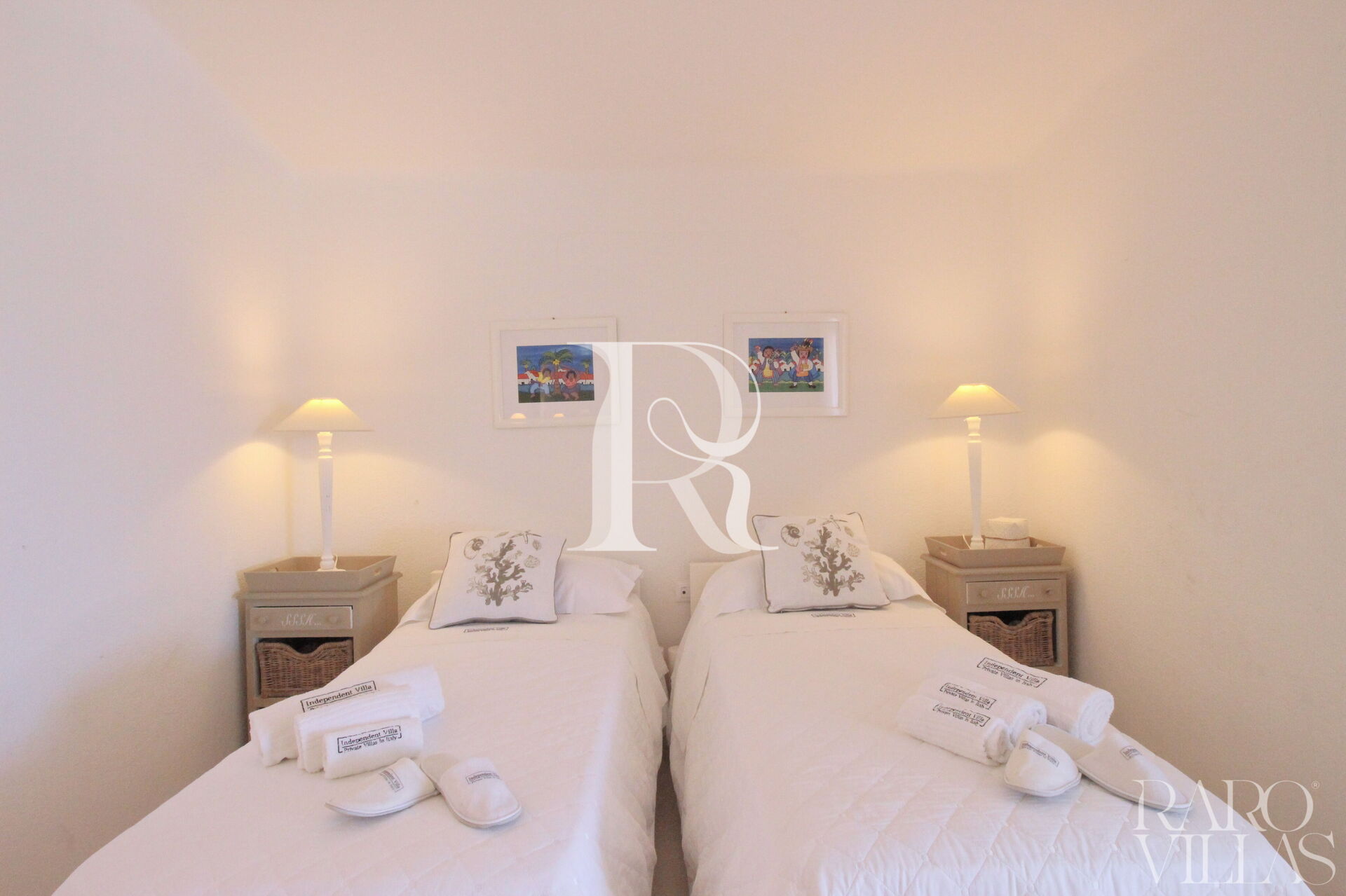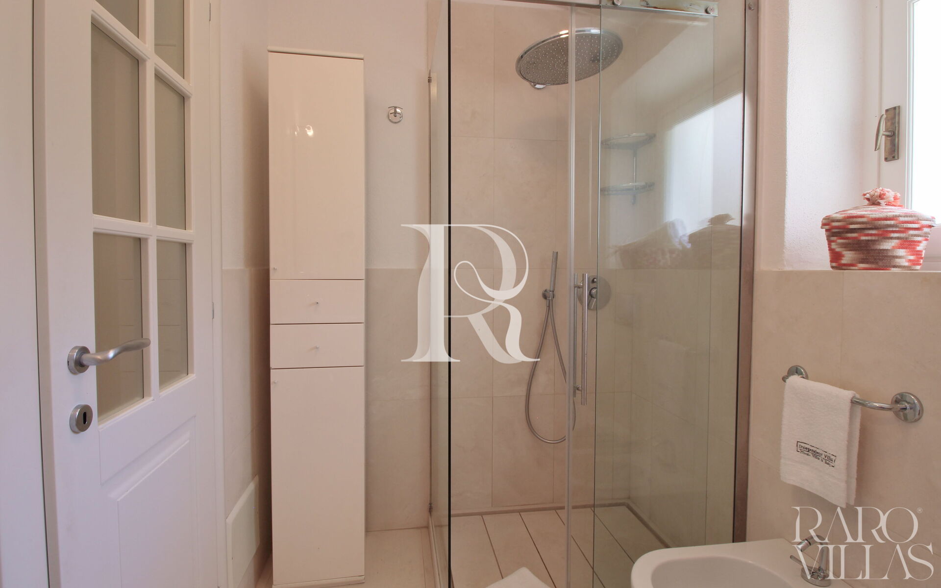On the right, there are two further bedrooms, one double and one twin, both overlooking the pool, and two bathrooms with shower. In the basement, there is a room with twin beds convertible into a double bed, air conditioning and a bathroom with shower. The laundry, equipped with a washing machine, is located in another basement of the villa.