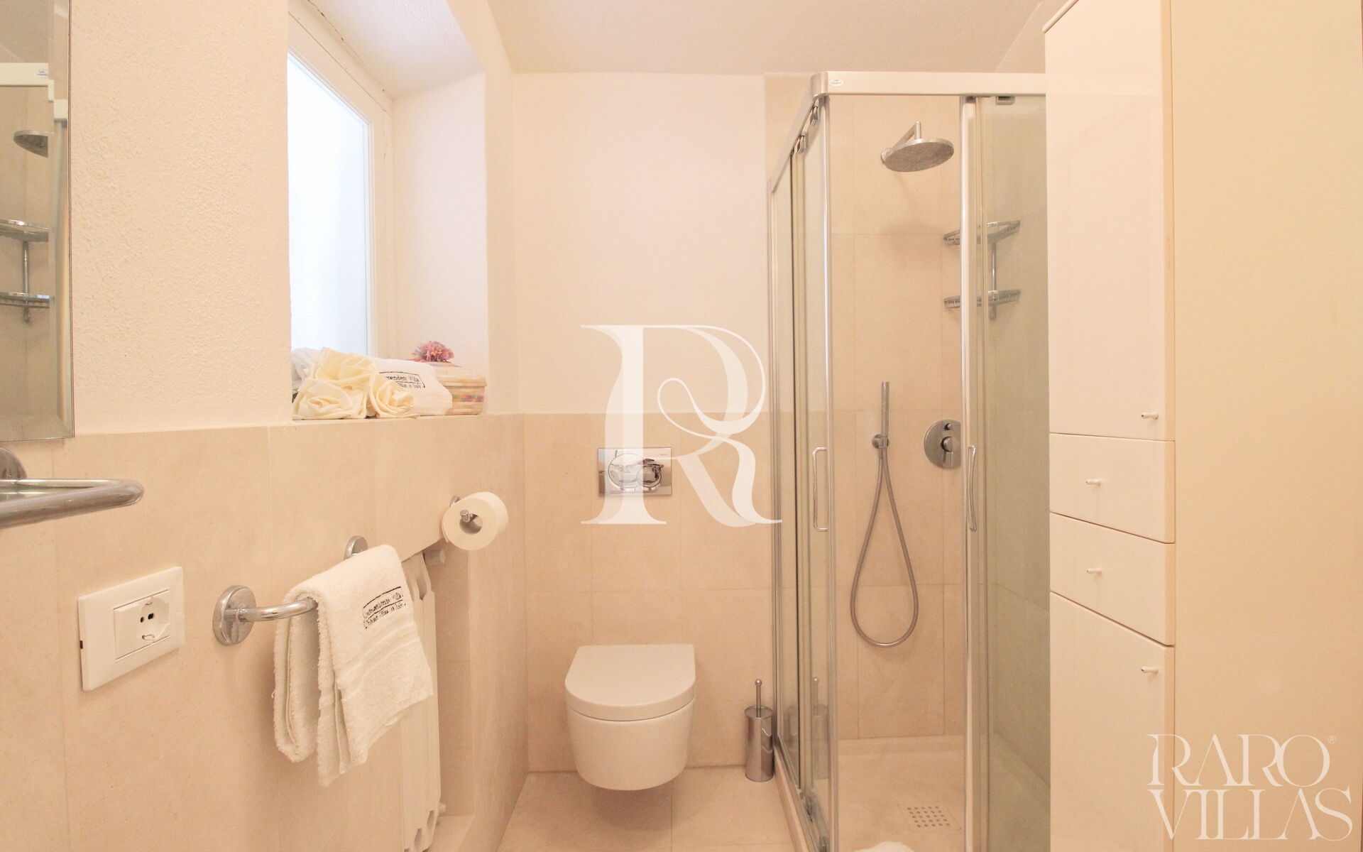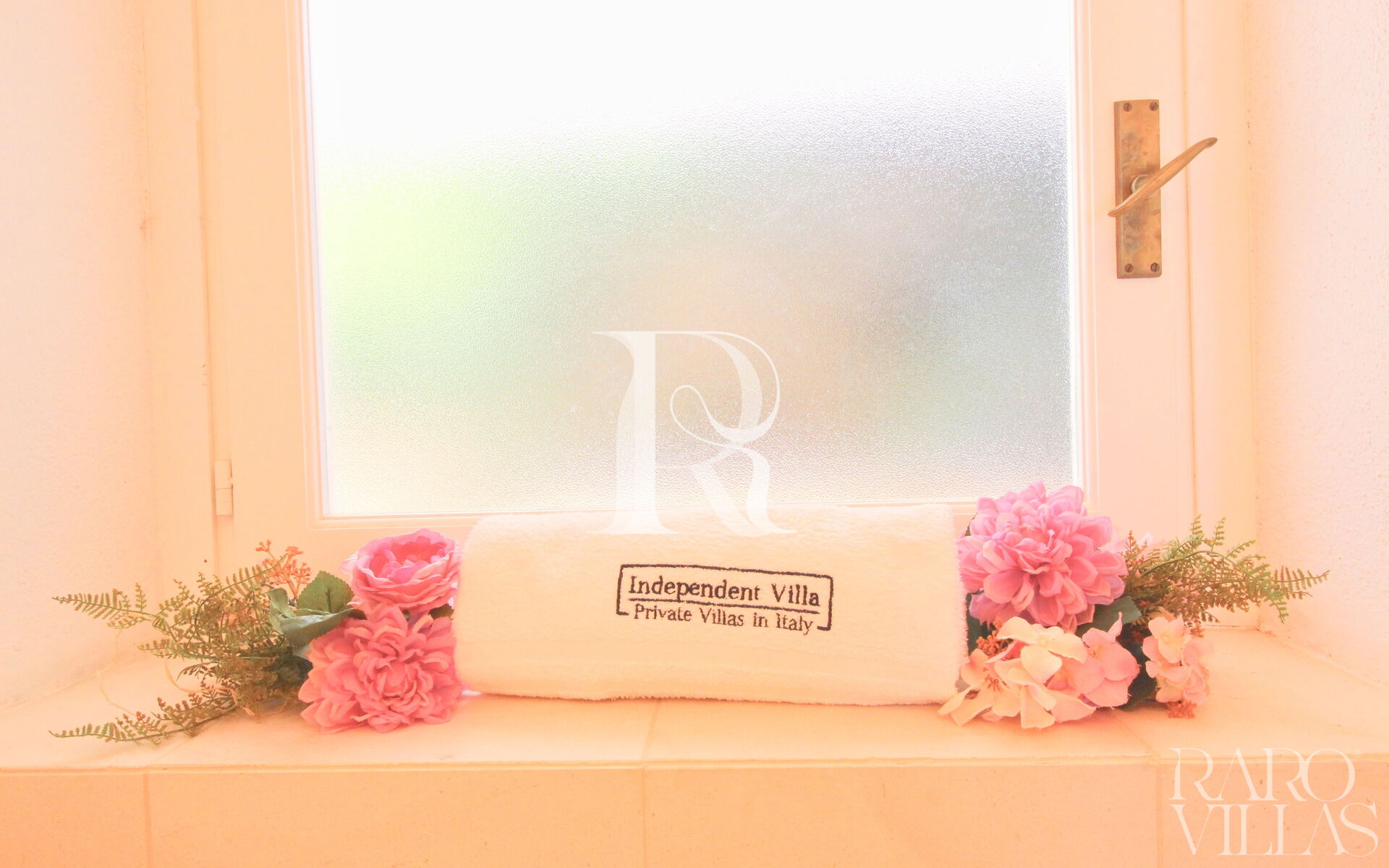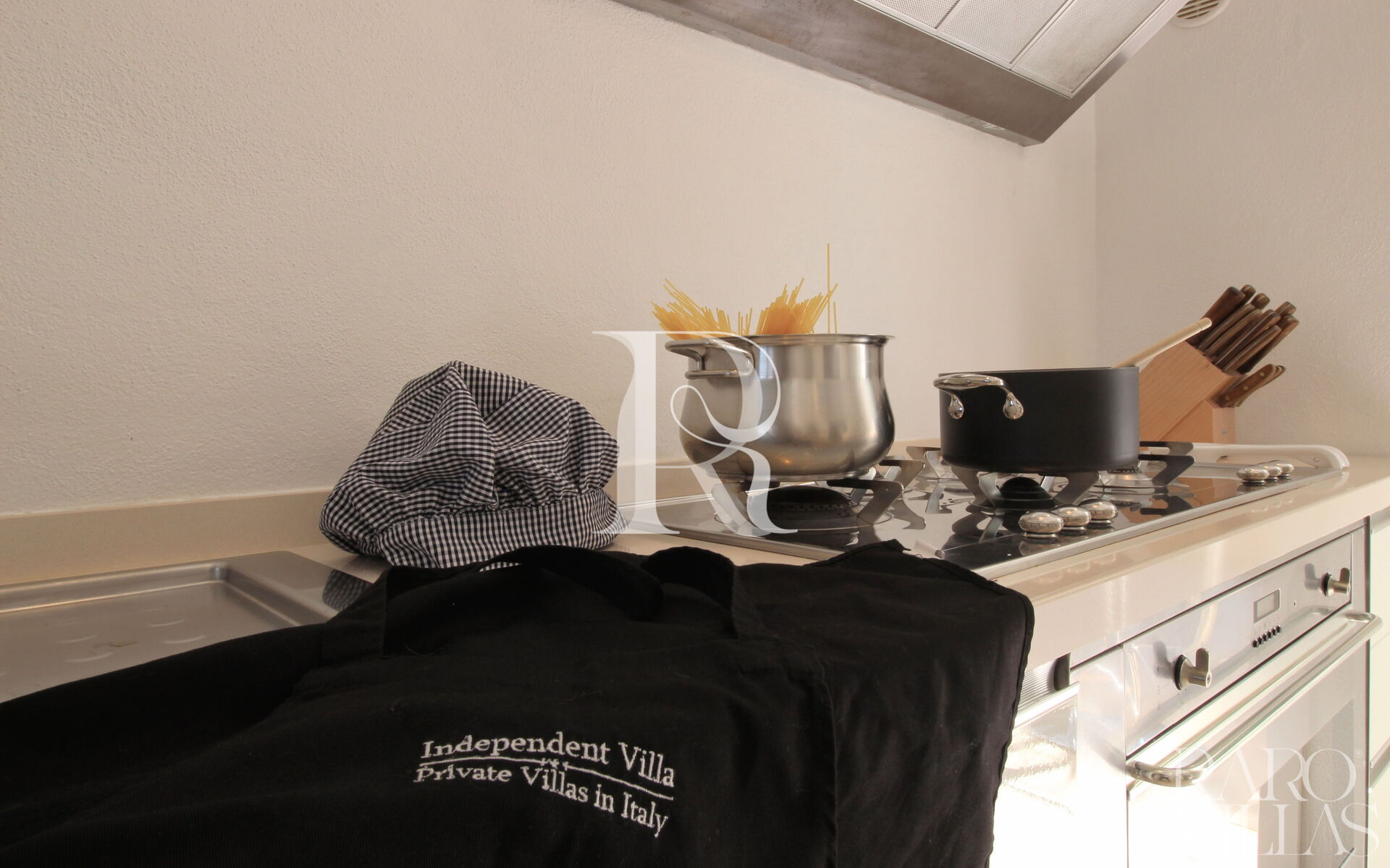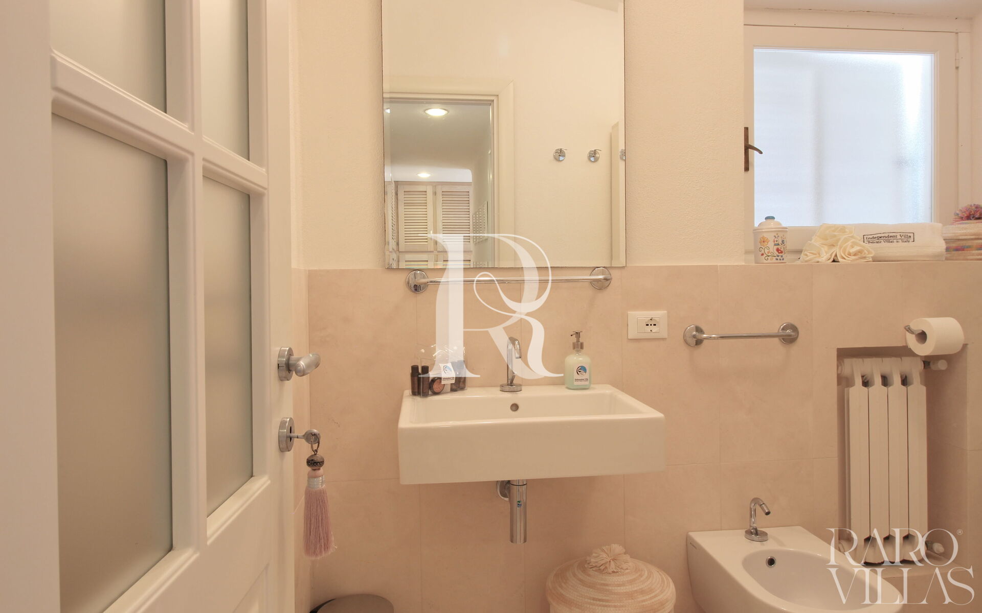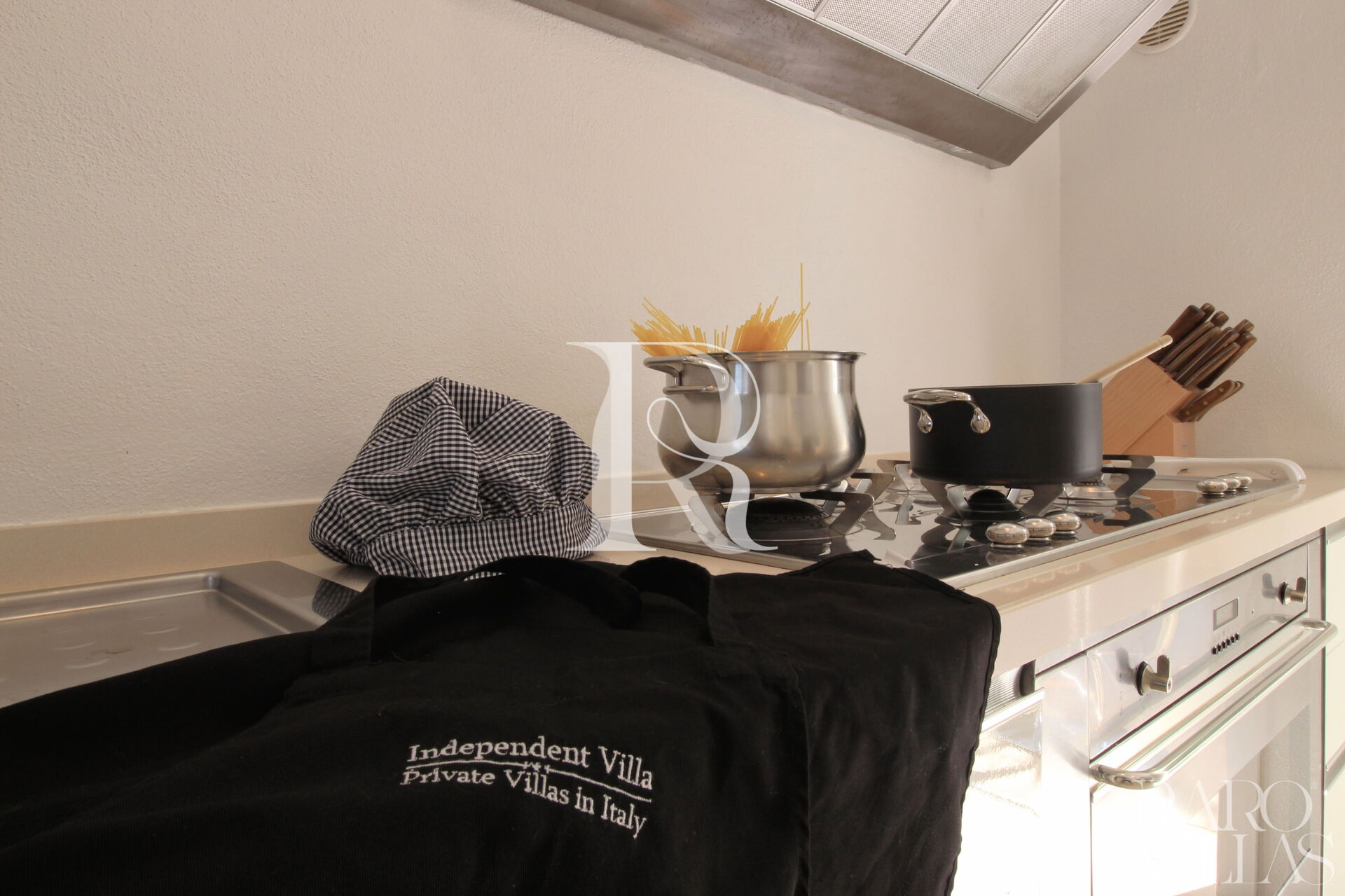 On the right, there are two further bedrooms, one double and one twin, both overlooking the pool, and two bathrooms with shower. In the basement, there is a room with twin beds convertible into a double bed, air conditioning and a bathroom with shower. The laundry, equipped with a washing machine, is located in another basement of the villa.