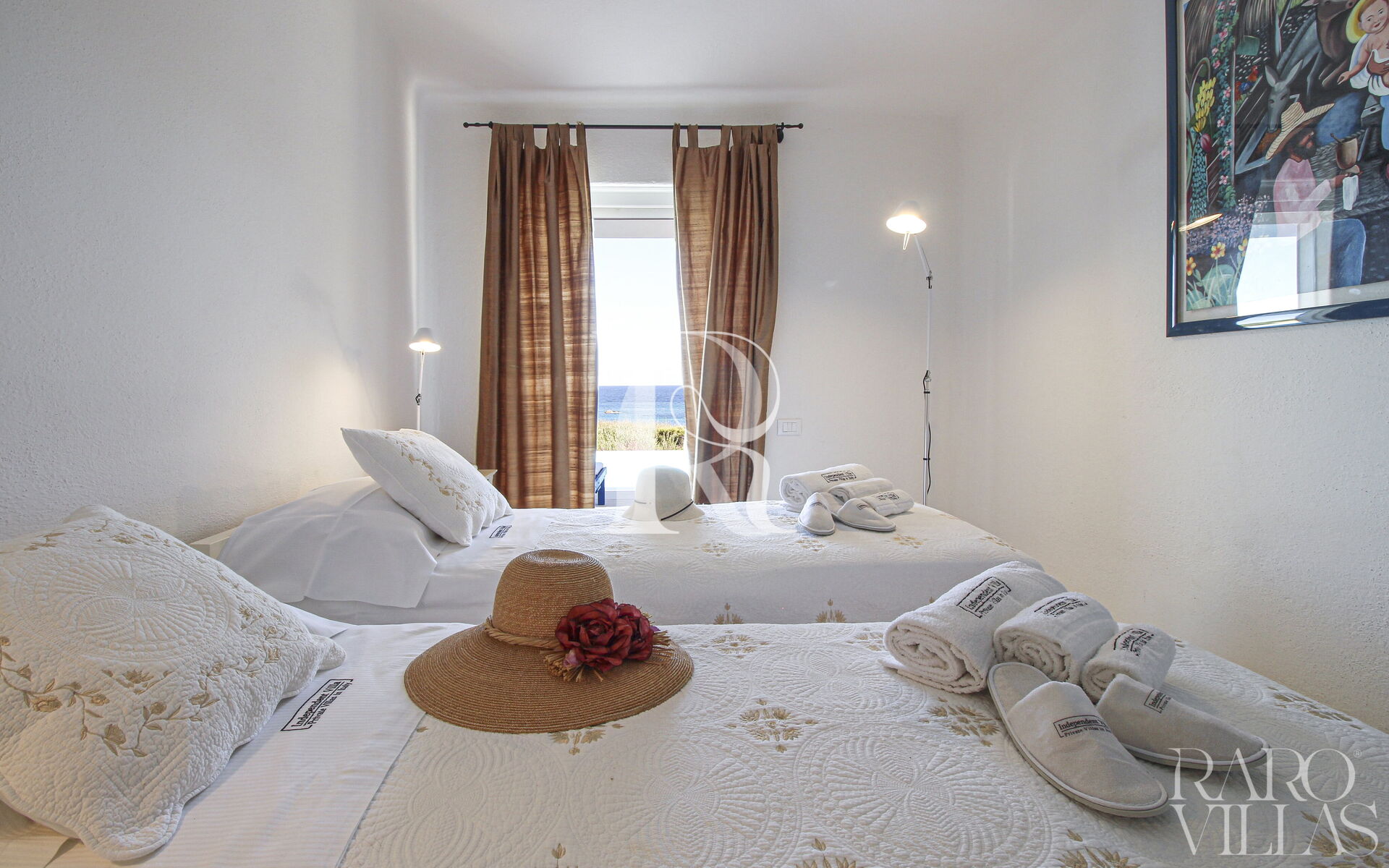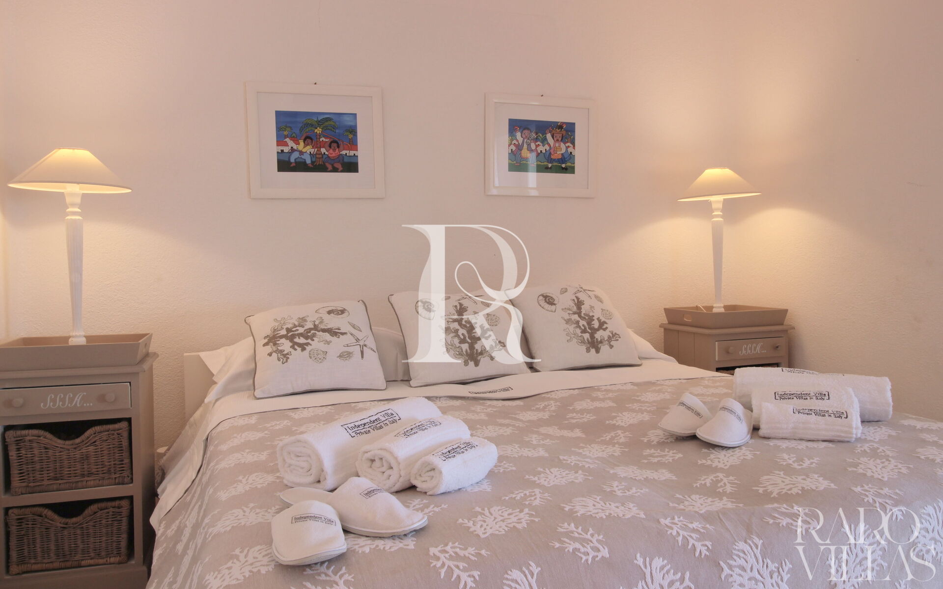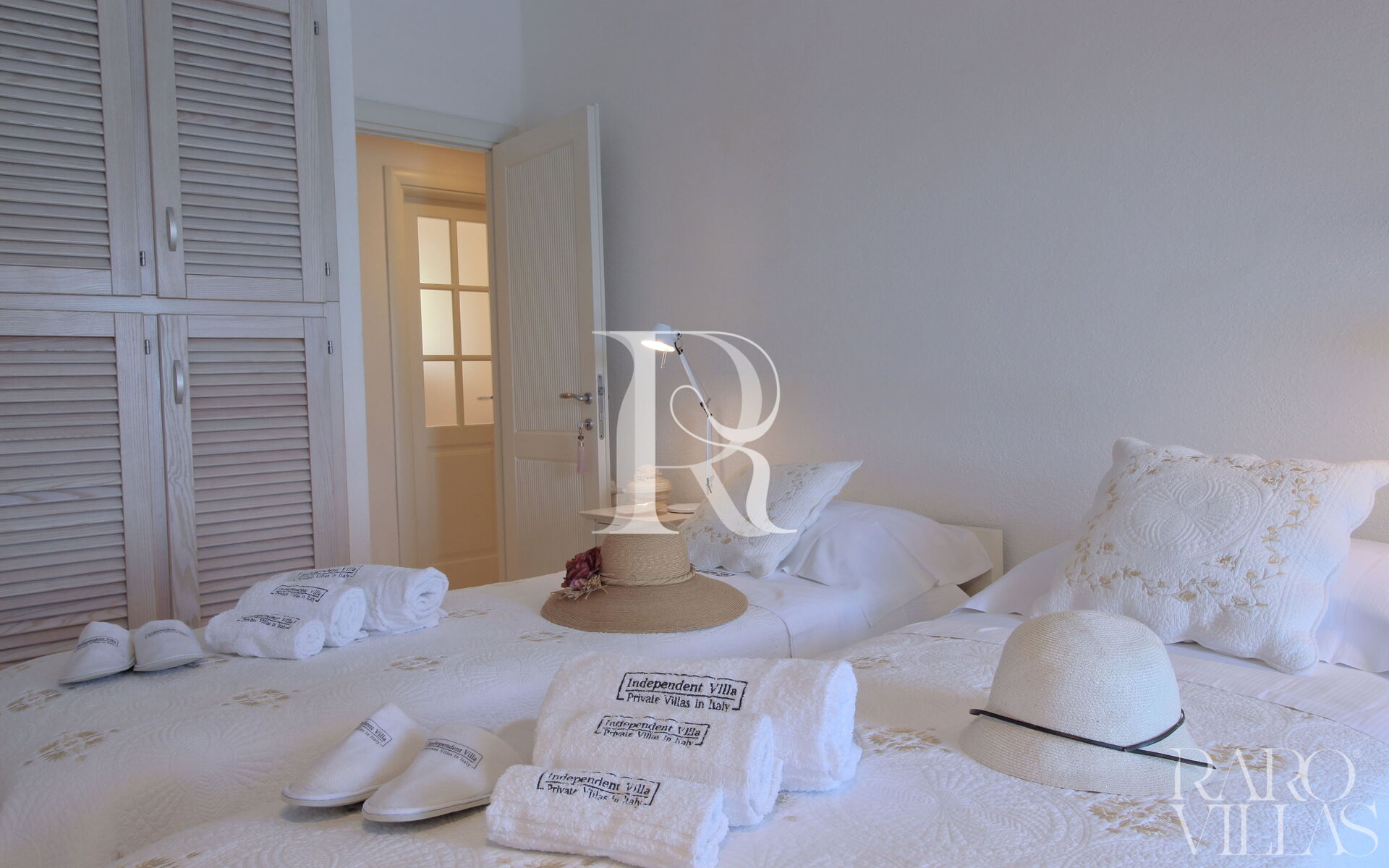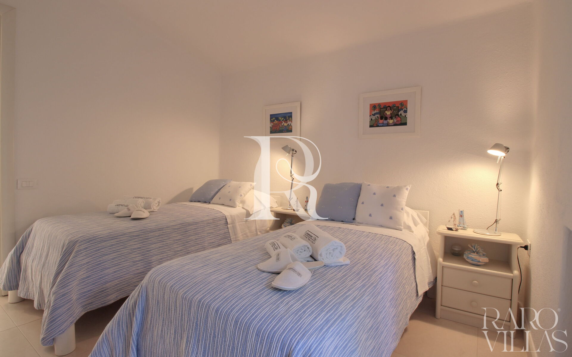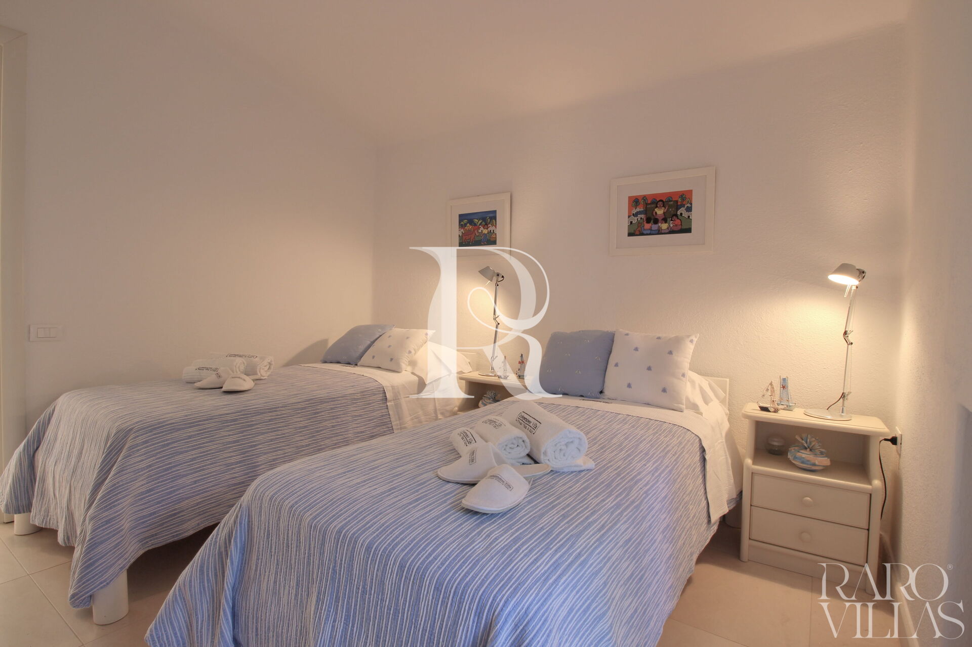 The sleeping area is distributed in both wings of the house. On the left are the first two bedrooms, bright and with shared bathroom with shower. The first room has two twin beds and a French window, while the second can be configured as a double or twin, also with French windows and pool views.