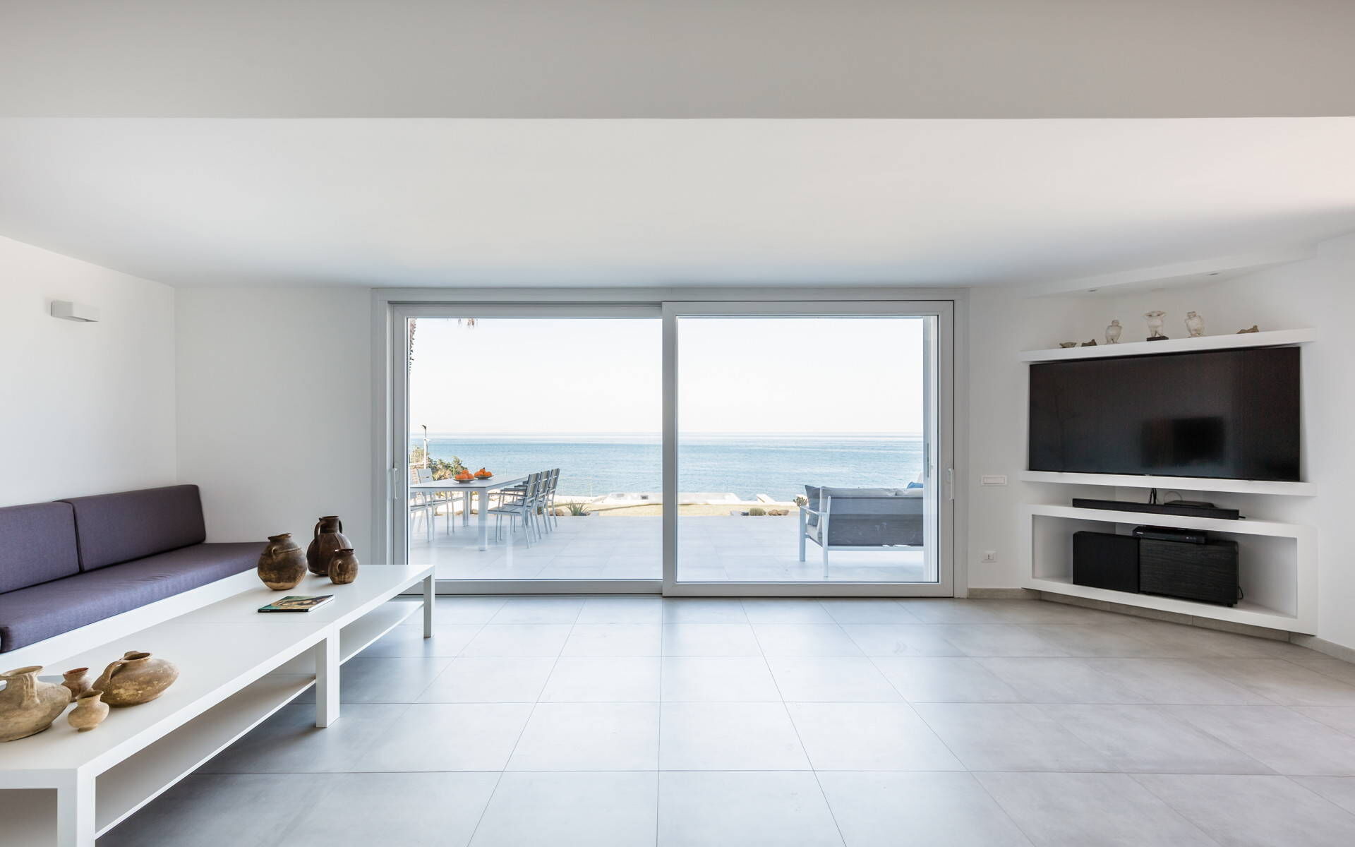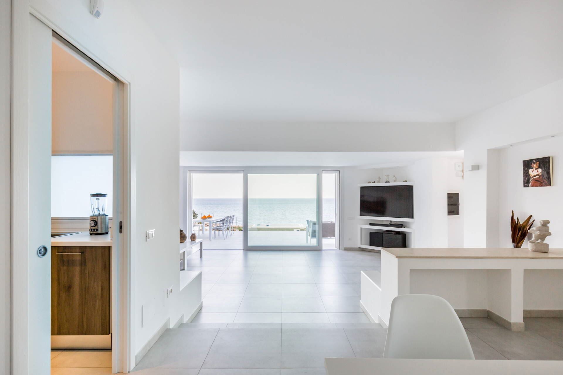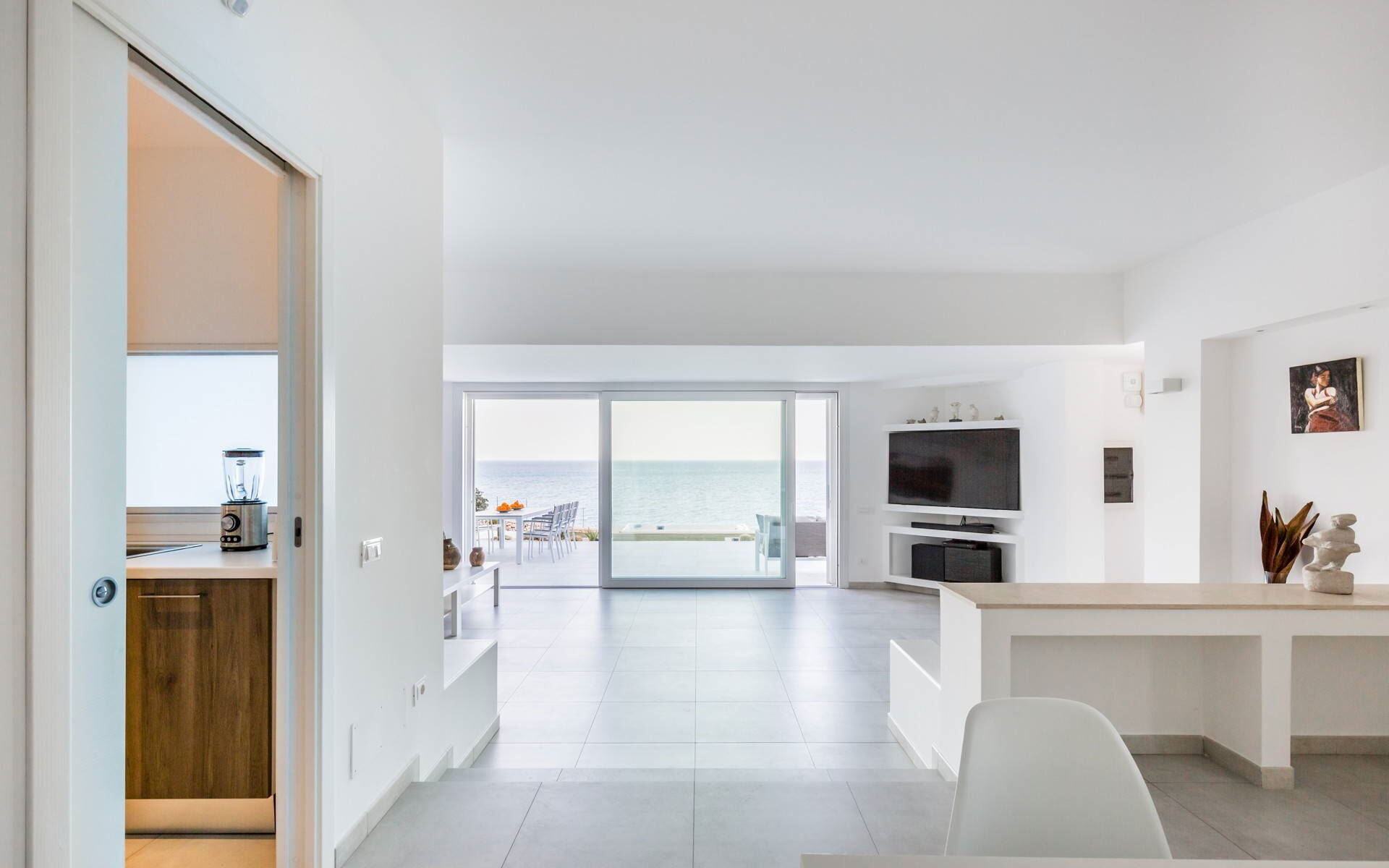 The villa’s interior boasts light, linear spaces with a comfortable, relaxing atmosphere. The ground floor consists of a large open space which enjoys a wonderful sea view through the windows and comprises a finely decorated living room, a modern kitchen with window and a delightful dining room.
