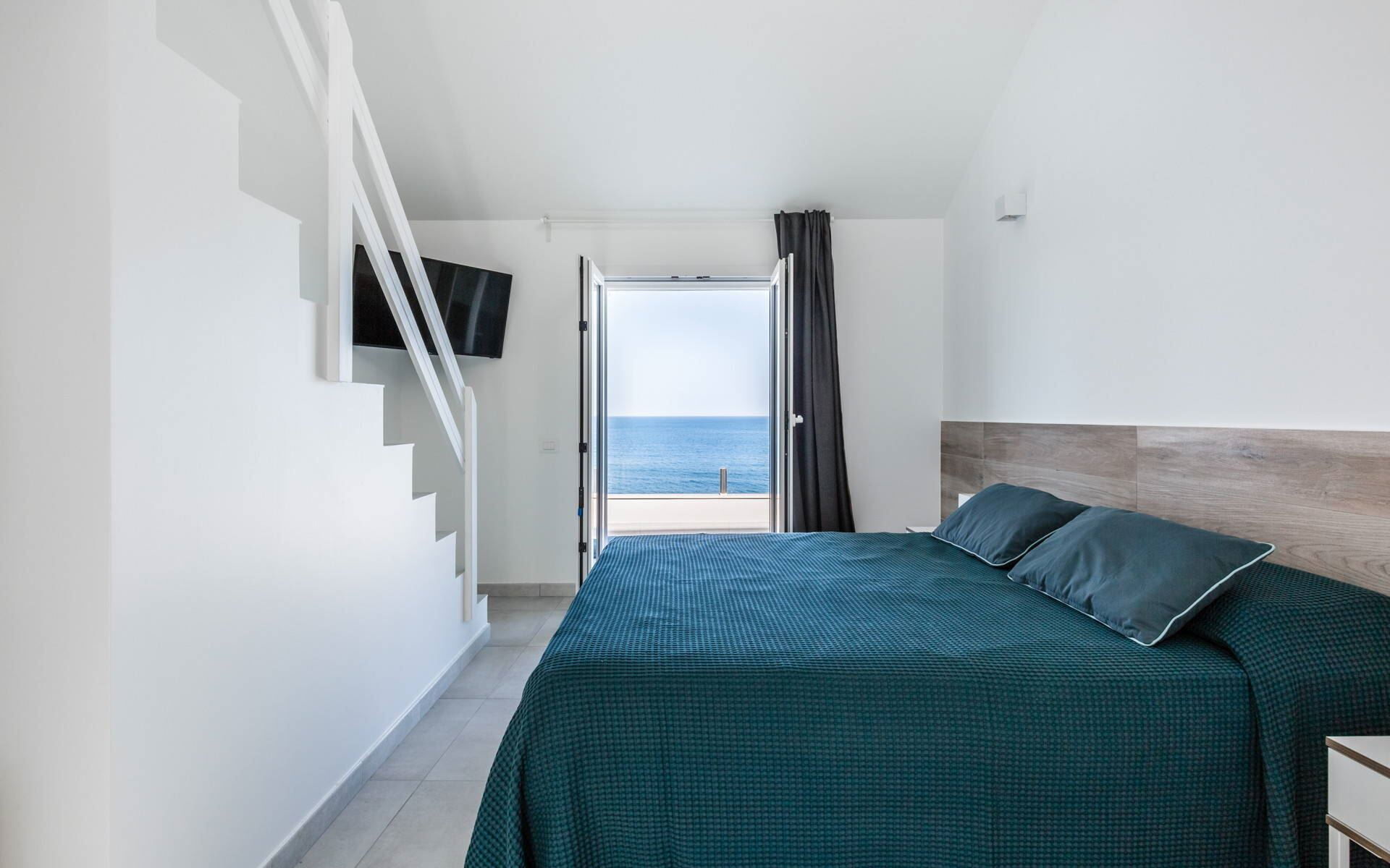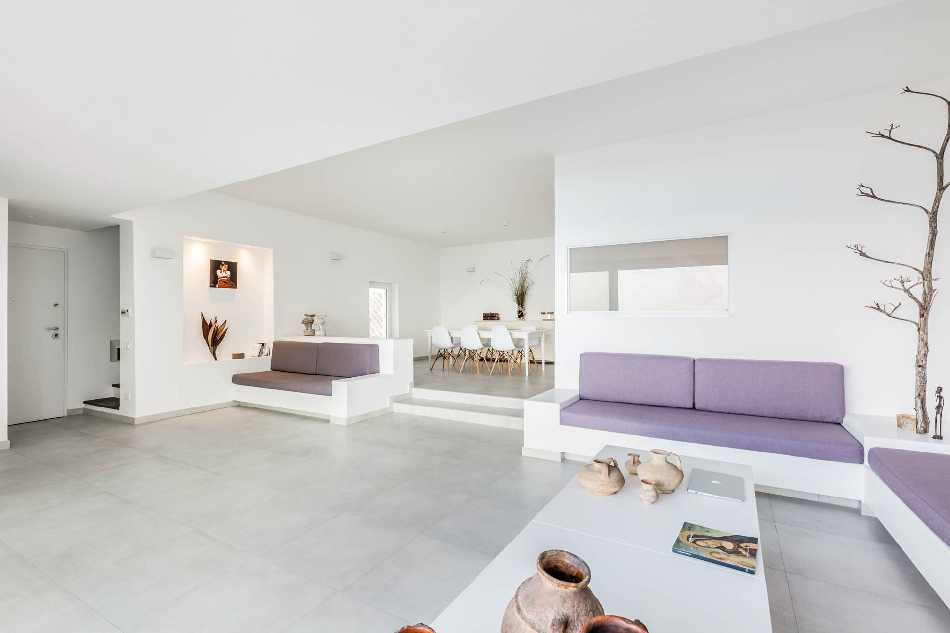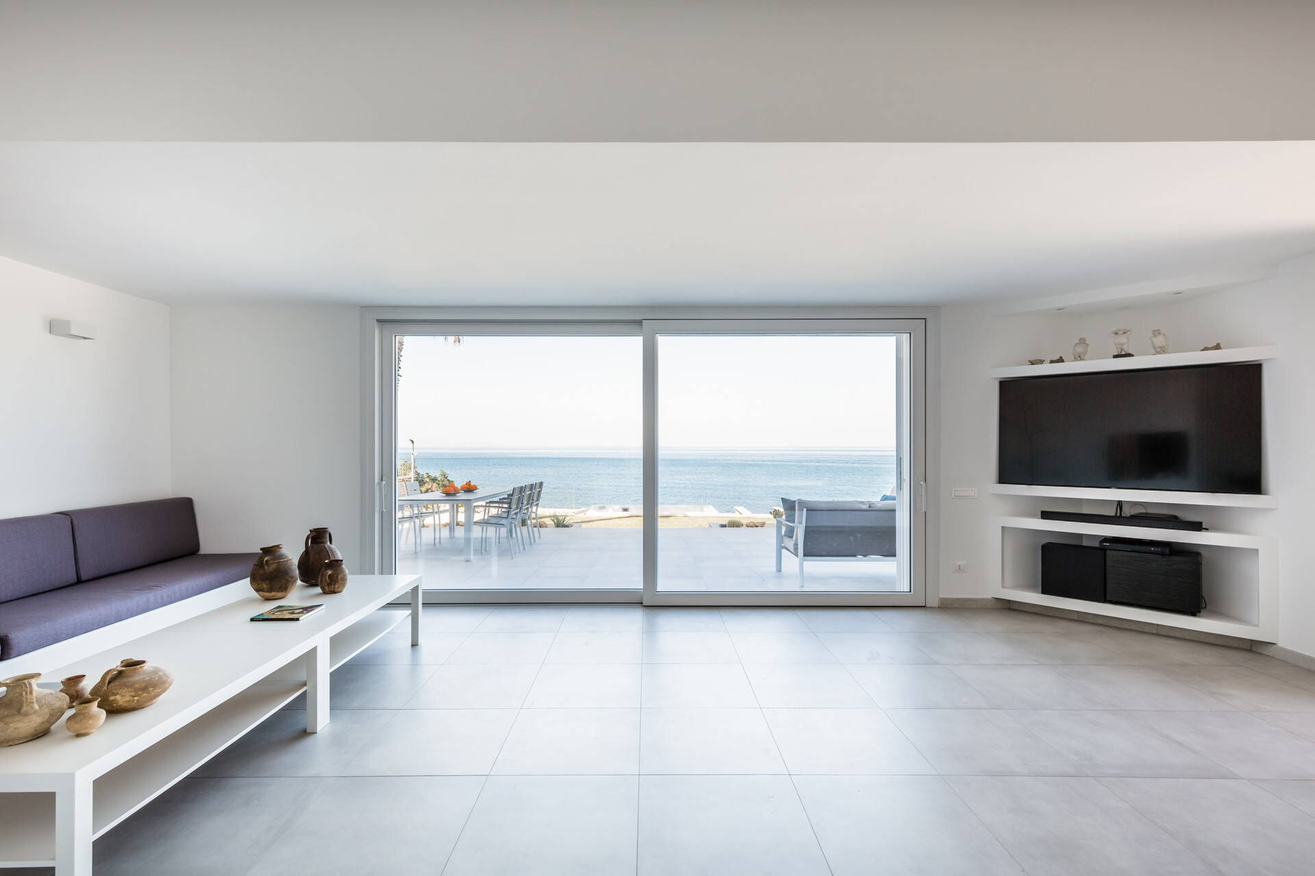 The villa’s interior boasts light, linear spaces with a comfortable, relaxing atmosphere. The ground floor consists of a large open space which enjoys a wonderful sea view through the windows and comprises a finely decorated living room, a modern kitchen with window and a delightful dining room.