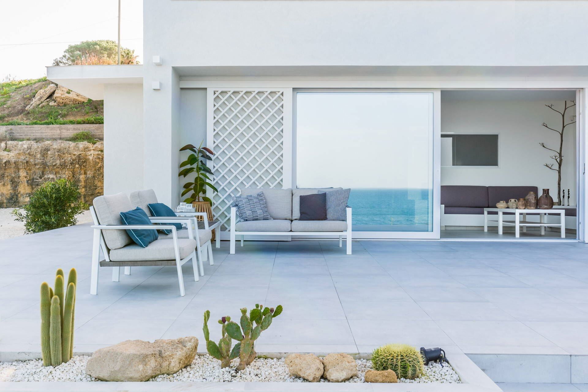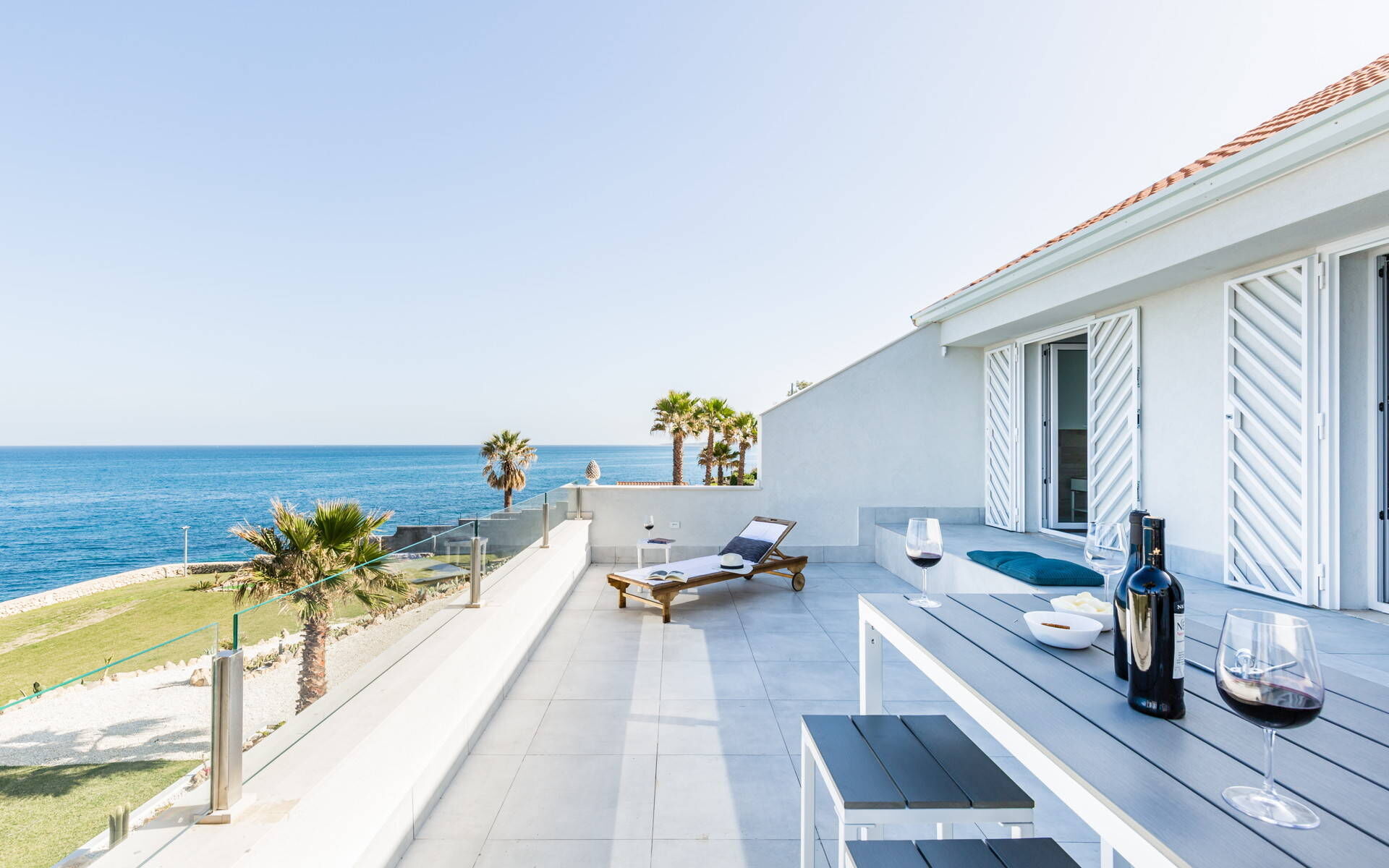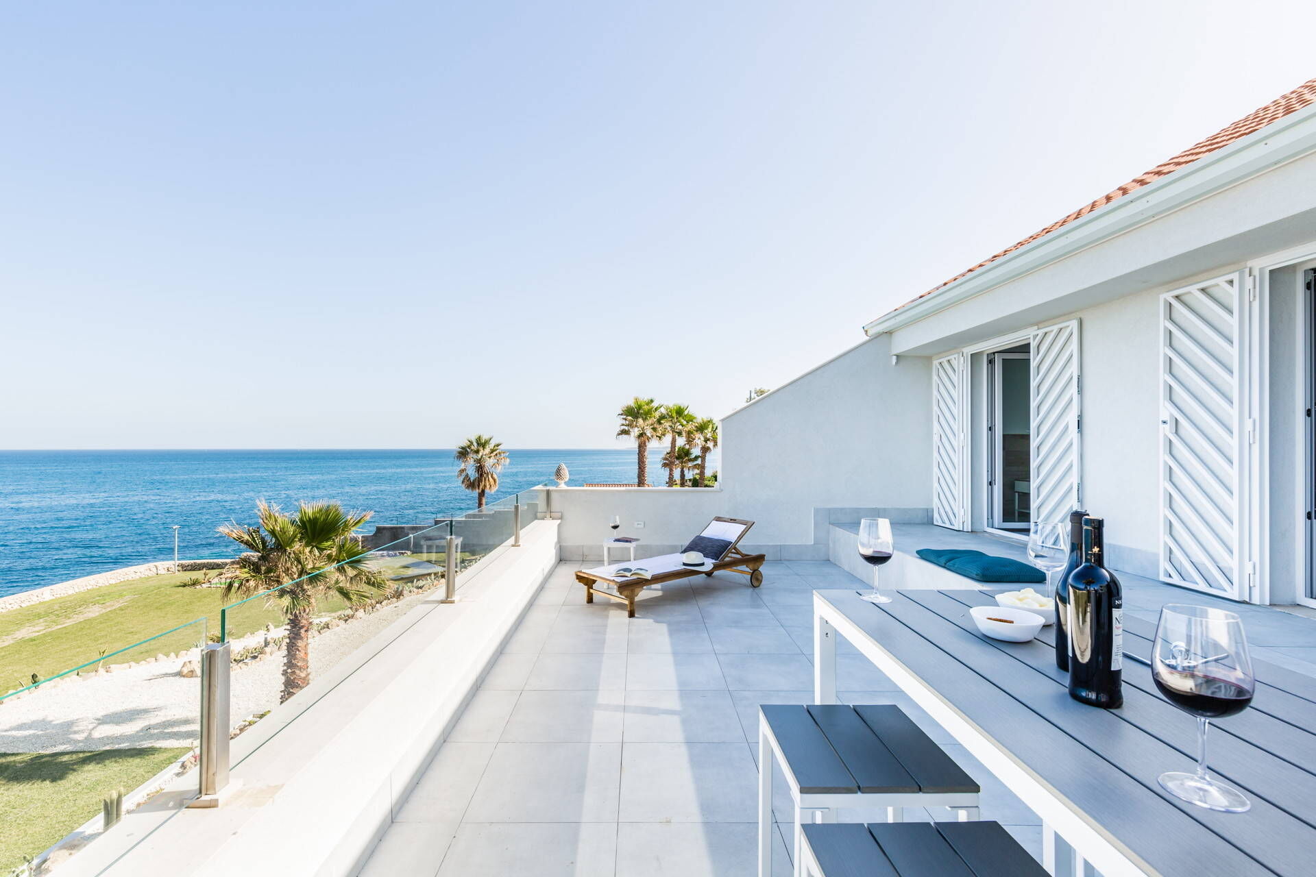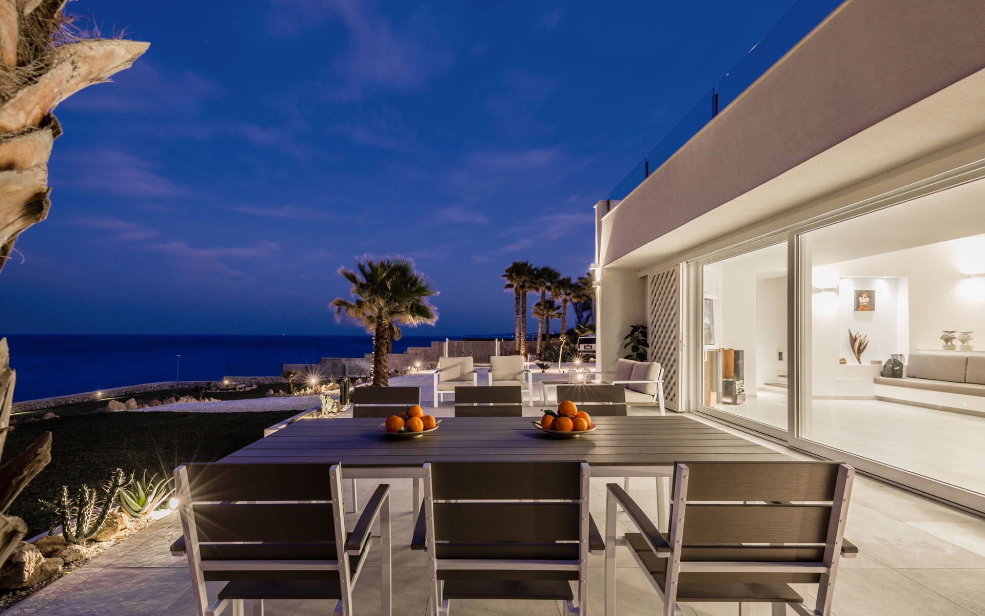 The terrace overlooking the sea is the perfect place for al fresco dining and makes for a beautiful and intimate setting as the sun sets into the Sicilian sea.