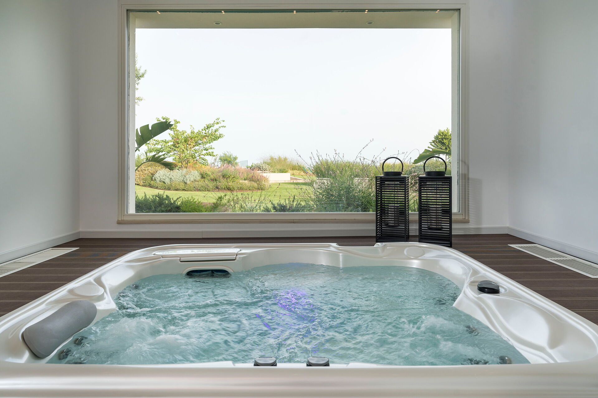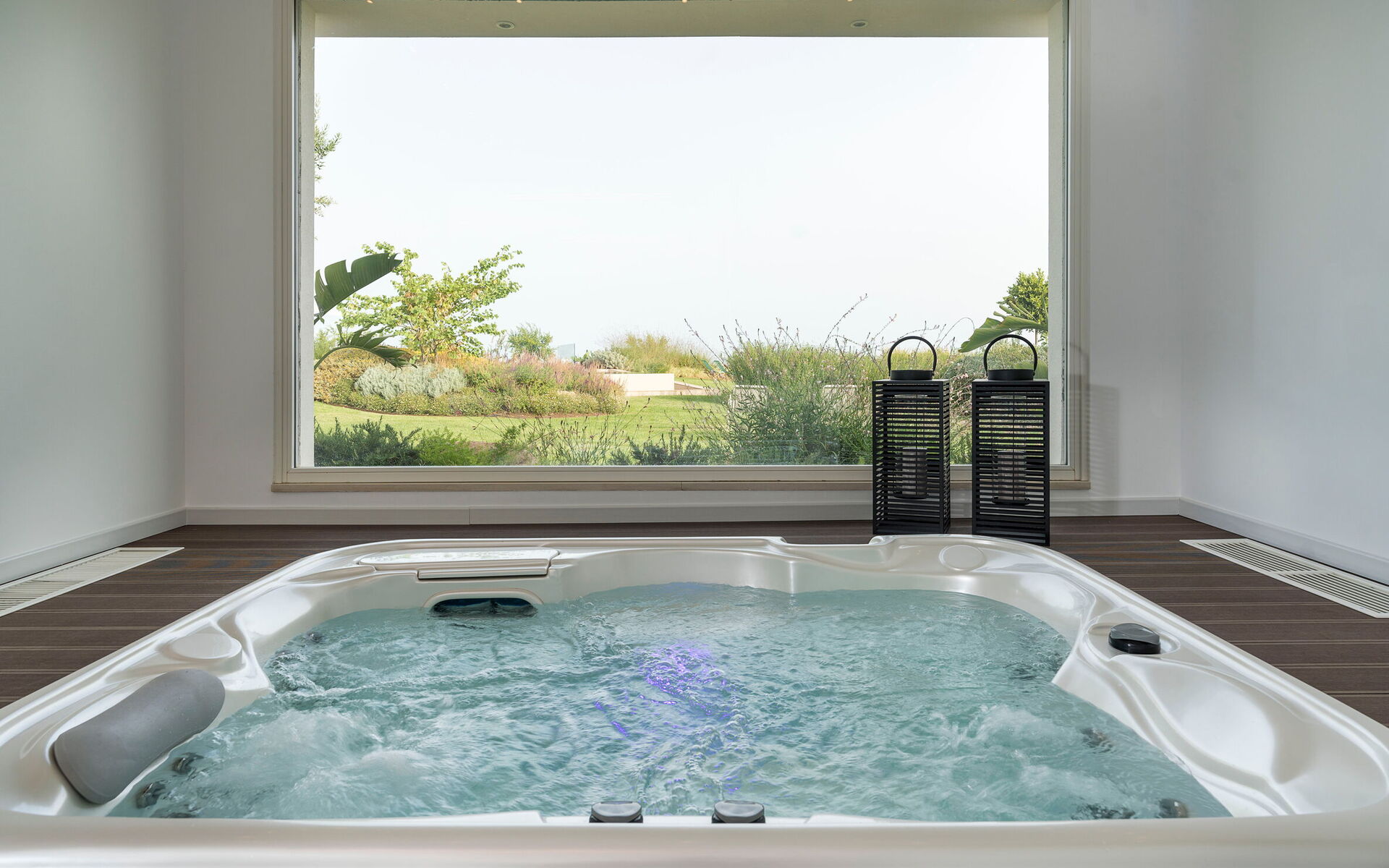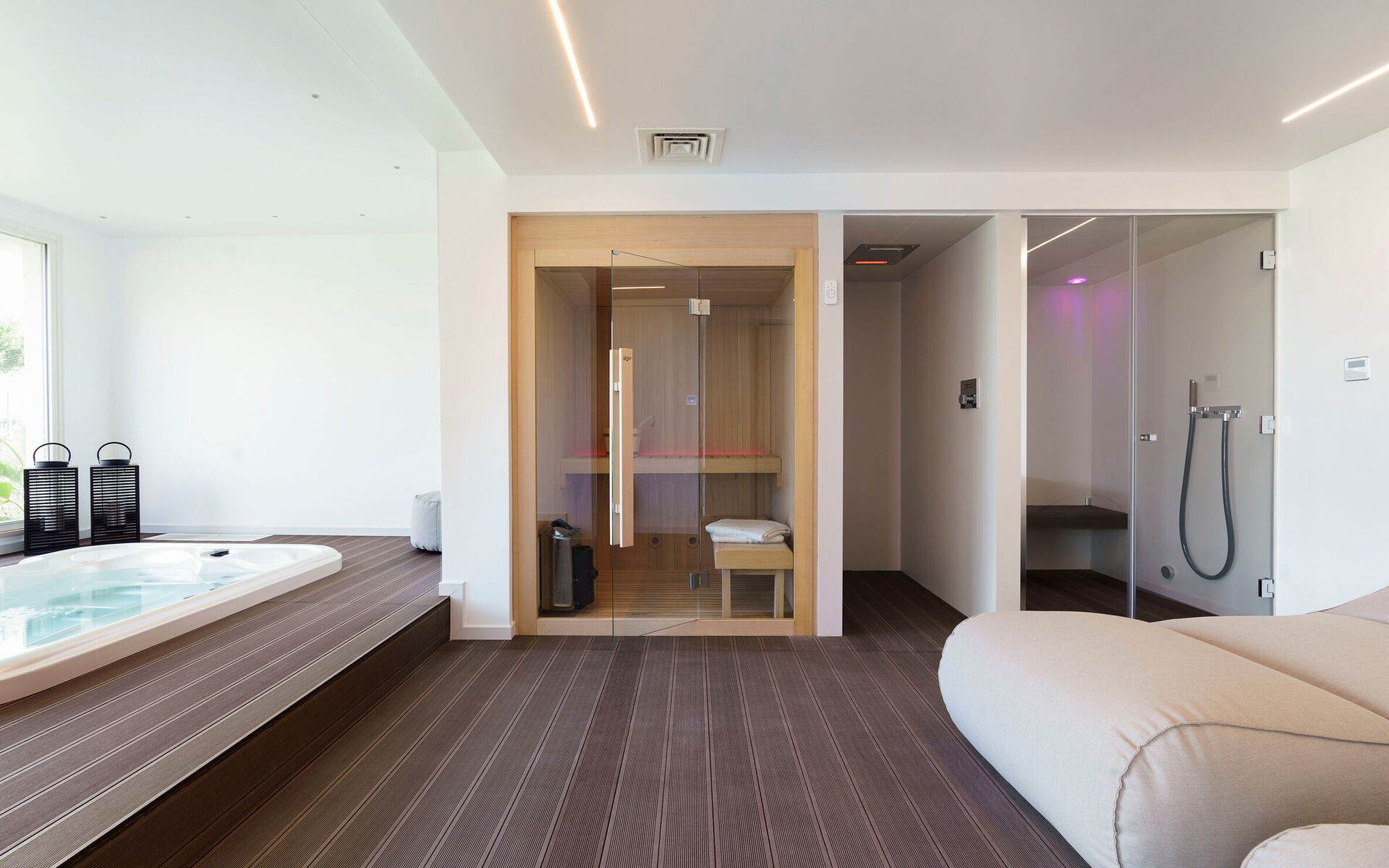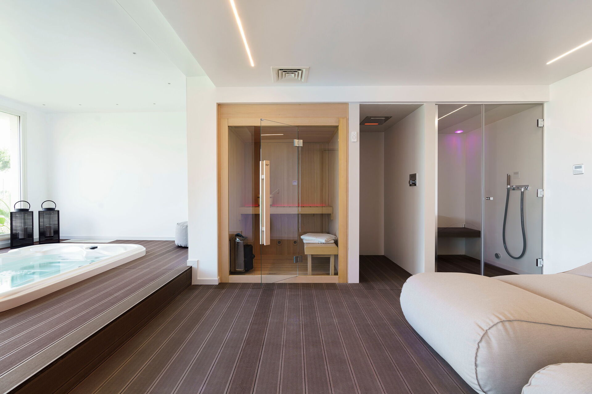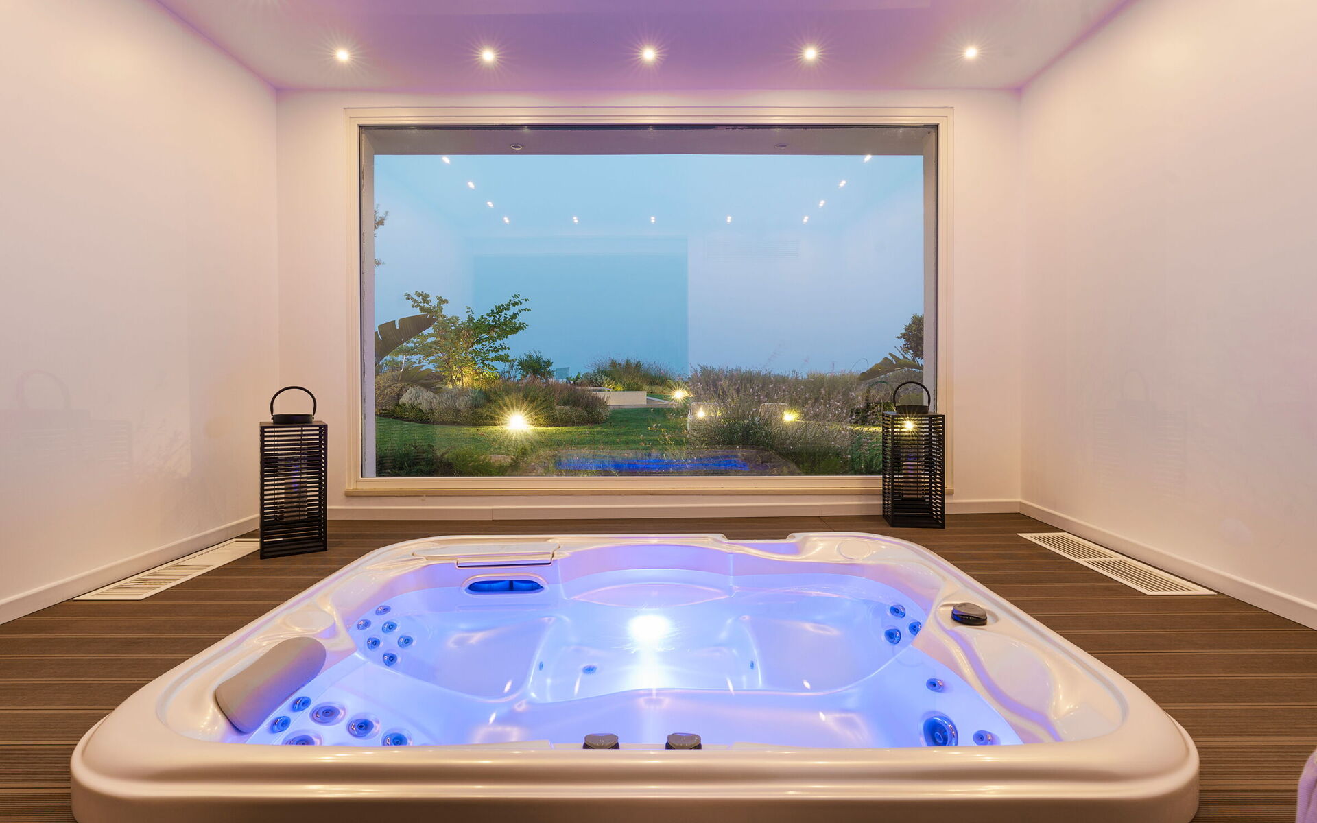 Wellness ruimte: jacuzzi binnen, douche, sauna, twee ligstoelen, WIFI internet, internet, stoombad.