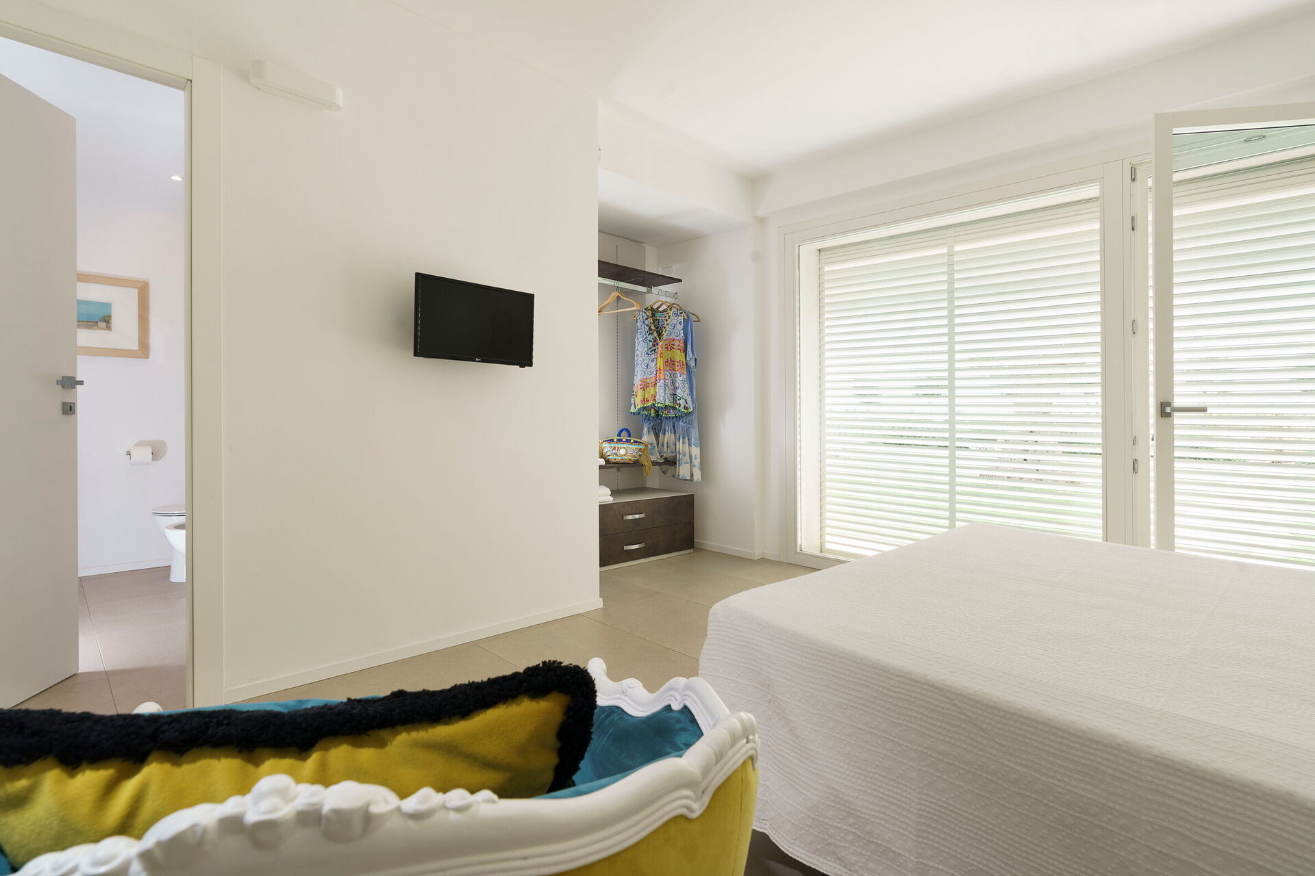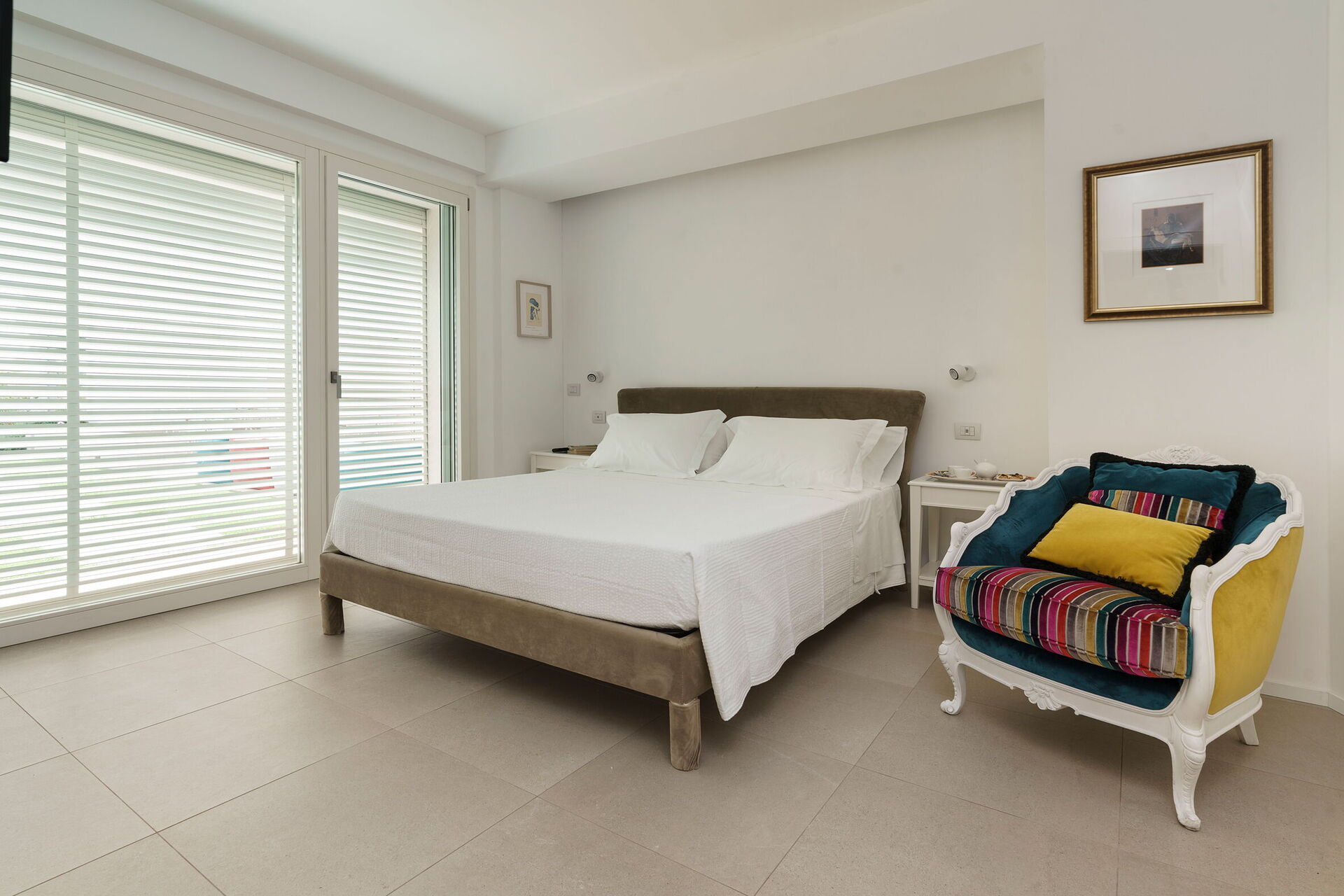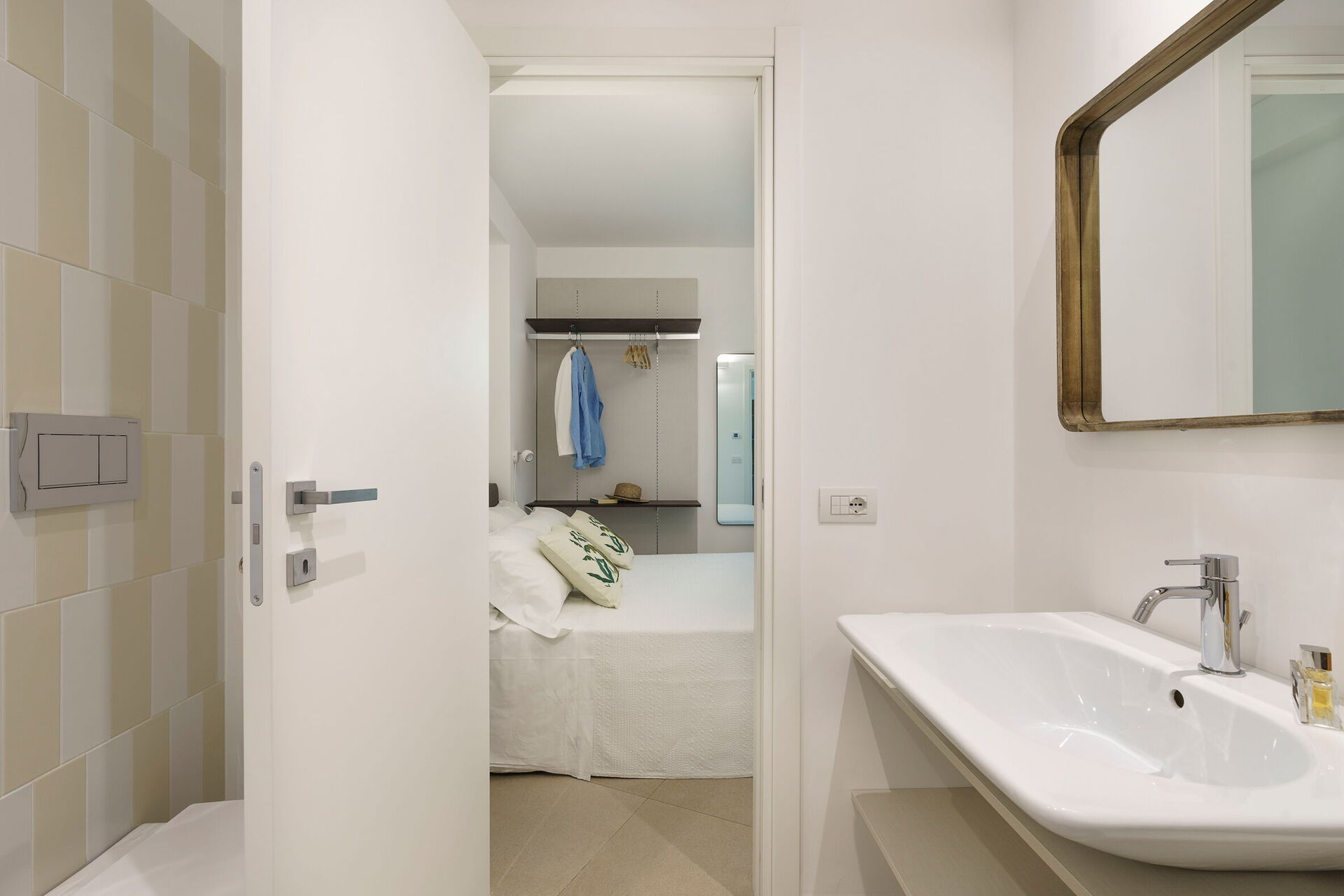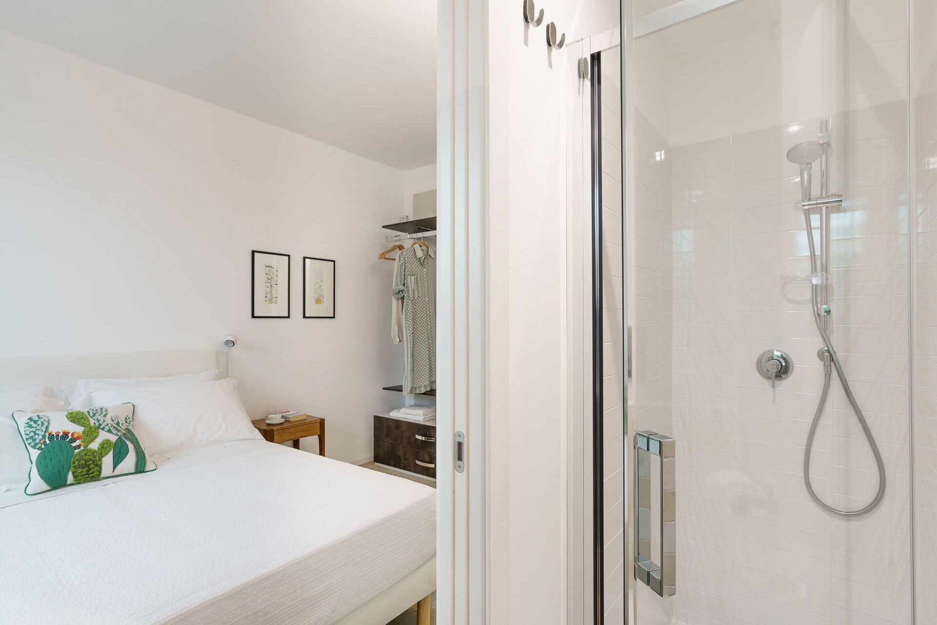 Slaapkamer met badkamer 1: tweepersoonsbed, baby wieg, WIFI internet, internet, airconditioning, hor, satelliet tv, fauteuil, wastafel, toilet , bidet, douche, haardroger, badkamer zonder raam, uitgang naar het terras.