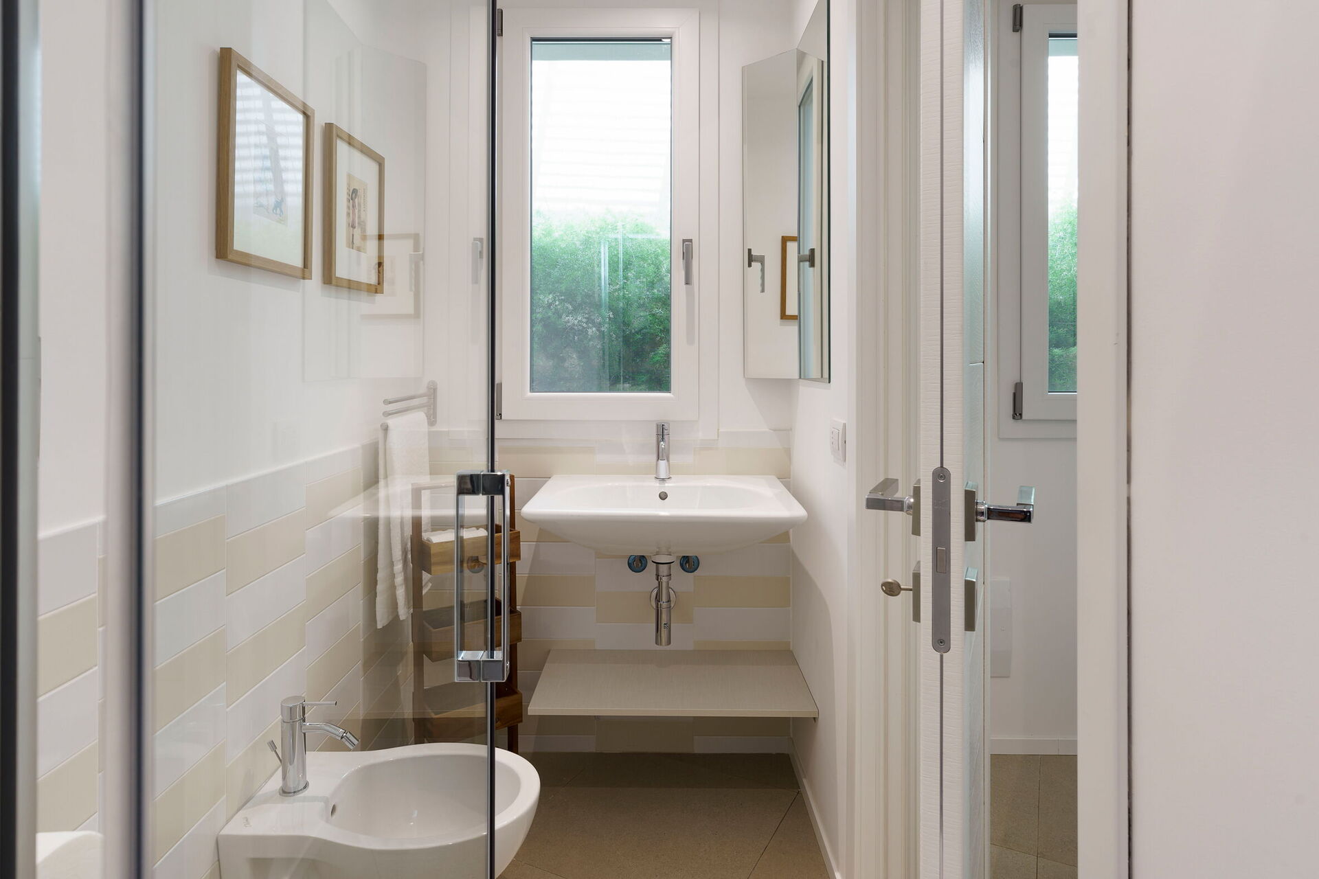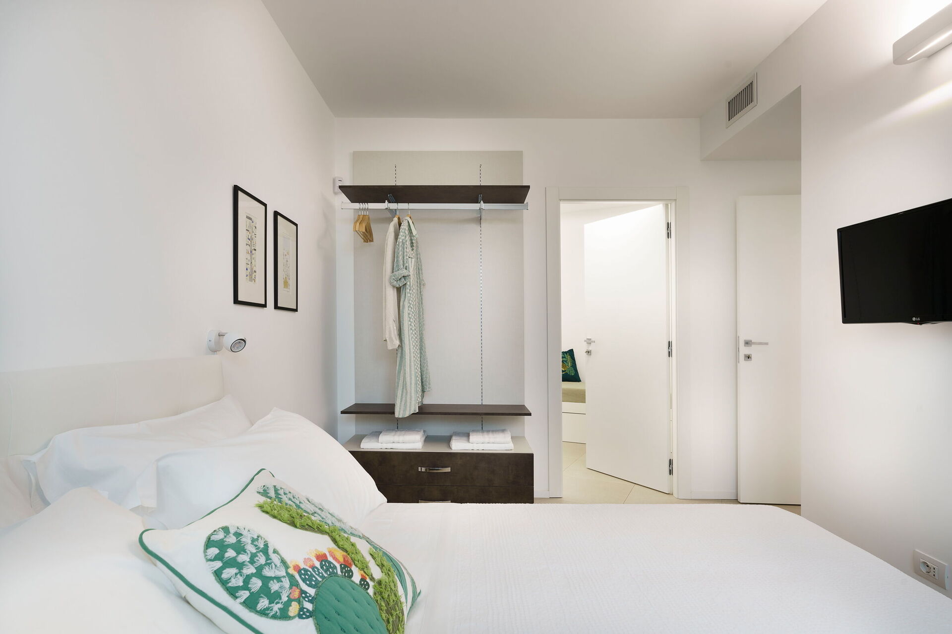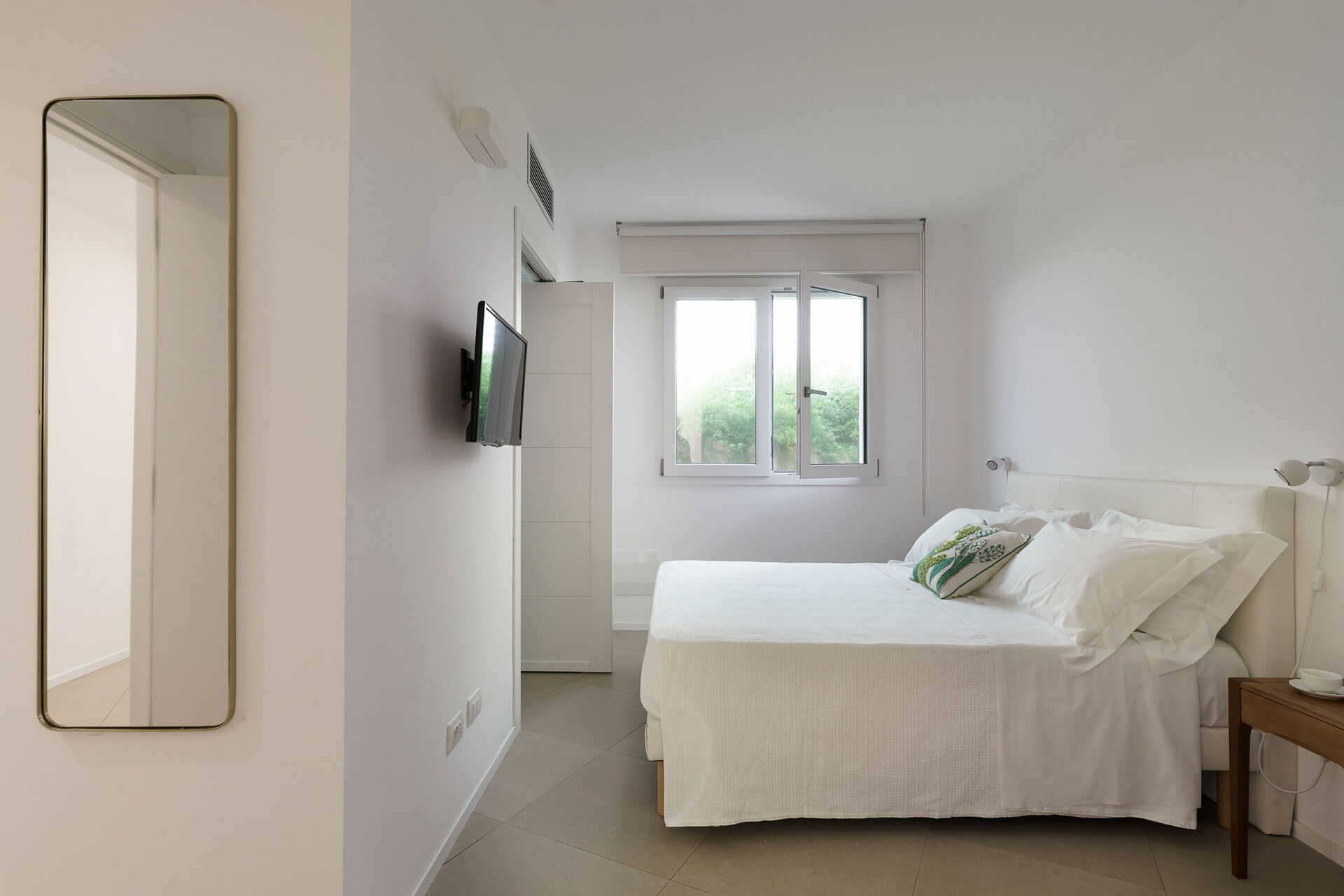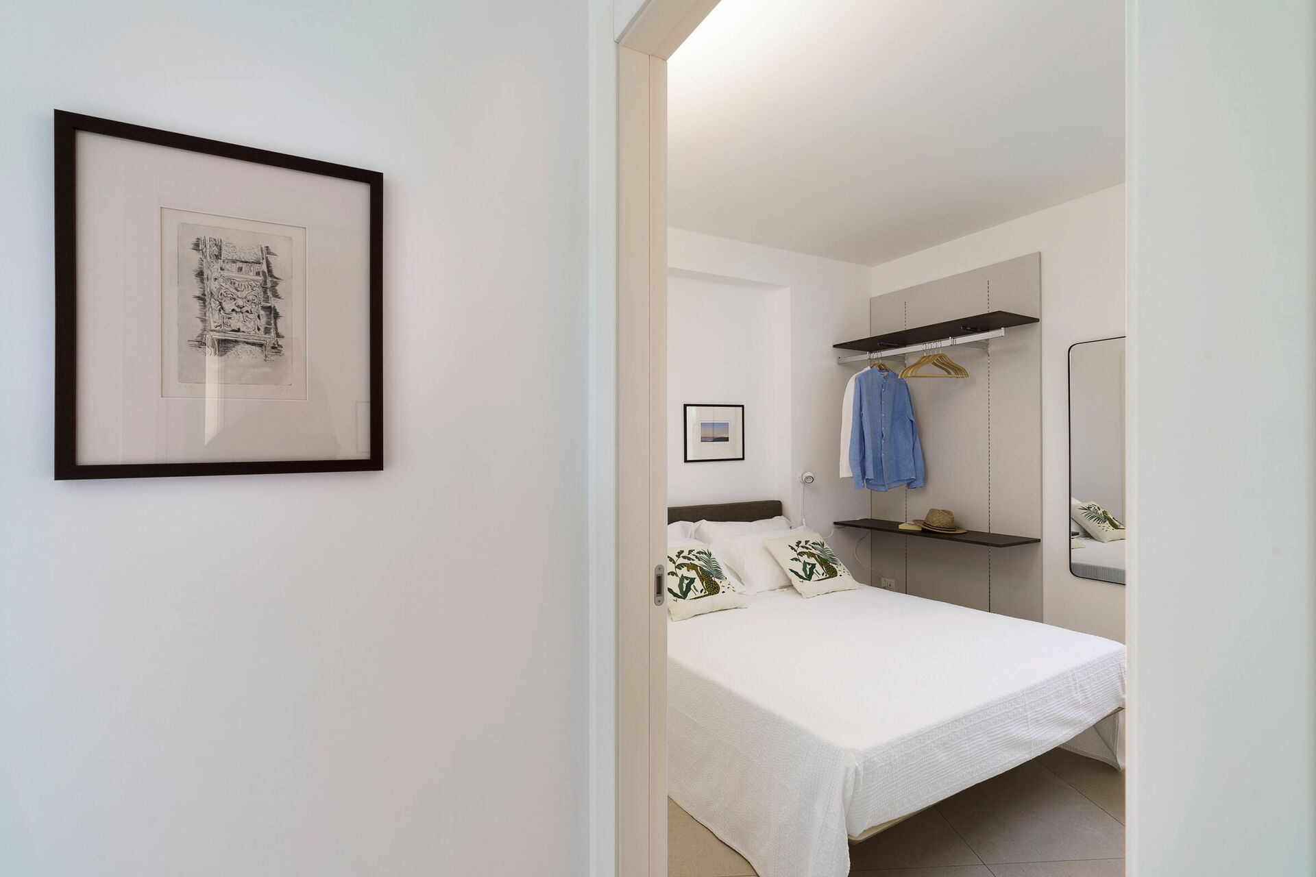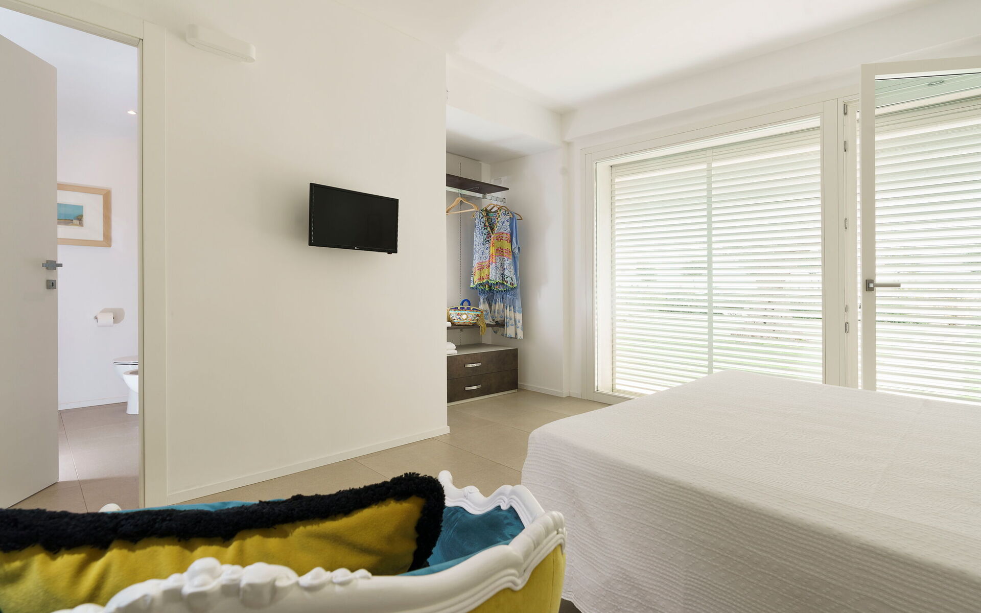 Slaapkamer met badkamer 1: tweepersoonsbed, baby wieg, WIFI internet, internet, airconditioning, hor, satelliet tv, fauteuil, wastafel, toilet , bidet, douche, haardroger, badkamer zonder raam, uitgang naar het terras.