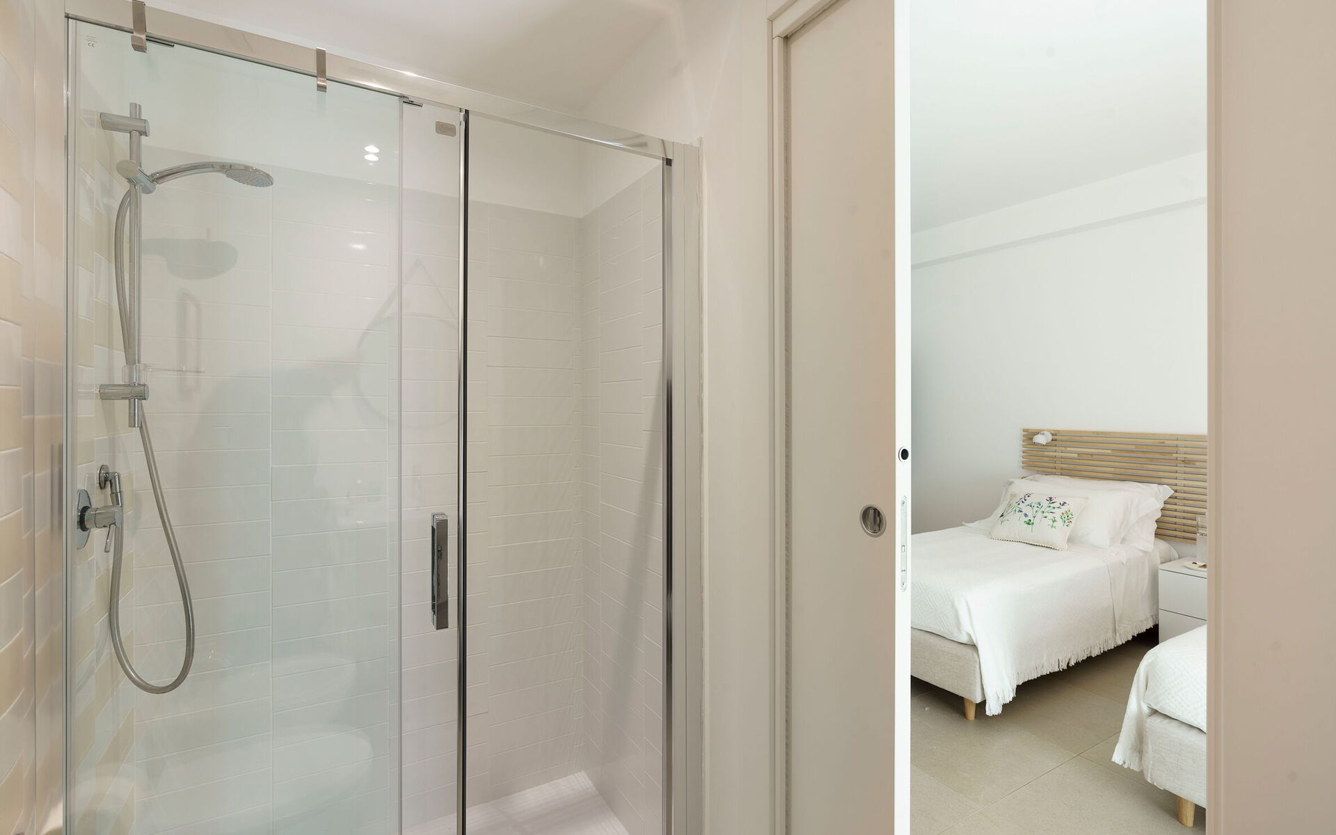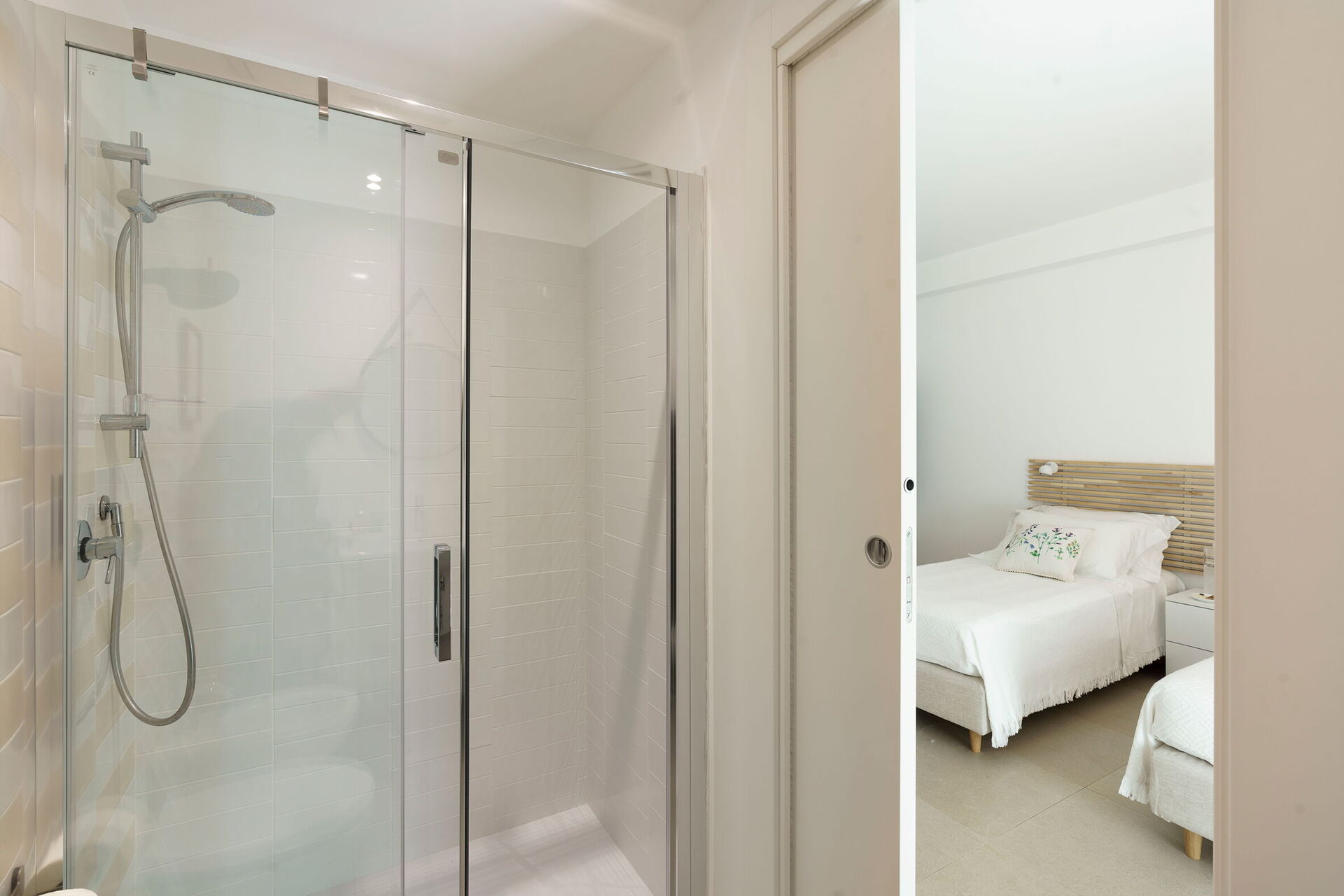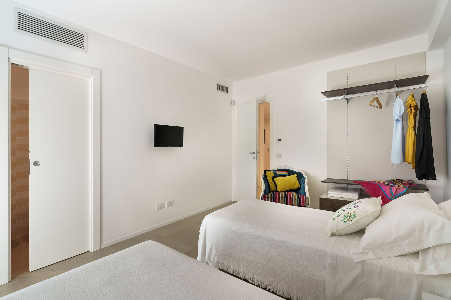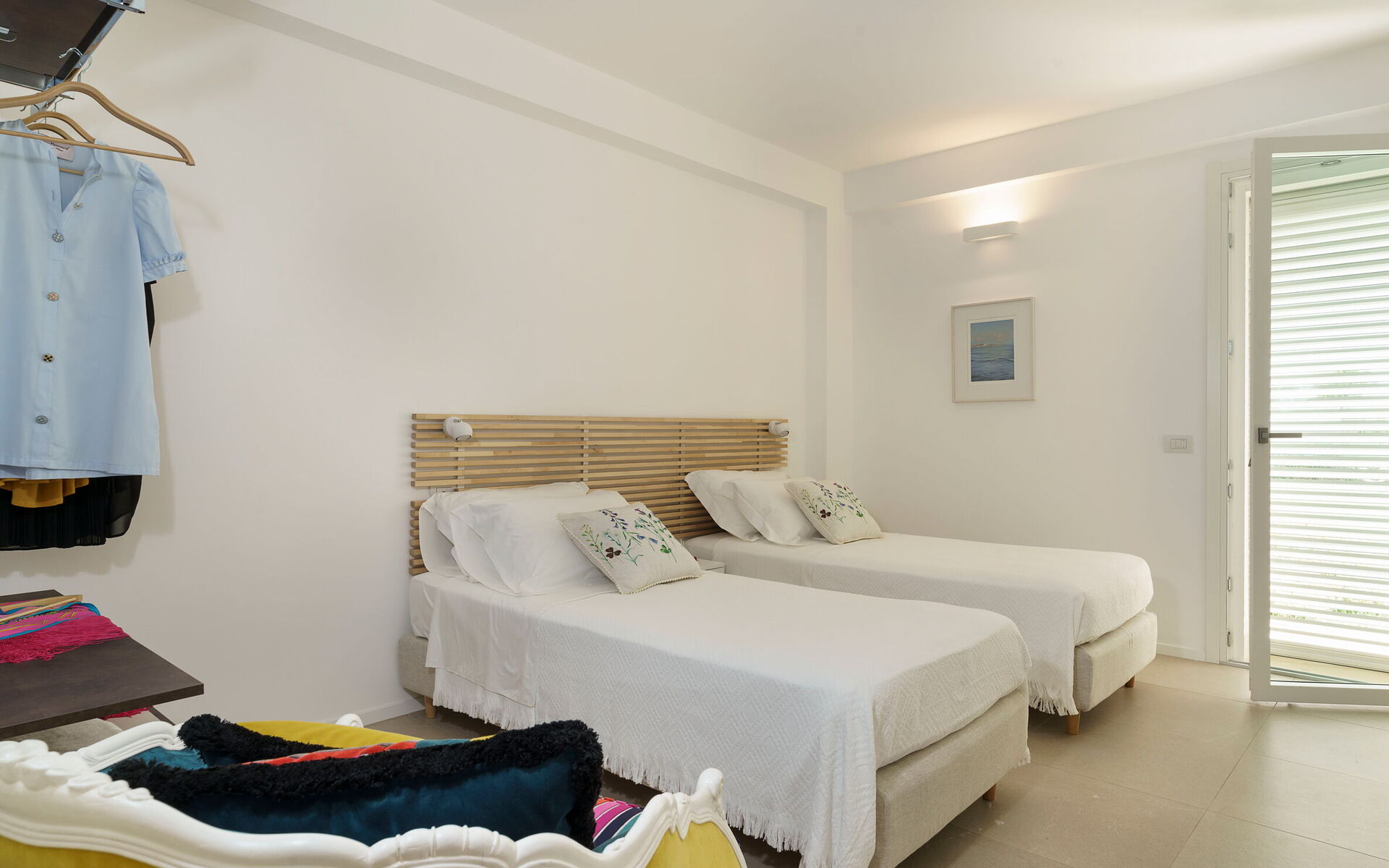 Slaapkamer met badkamer 4: twee eenpersoonsbedden, WIFI internet, internet, airconditioning, hor, satelliet tv, fauteuil, wastafel, toilet , bidet, douche, haardroger, uitgang naar het terras.
