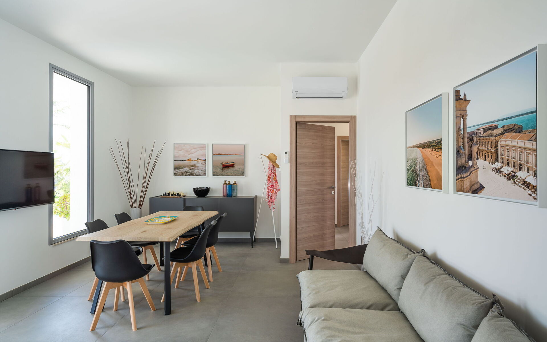 Woonkamer: bank (personen: 3), eettafel (personen: 6), WIFI internet, internet, airconditioning, satelliet tv, uitgang naar de patio.