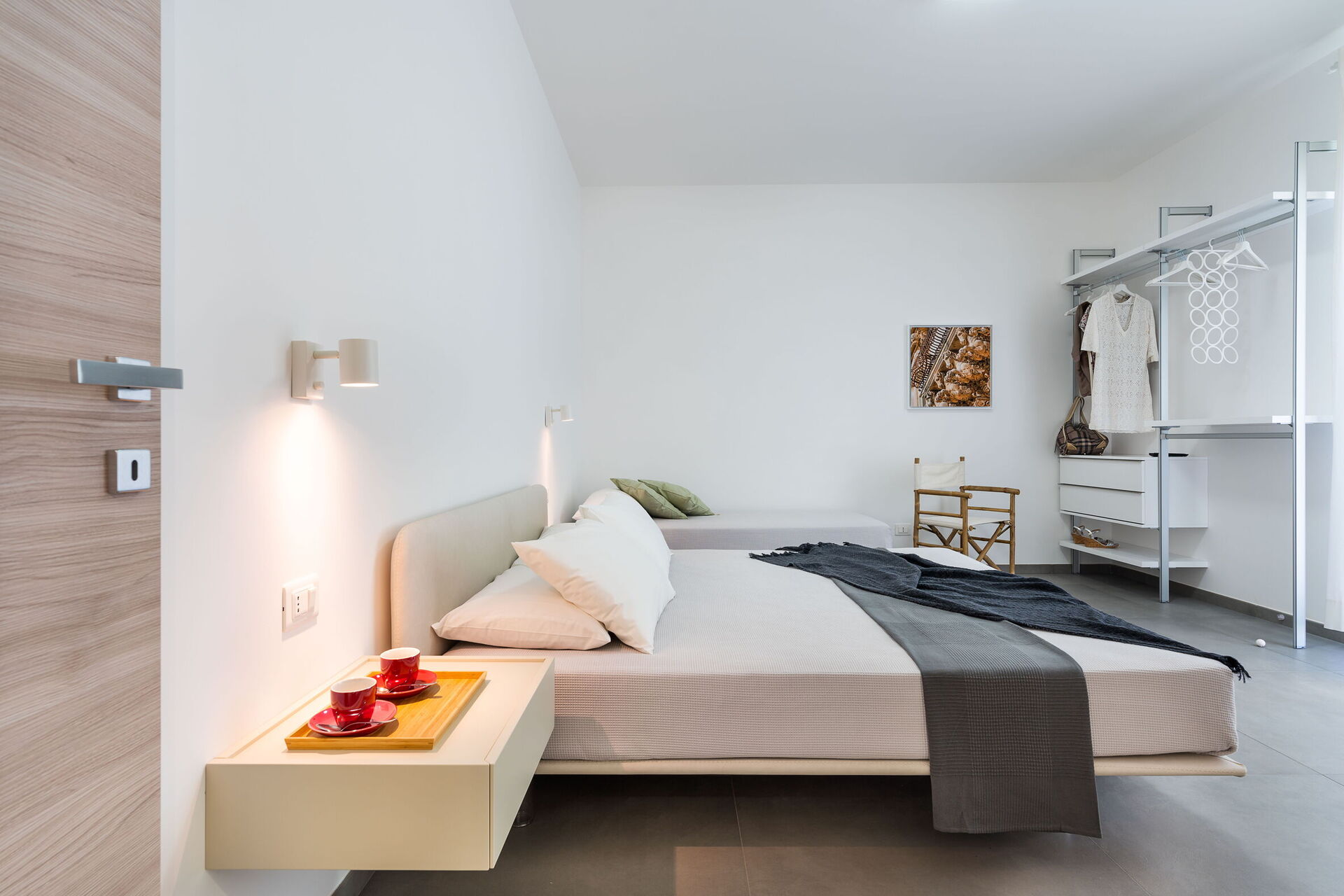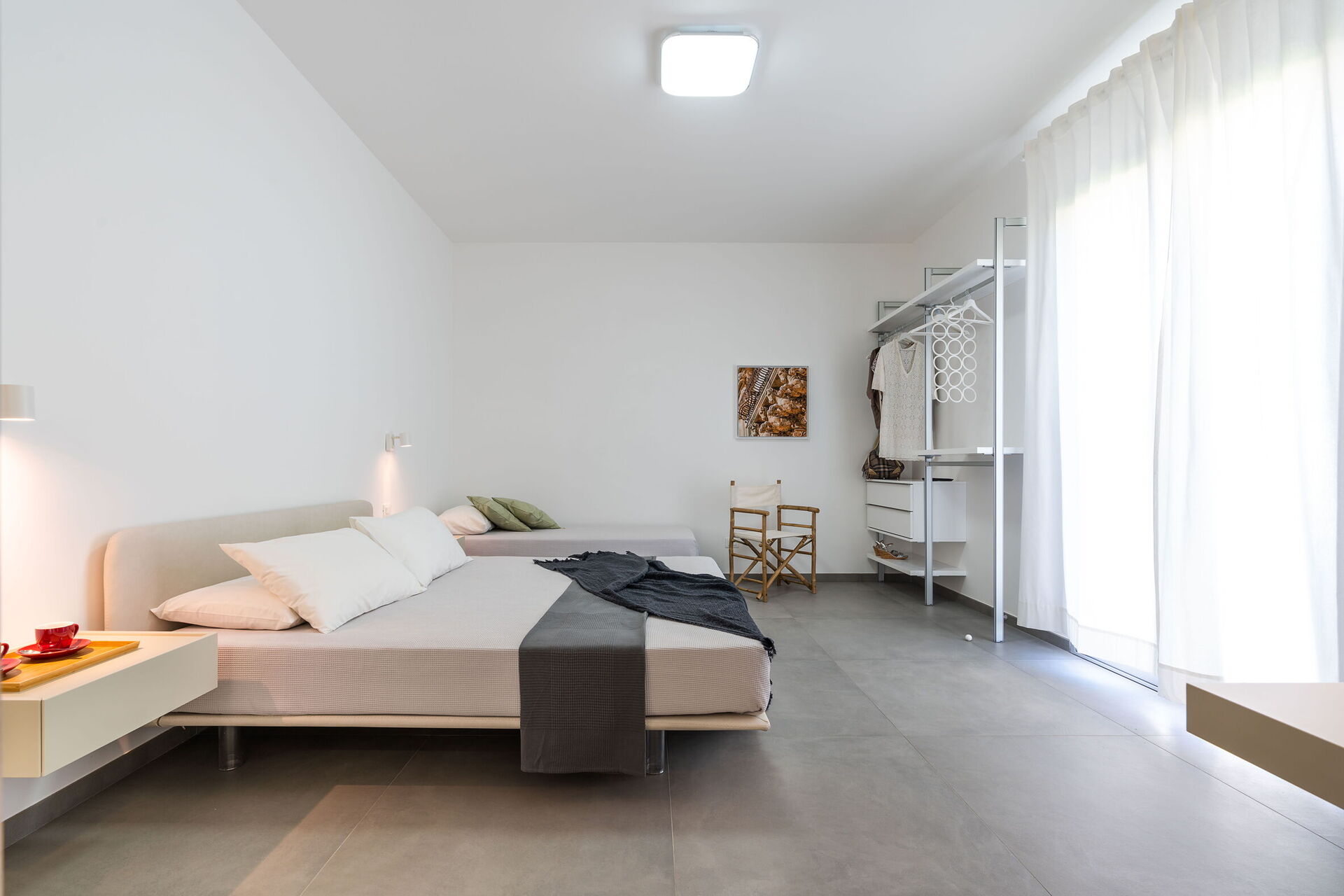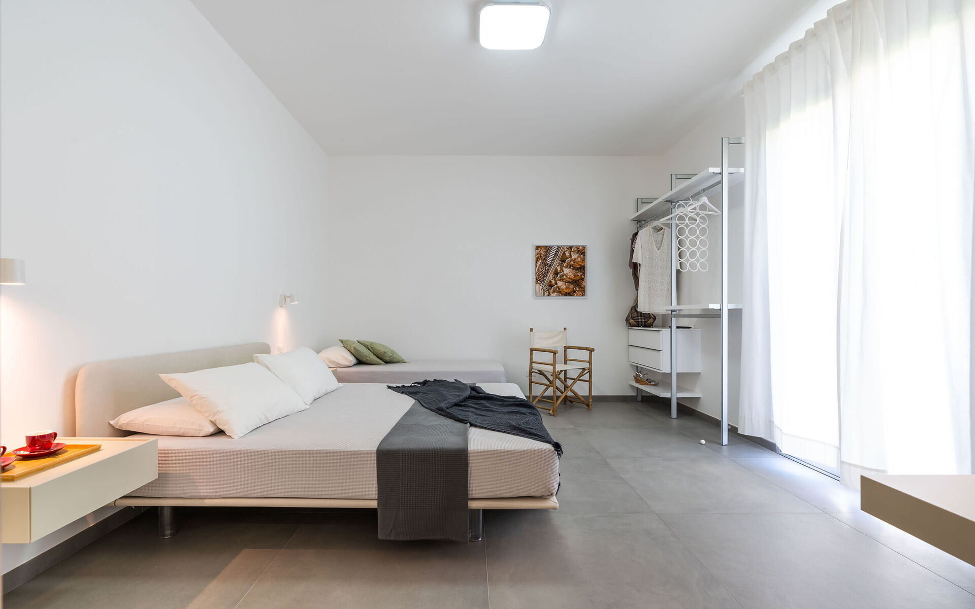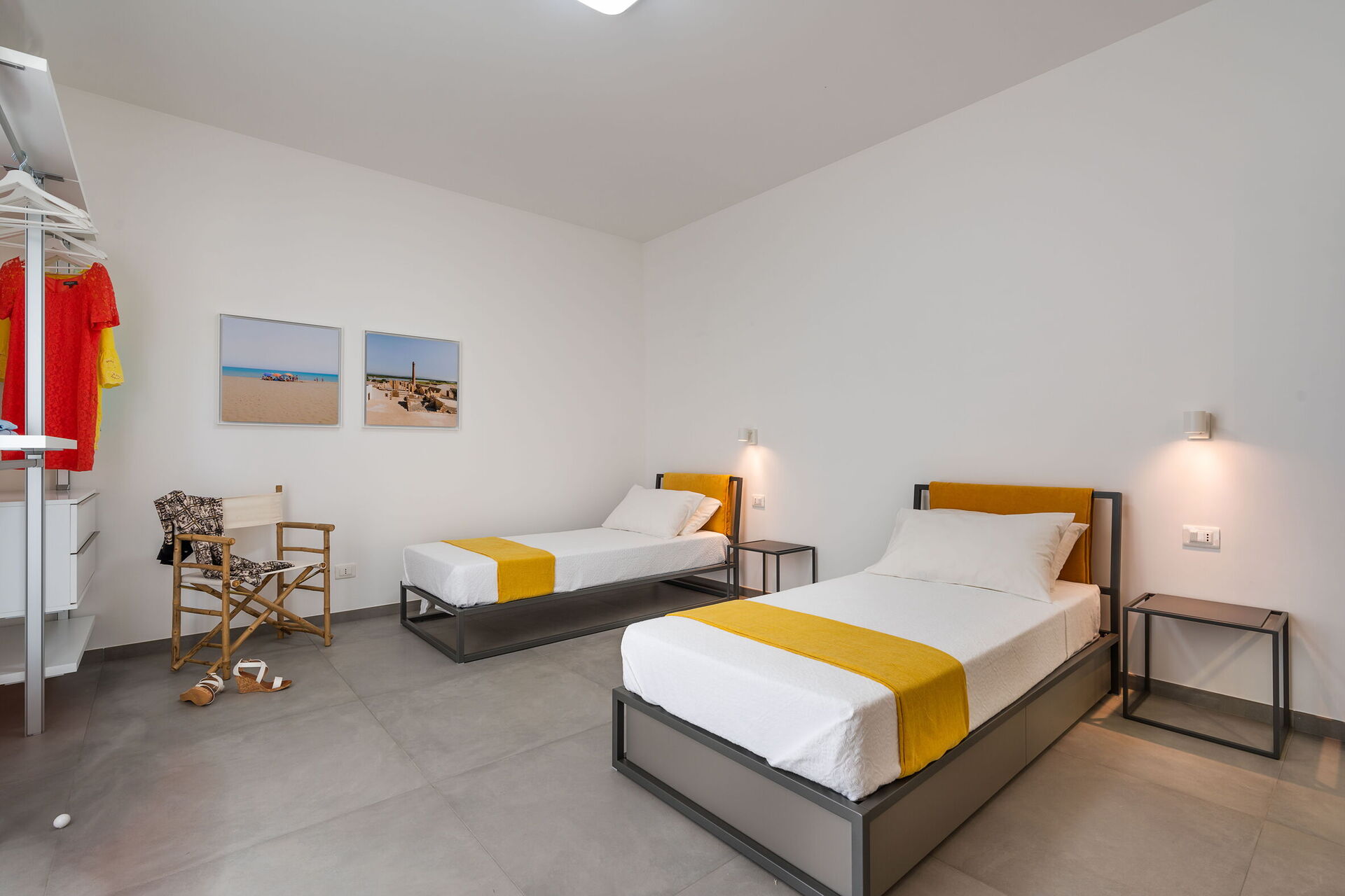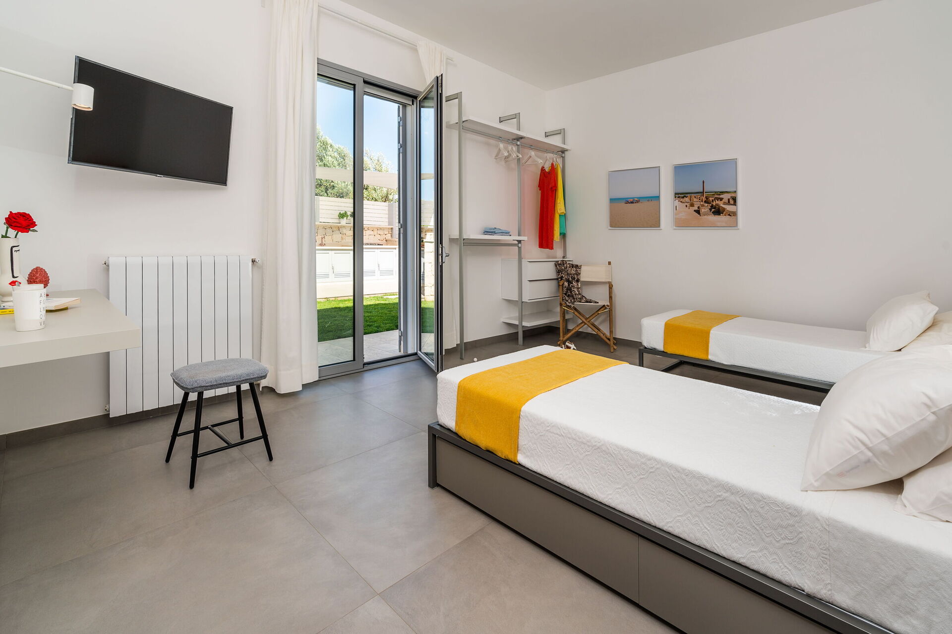 Slaapkamer: twee eenpersoonsbedden, WIFI internet, internet, airconditioning, satelliet tv, fauteuil, bureau, uitgang naar het terras.