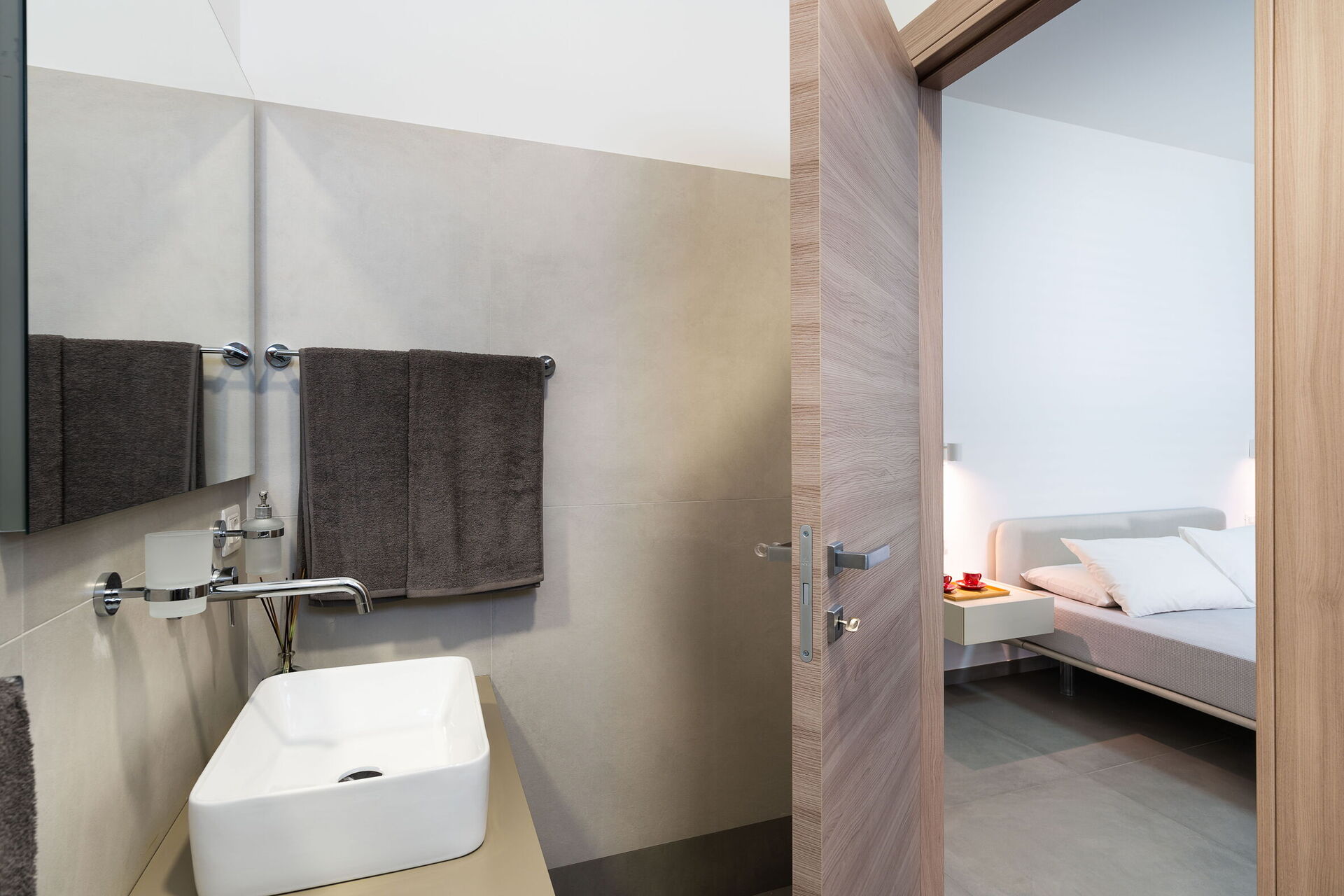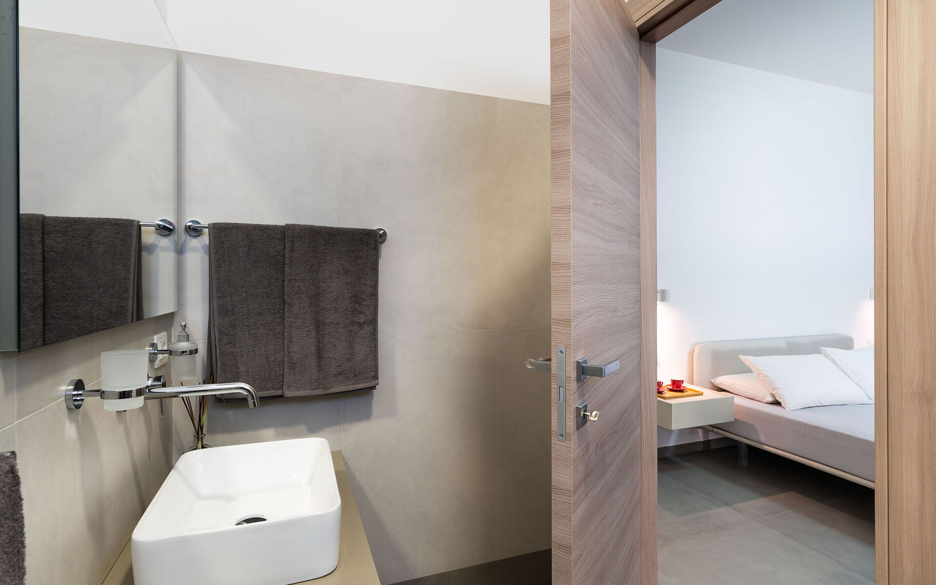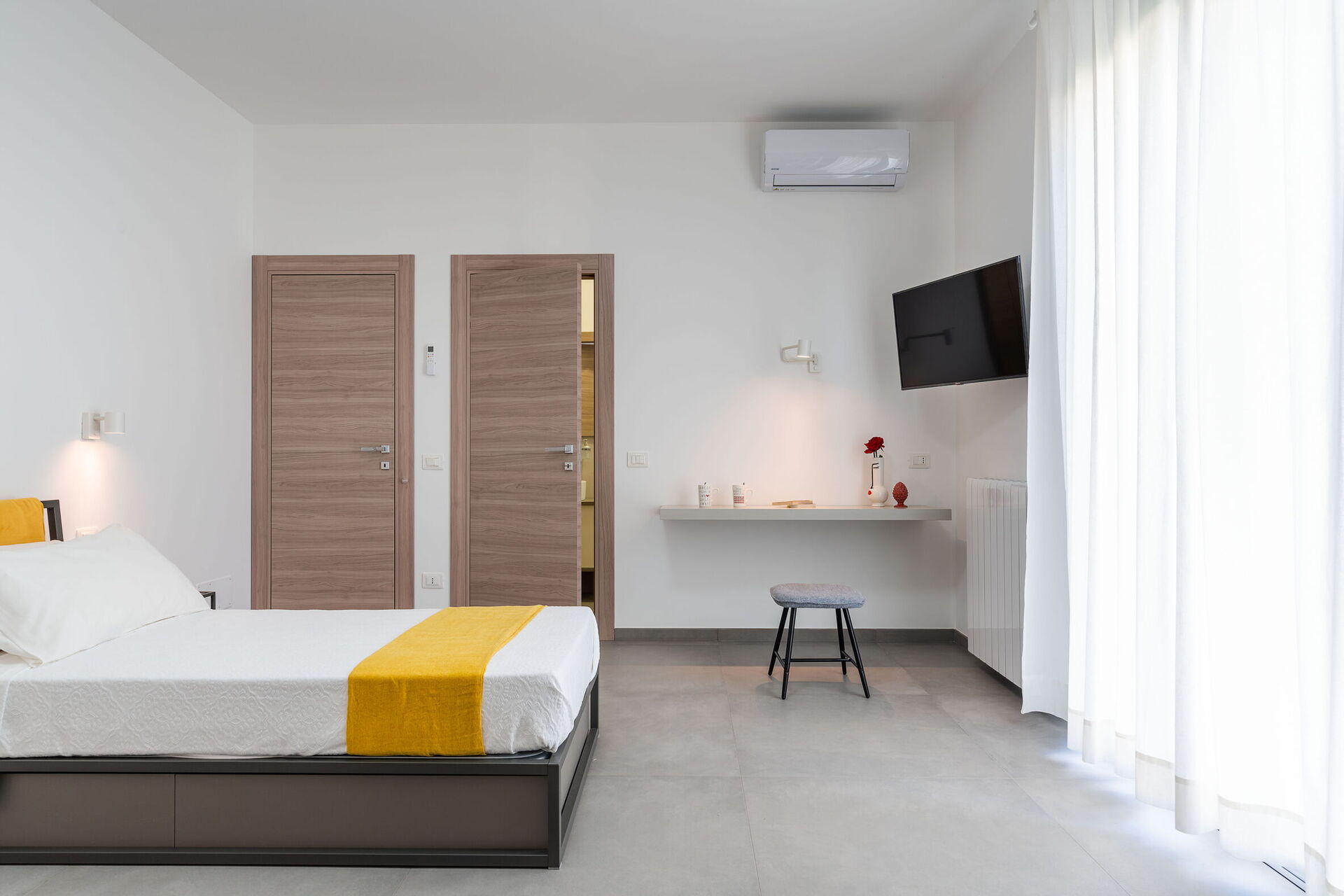 Slaapkamer met badkamer 1: tweepersoonsbed, baby wieg, WIFI internet, internet, airconditioning, hor, satelliet tv, fauteuil, wastafel, toilet , bidet, douche, haardroger, wasmachine, uitgang naar het terras.
