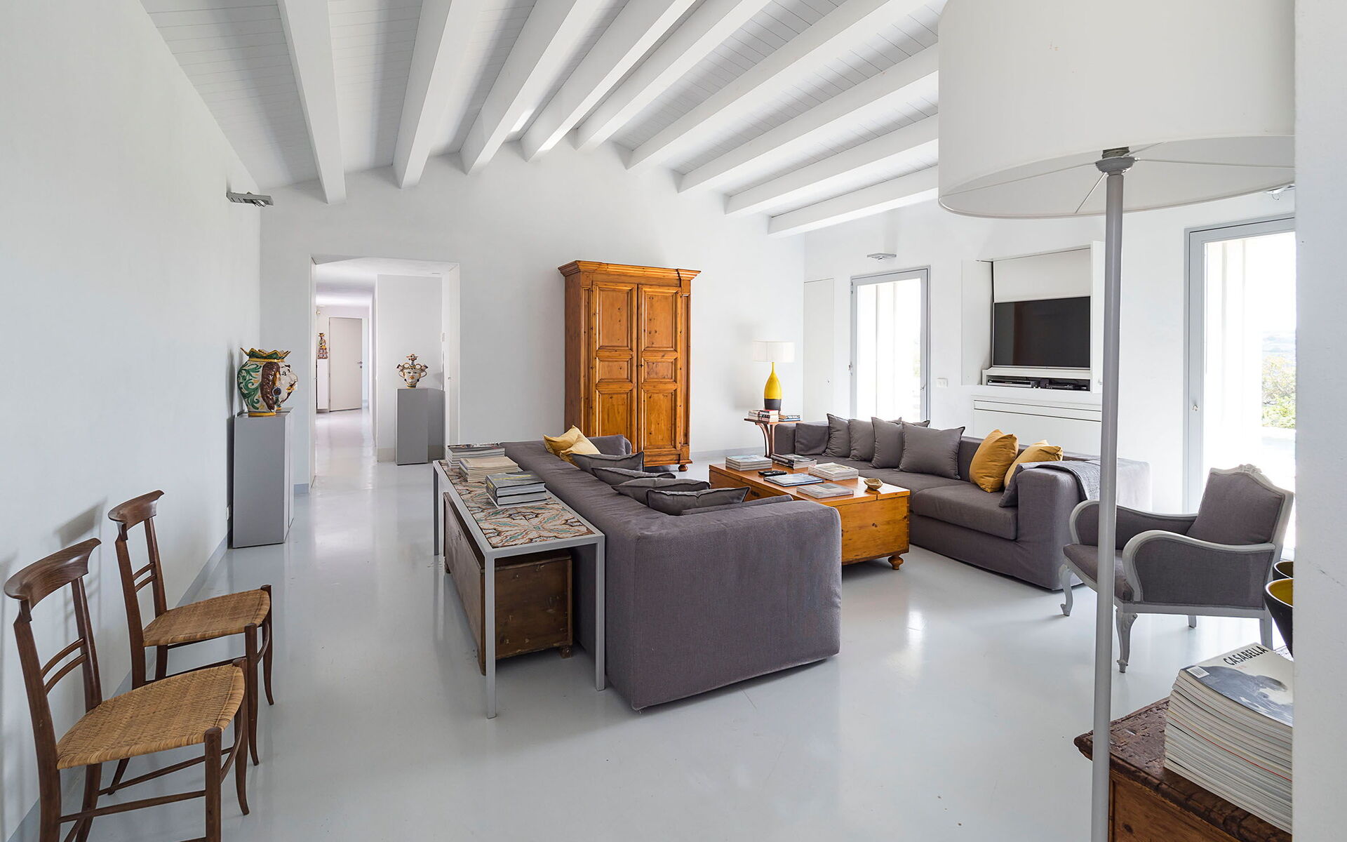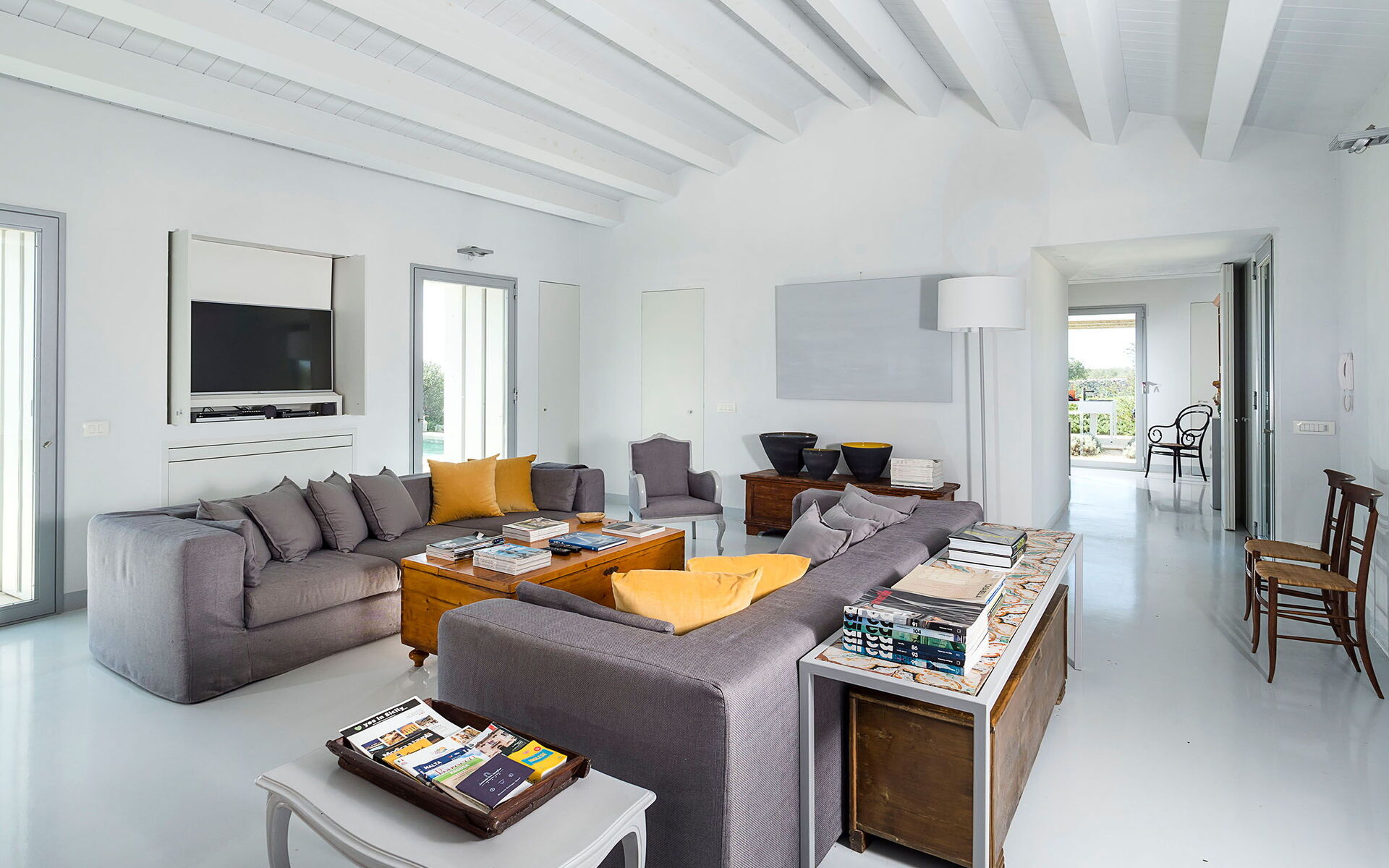Woonkamer: twee banken (personen: 6), fauteuil, WIFI internet, internet, satelliet tv, plafondventilator, stereo , uitgang naar de patio.