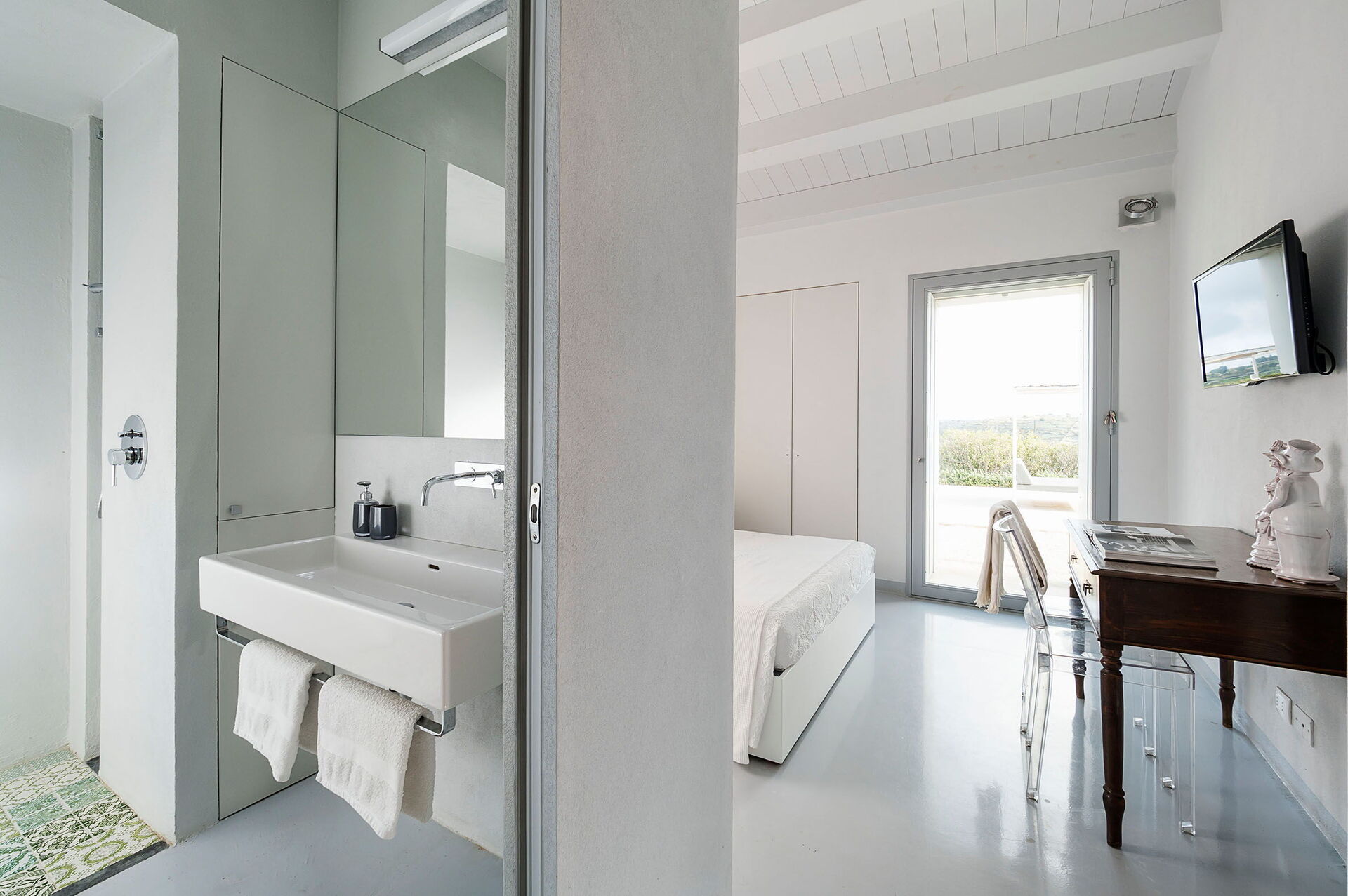 Slaapkamer met badkamer 2: tweepersoonsbed, WIFI internet, internet, airconditioning, hor, satelliet tv, wastafel, toilet , bidet, douche, uitgang naar de patio.
