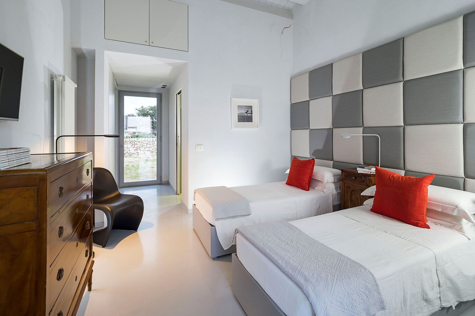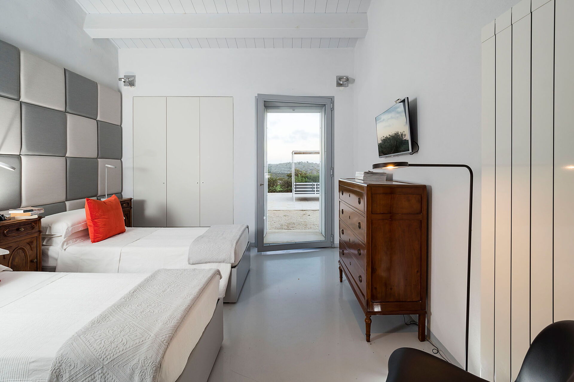Slaapkamer met badkamer 3: twee eenpersoonsbedden, WIFI internet, internet, airconditioning, hor, satelliet tv, fauteuil, wastafel, toilet , bidet, bad, uitgang naar de patio.
