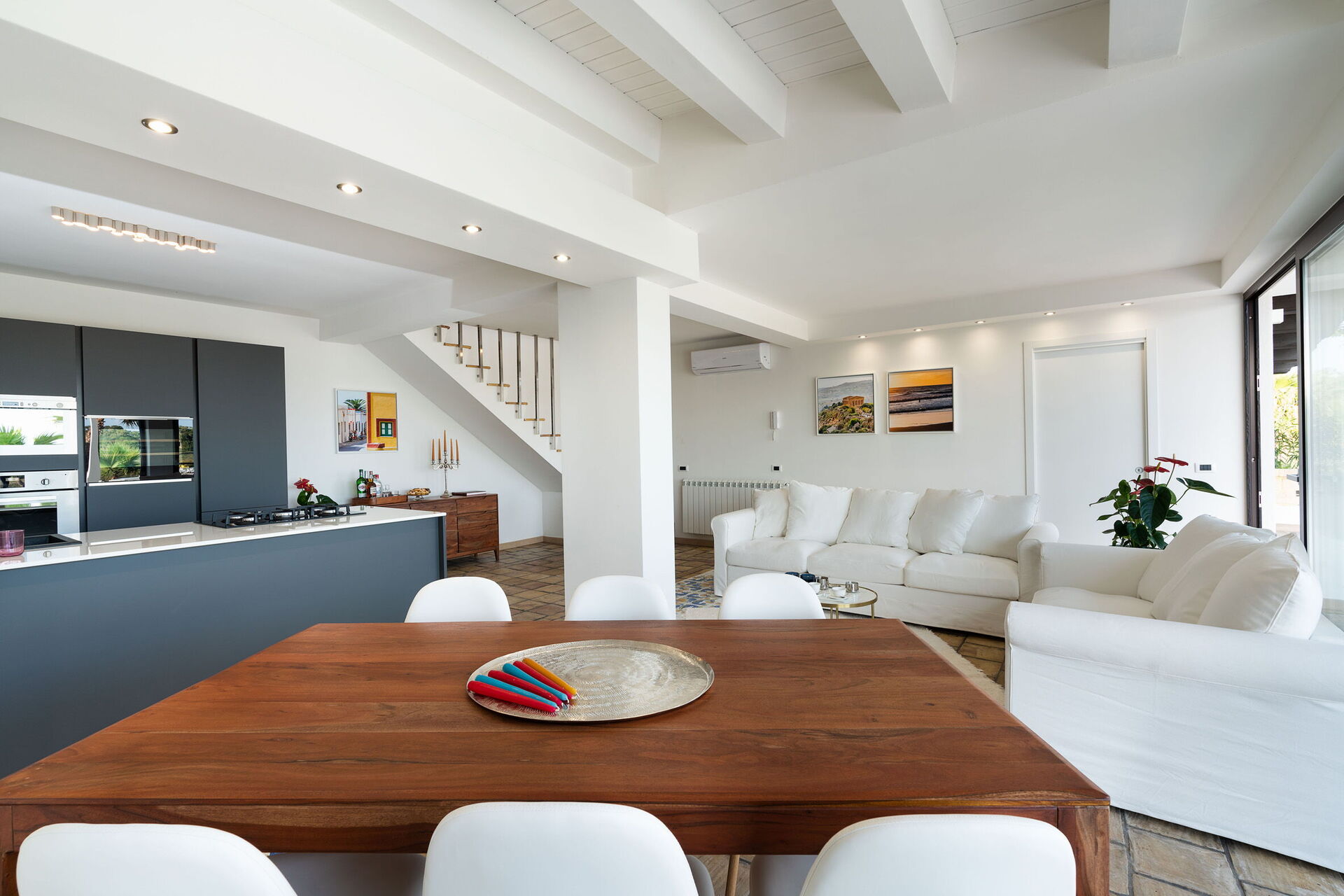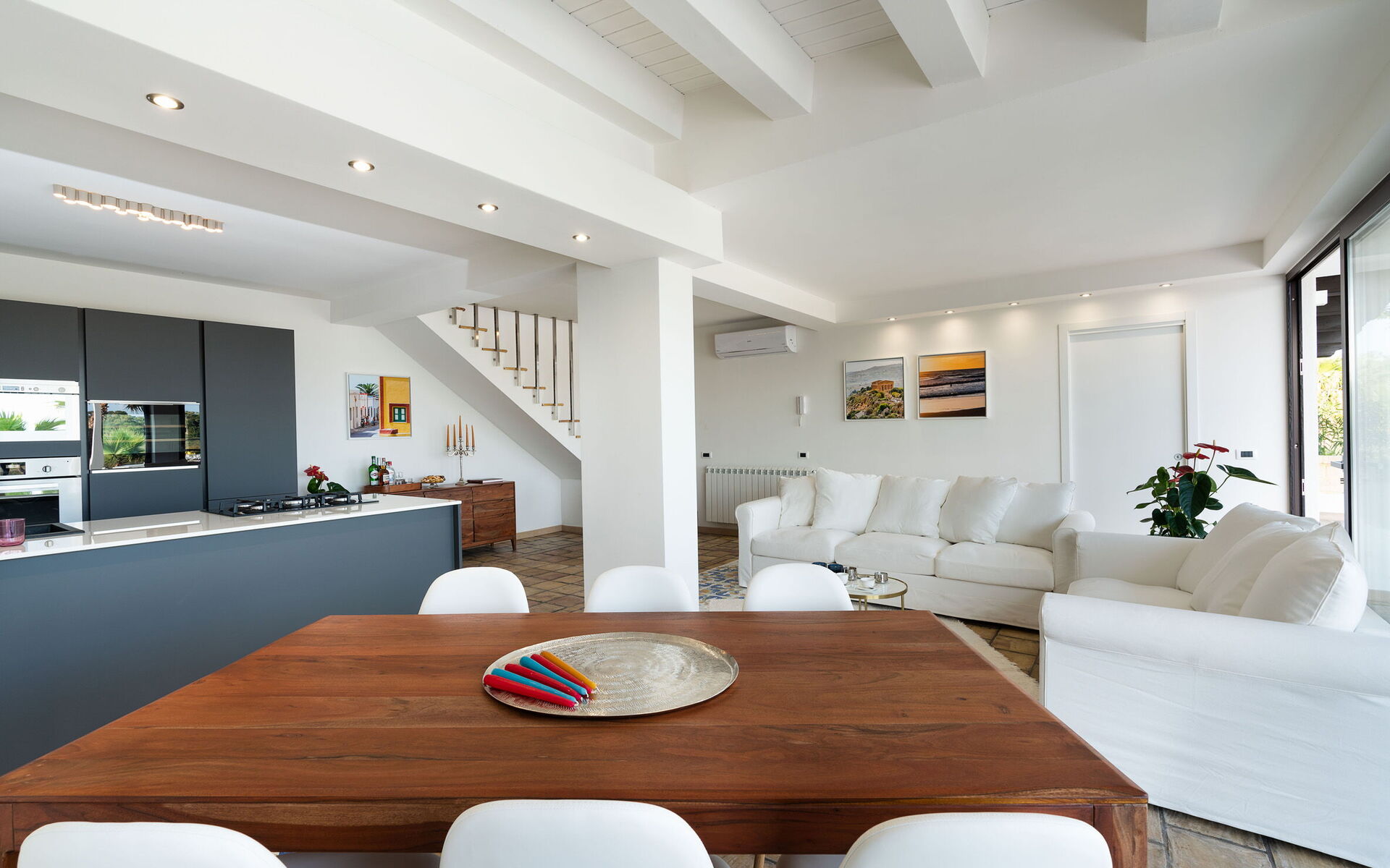 Keuken – woonkamer: goed uitgeruste keuken, eettafel (personen: 6), vaatwasser, ijskast, diepvriezer, magnetron, kookplaat, oven, broodrooster, strijkijzer, italiaans koffiezetapparaat, koffiezetapparaat, bank (personen: 6), WIFI internet, internet, airconditioning, kinderstoel, satelliet tv, rookmelder, co2 detector, uitgang naar het terras.