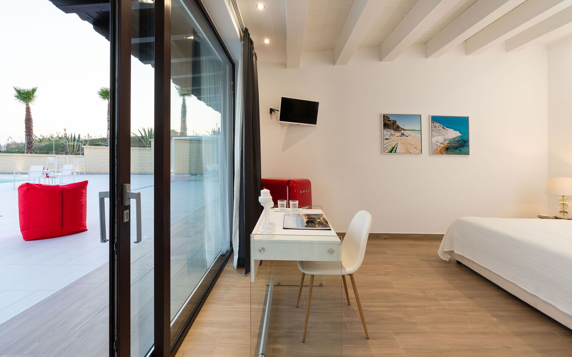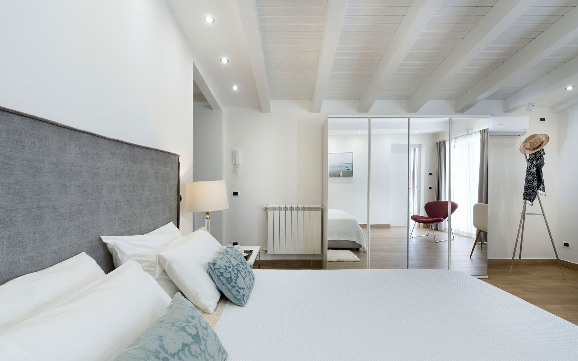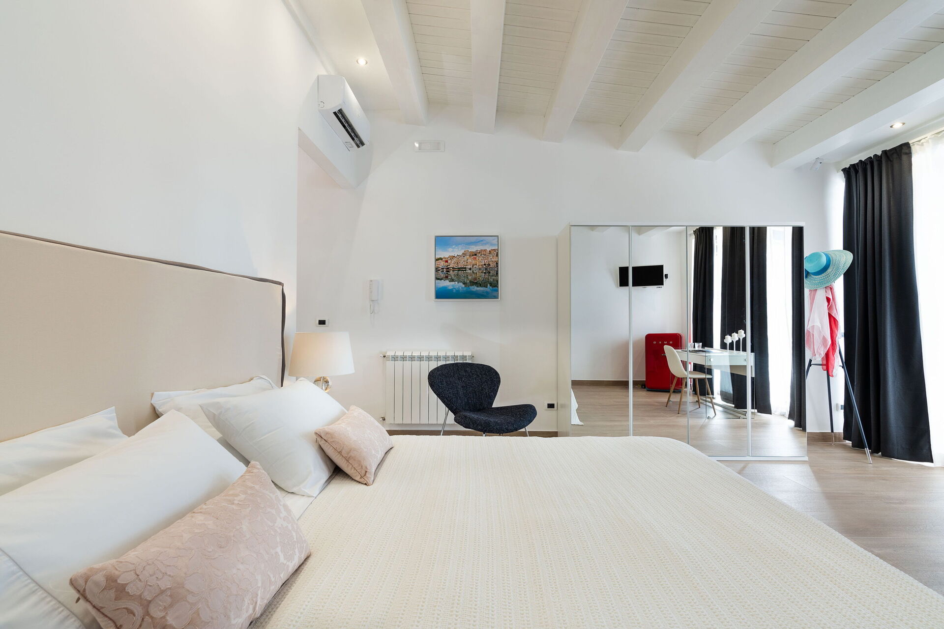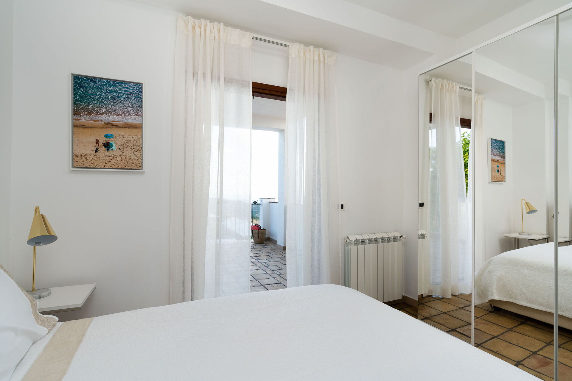 Slaapkamer: tweepersoonsbed, WIFI internet, internet, airconditioning, tv, fauteuil, bureau, uitgang naar het terras.