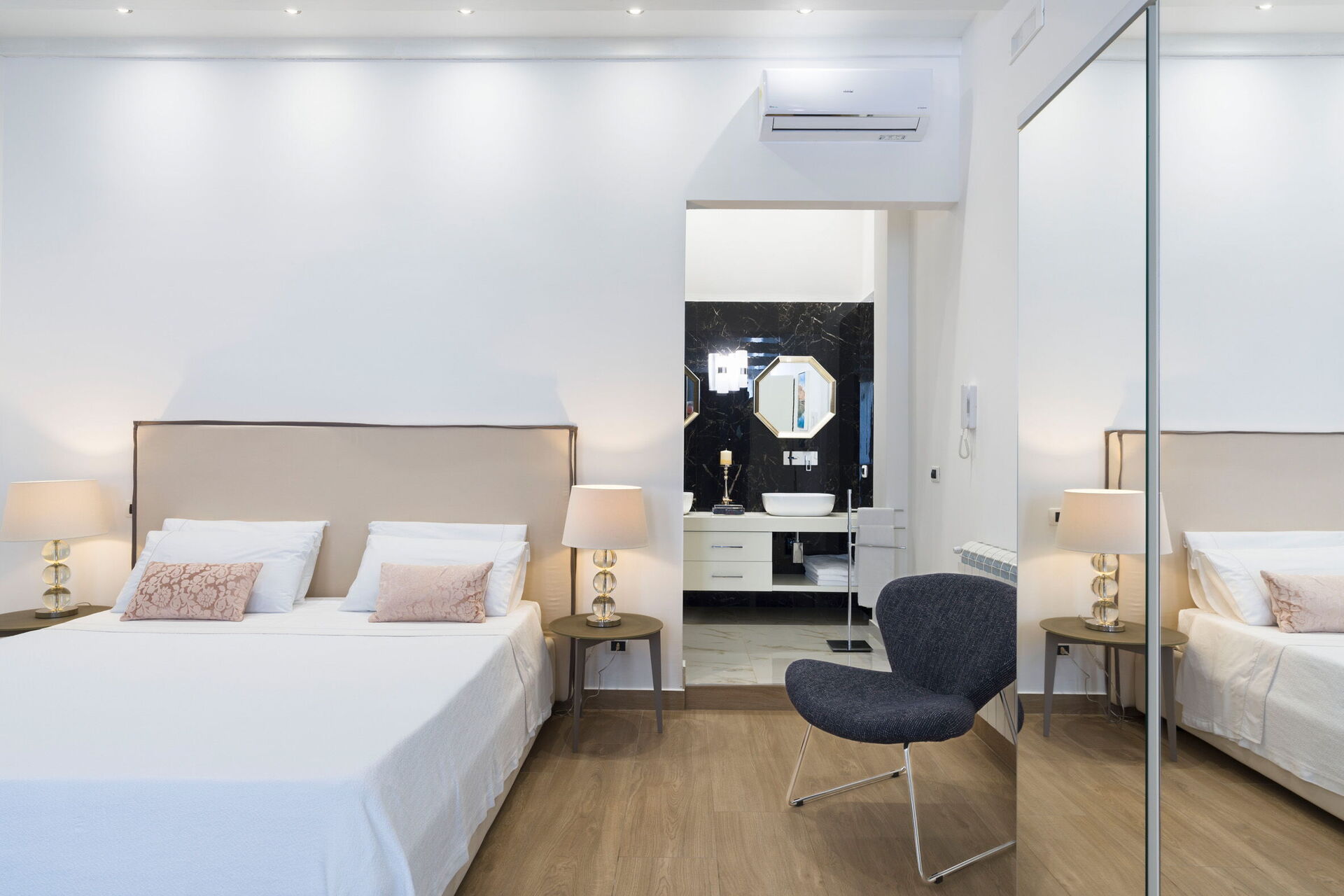 Slaapkamer met badkamer: tweepersoonsbed, baby wieg, WIFI internet, internet, airconditioning, fauteuil, wastafel, toilet , bidet, douche.