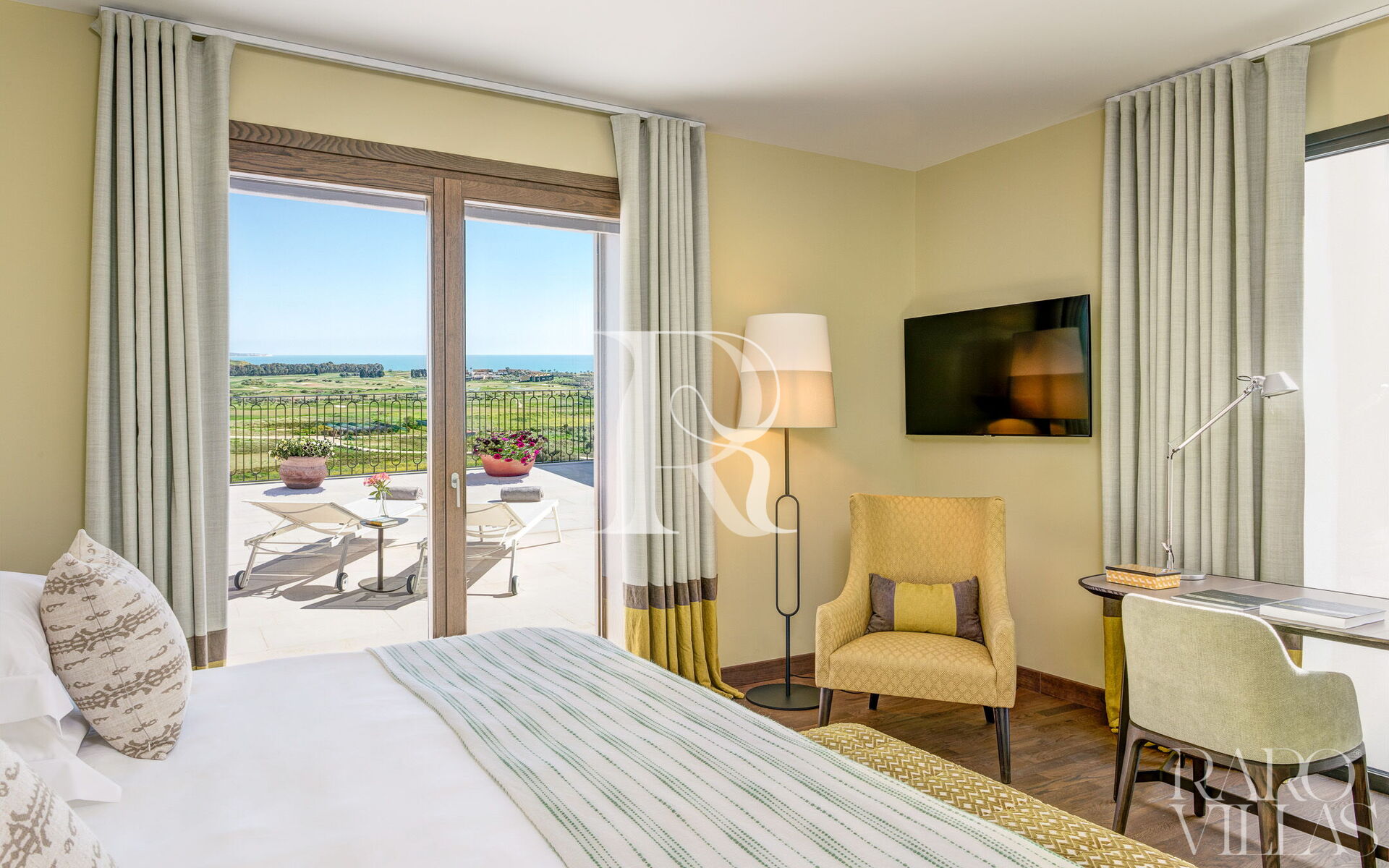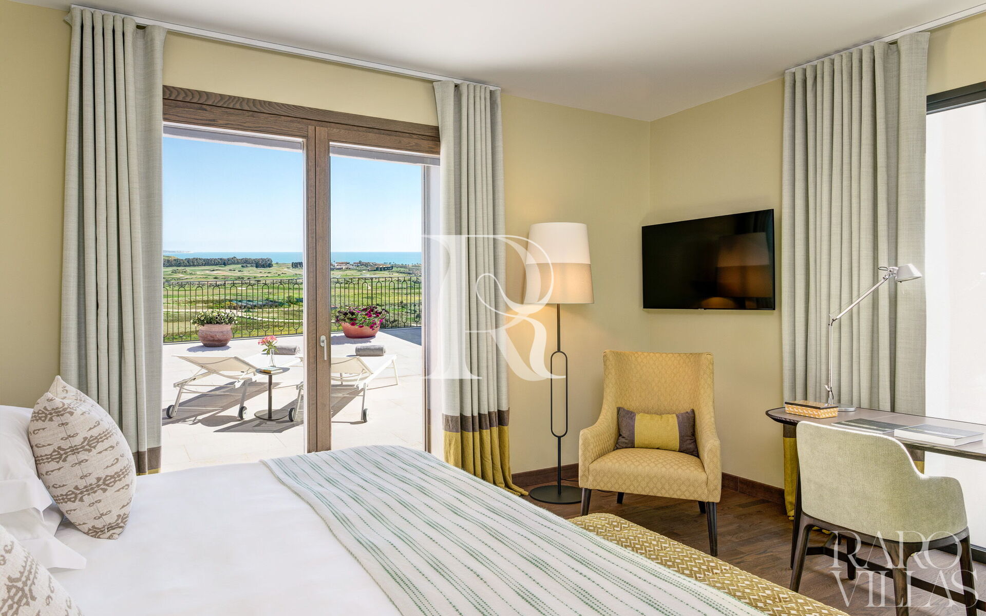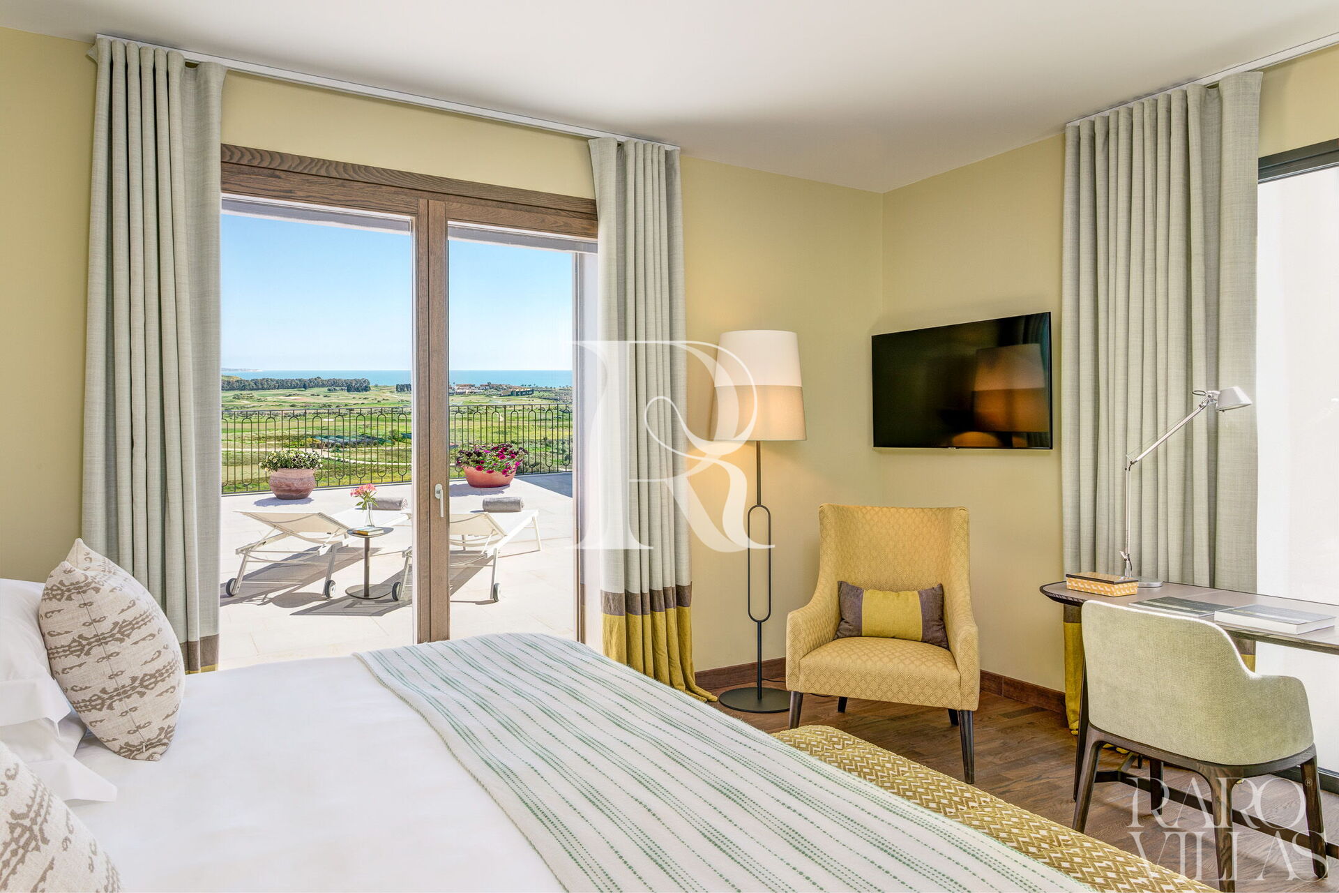 With three en suite bedrooms on the first floor and the fourth bedroom located in an external dependance, each room comes with a king-sized bed and a private terrace that offers stunning views of the verdant golf courses and the Mediterranean Sea. Wake up to the gentle caress of the Sicilian sun and enjoy your morning coffee while taking in the breathtaking scenery.