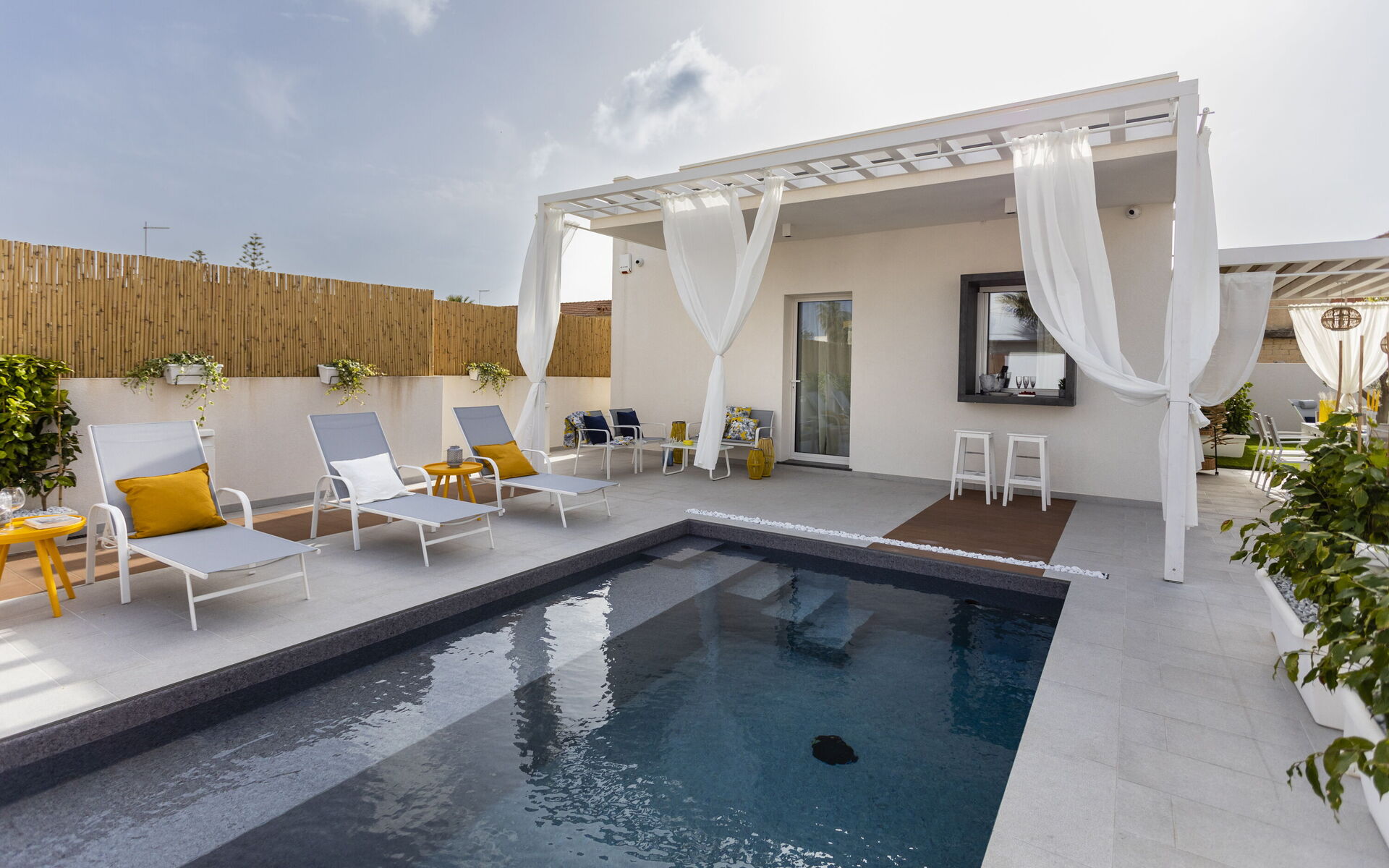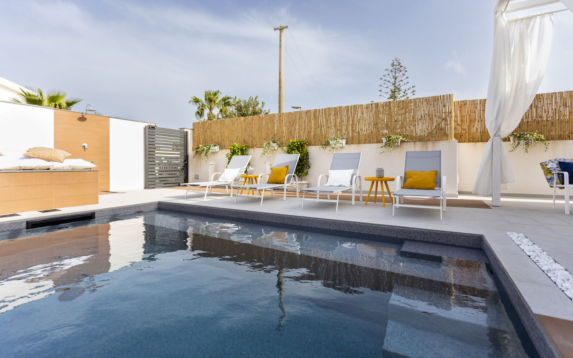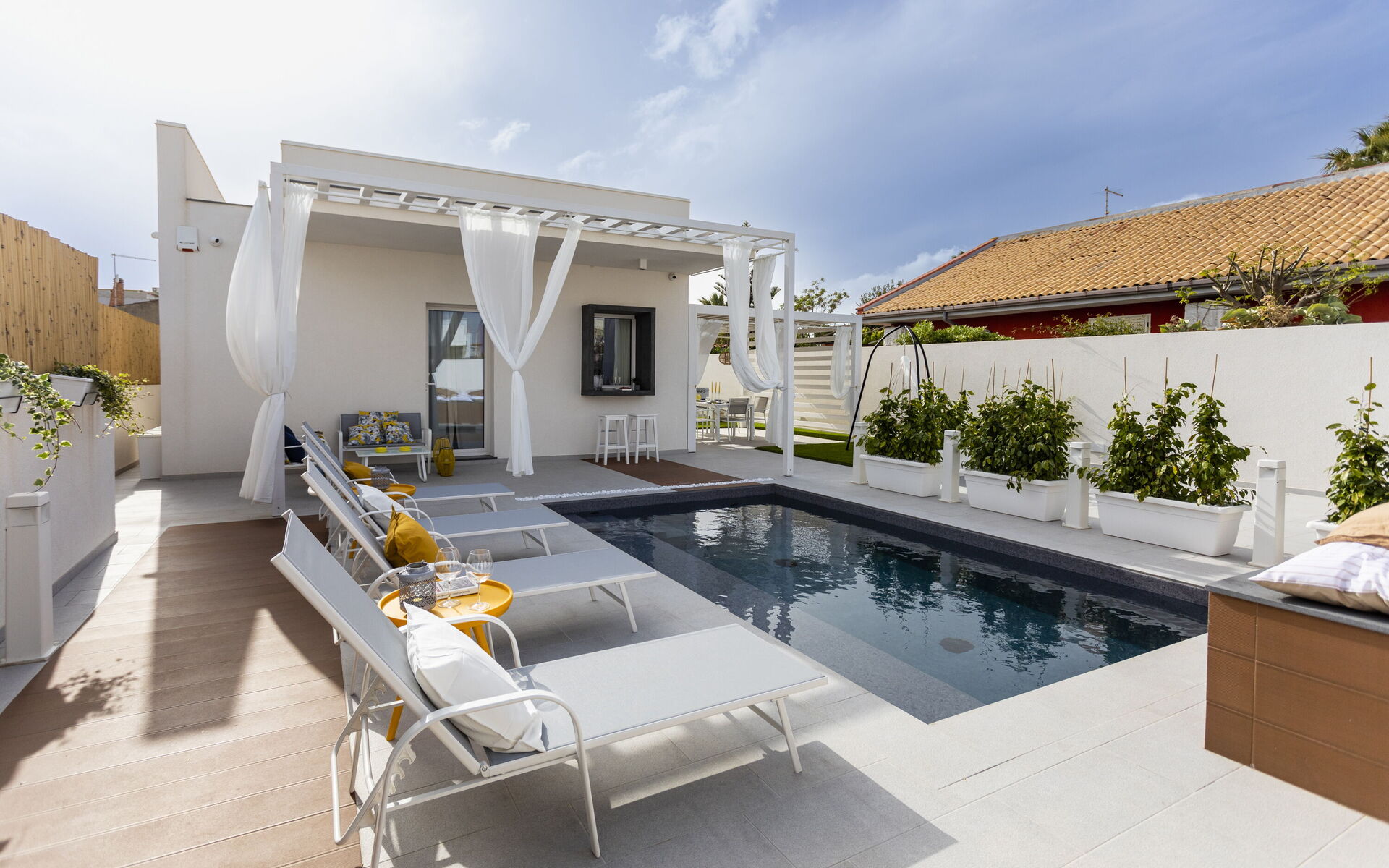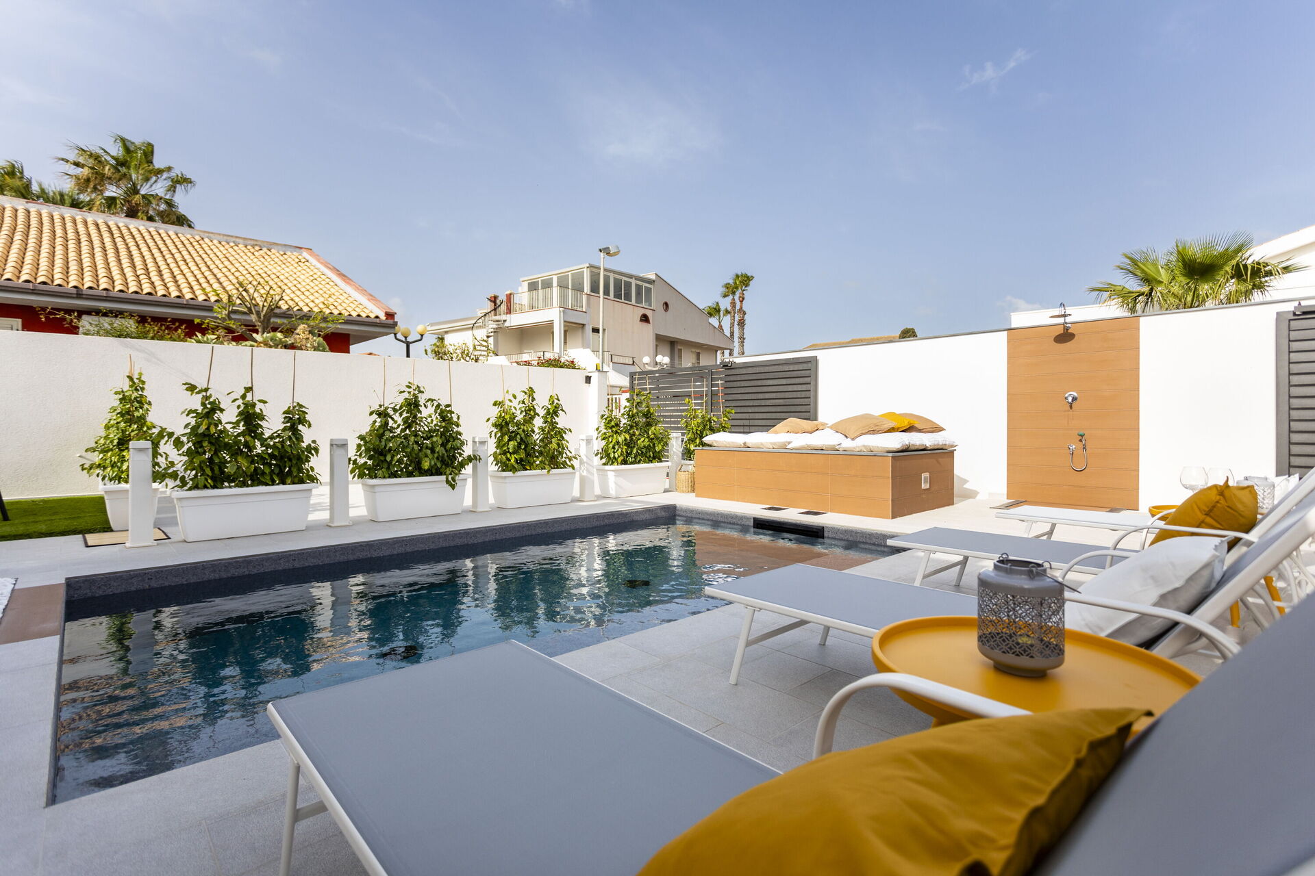The holiday home in Sicily with pool is located in Santa Maria del Focallo, about 80 meters from the beach which, for its beauty, cleanliness and transparency of the sea, has been awarded the Blue Flag.