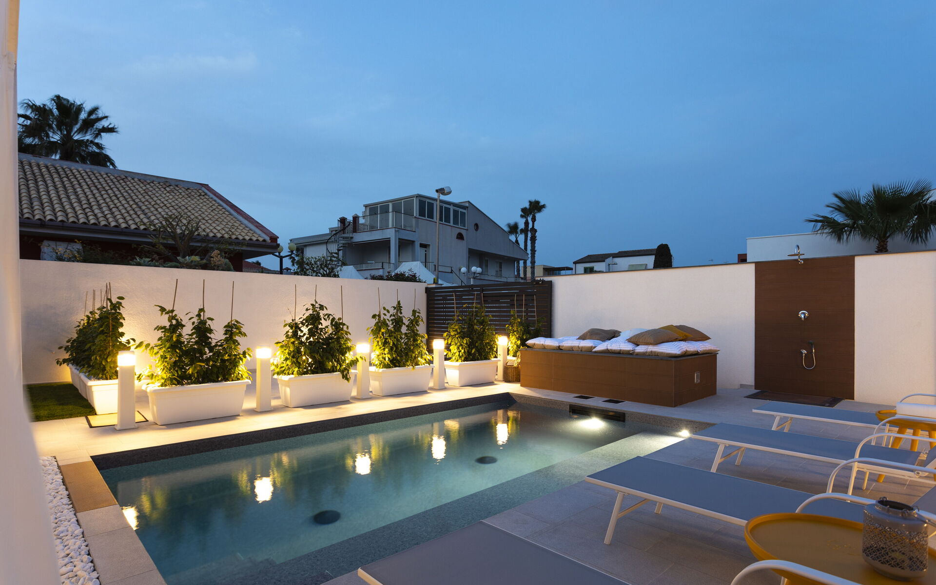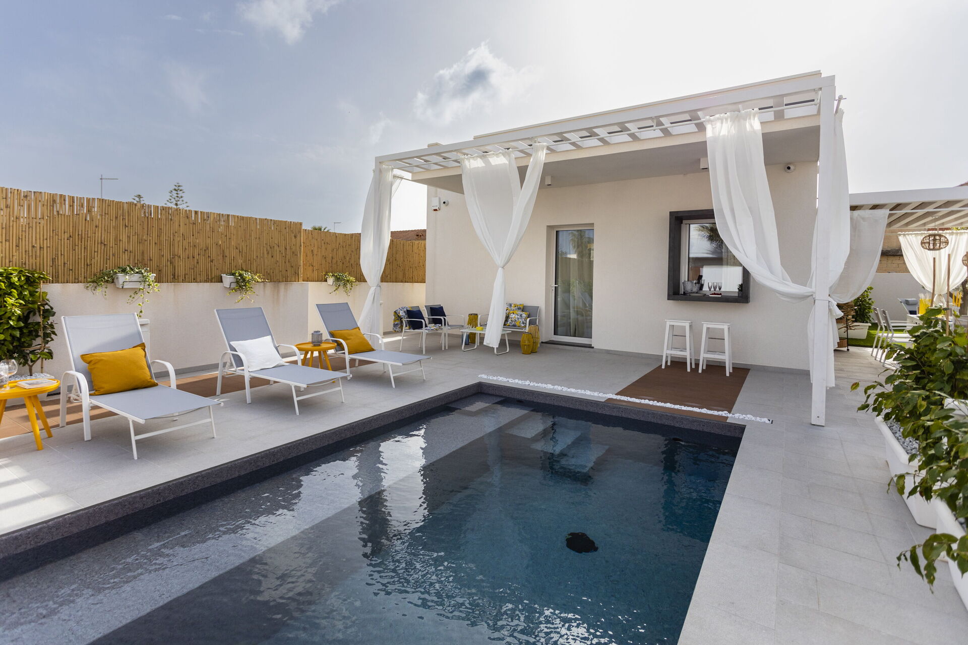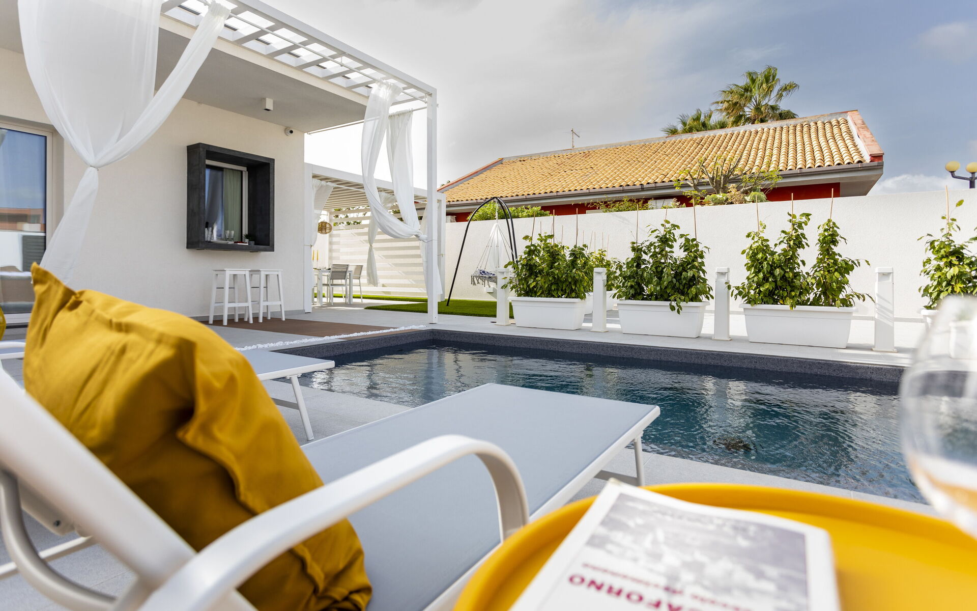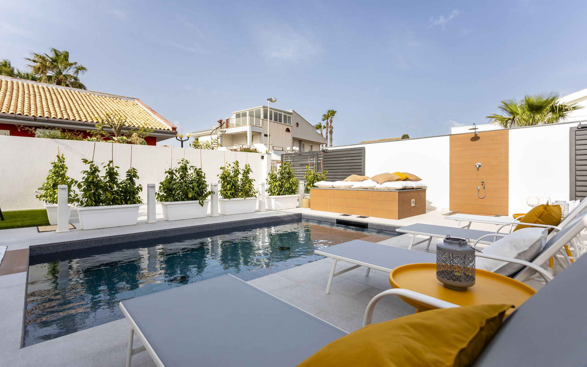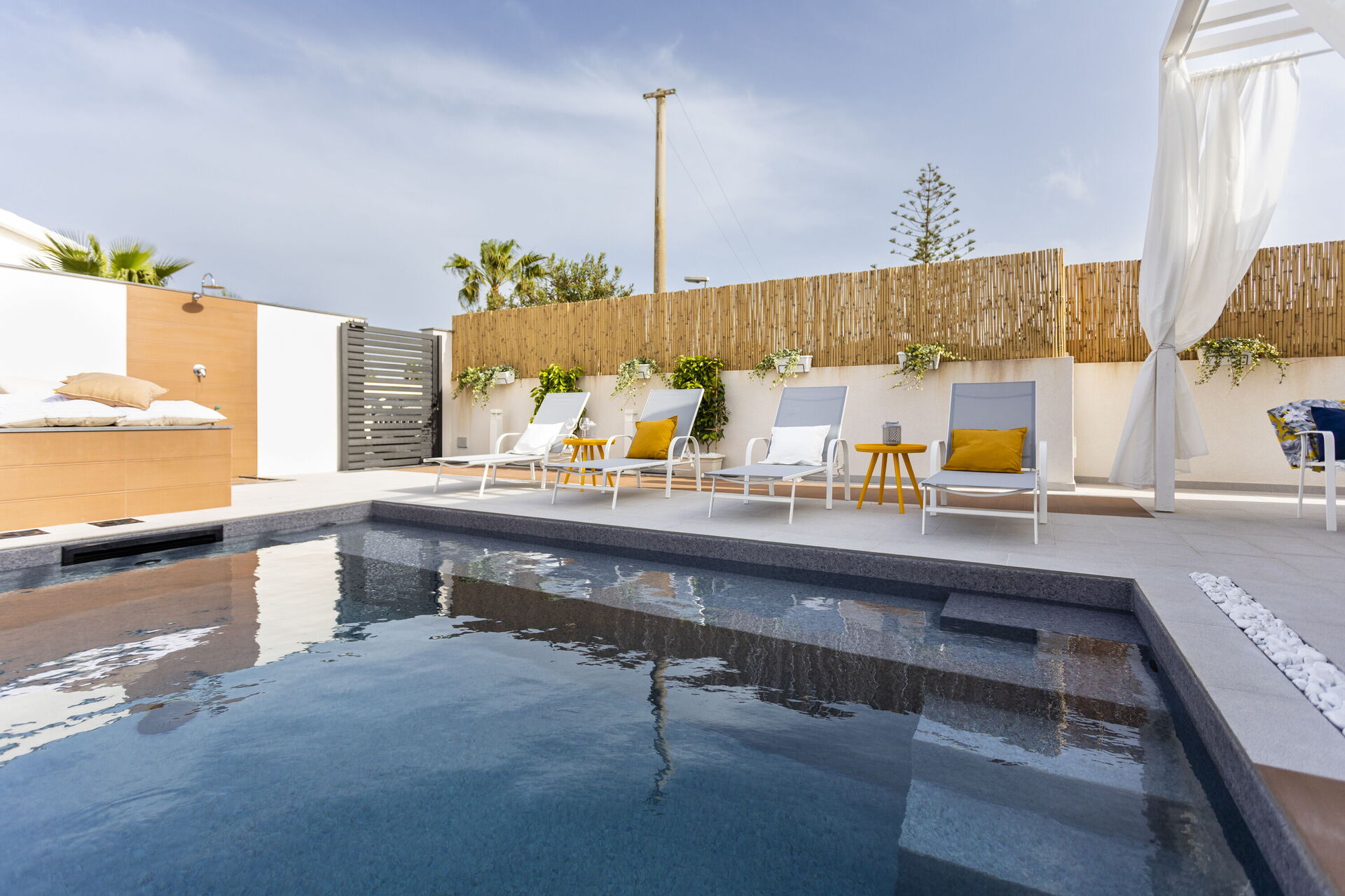 The holiday home in Sicily with pool is located in Santa Maria del Focallo, about 80 meters from the beach which, for its beauty, cleanliness and transparency of the sea, has been awarded the Blue Flag.