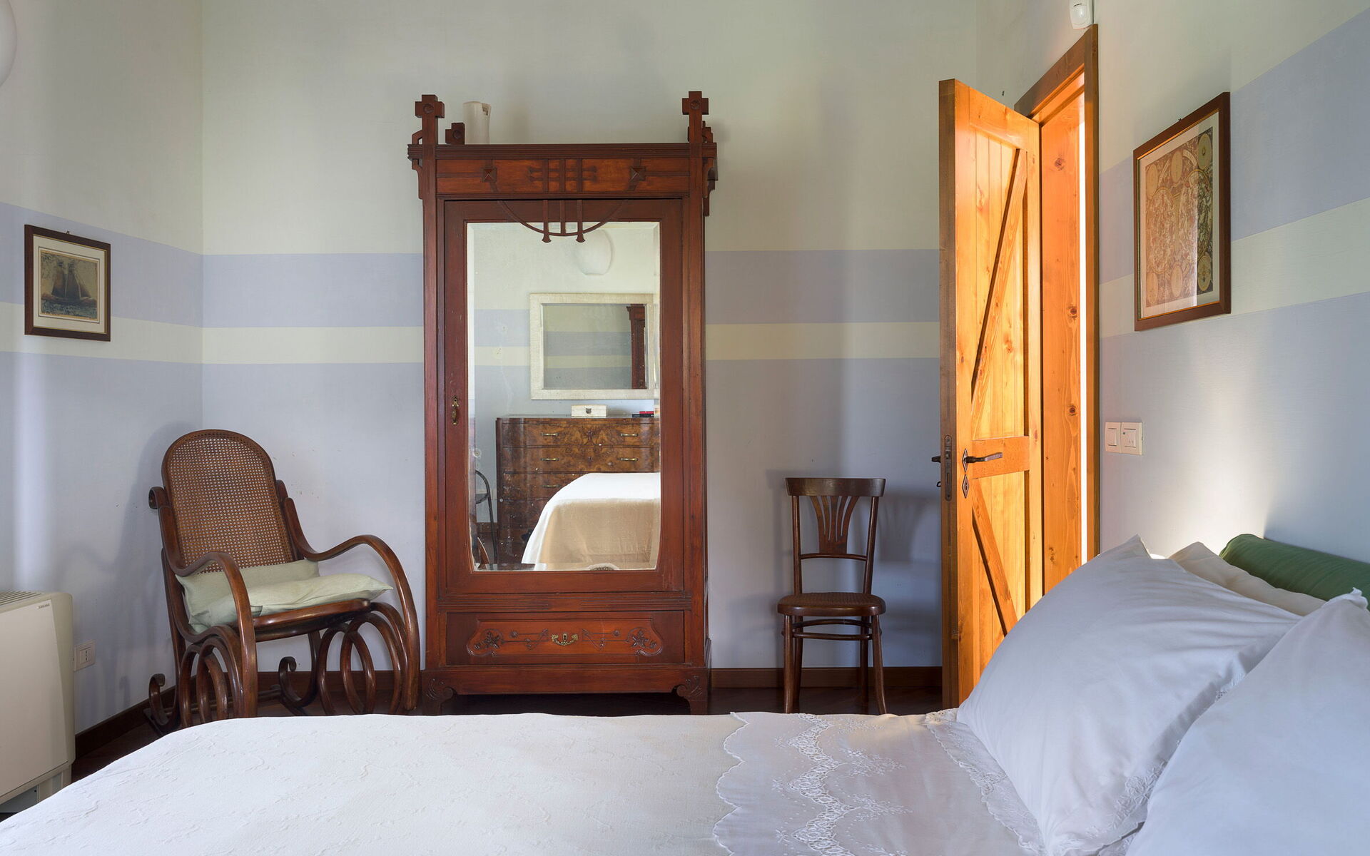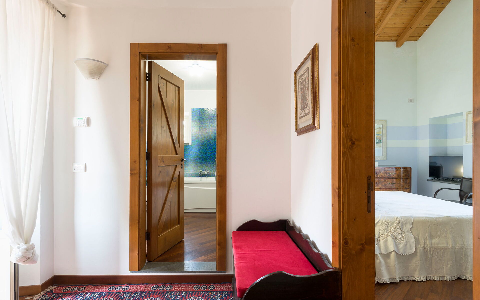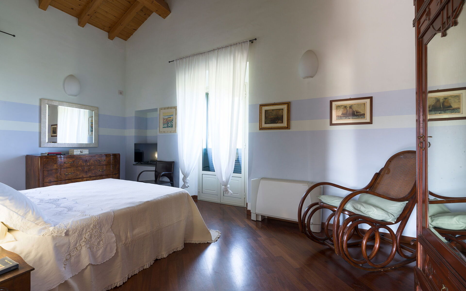 Slaapkamer met badkamer: tweepersoonsbed, baby wieg, WIFI internet, internet, airconditioning, tv, fauteuil, dubbele wastafel, toilet , bidet, bad, douche.
