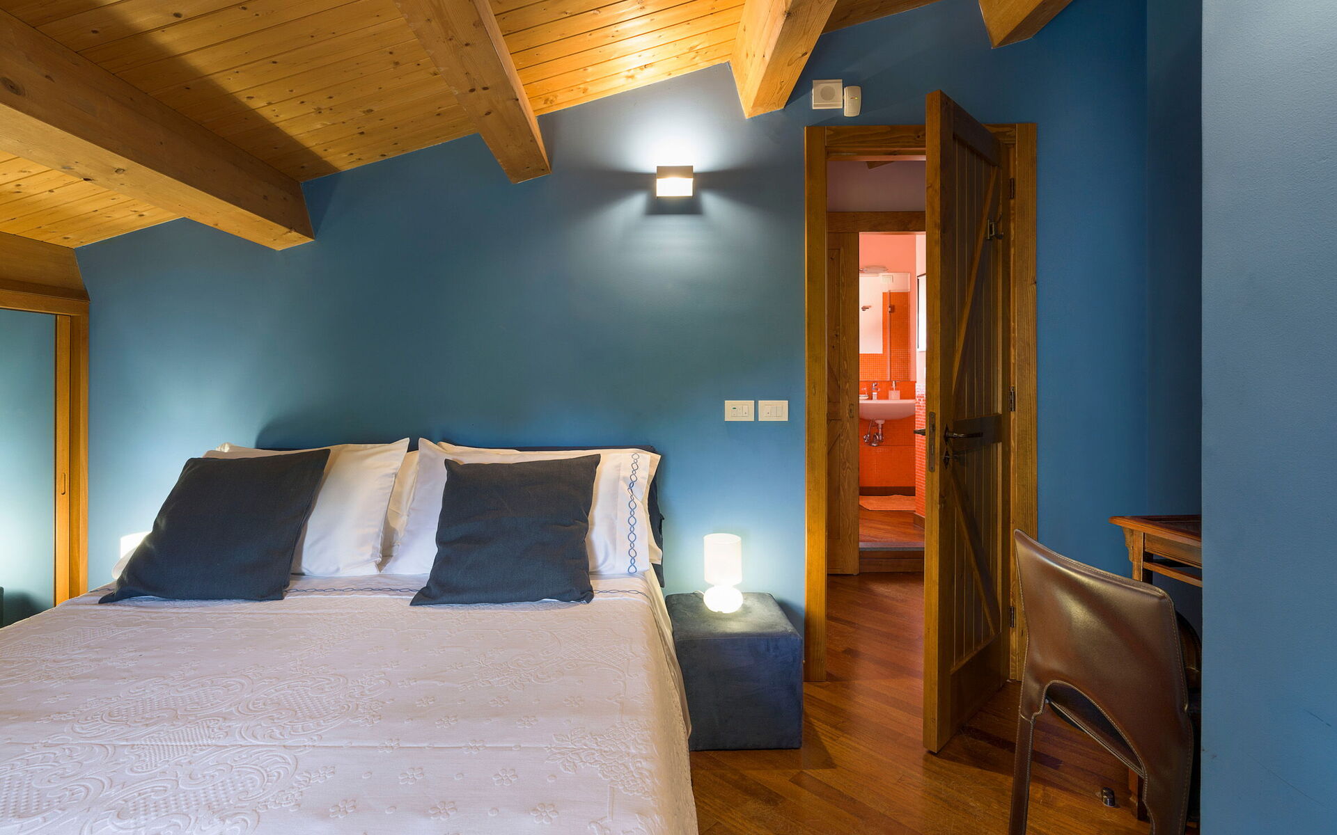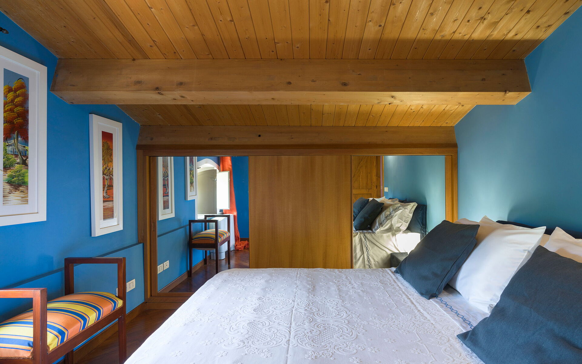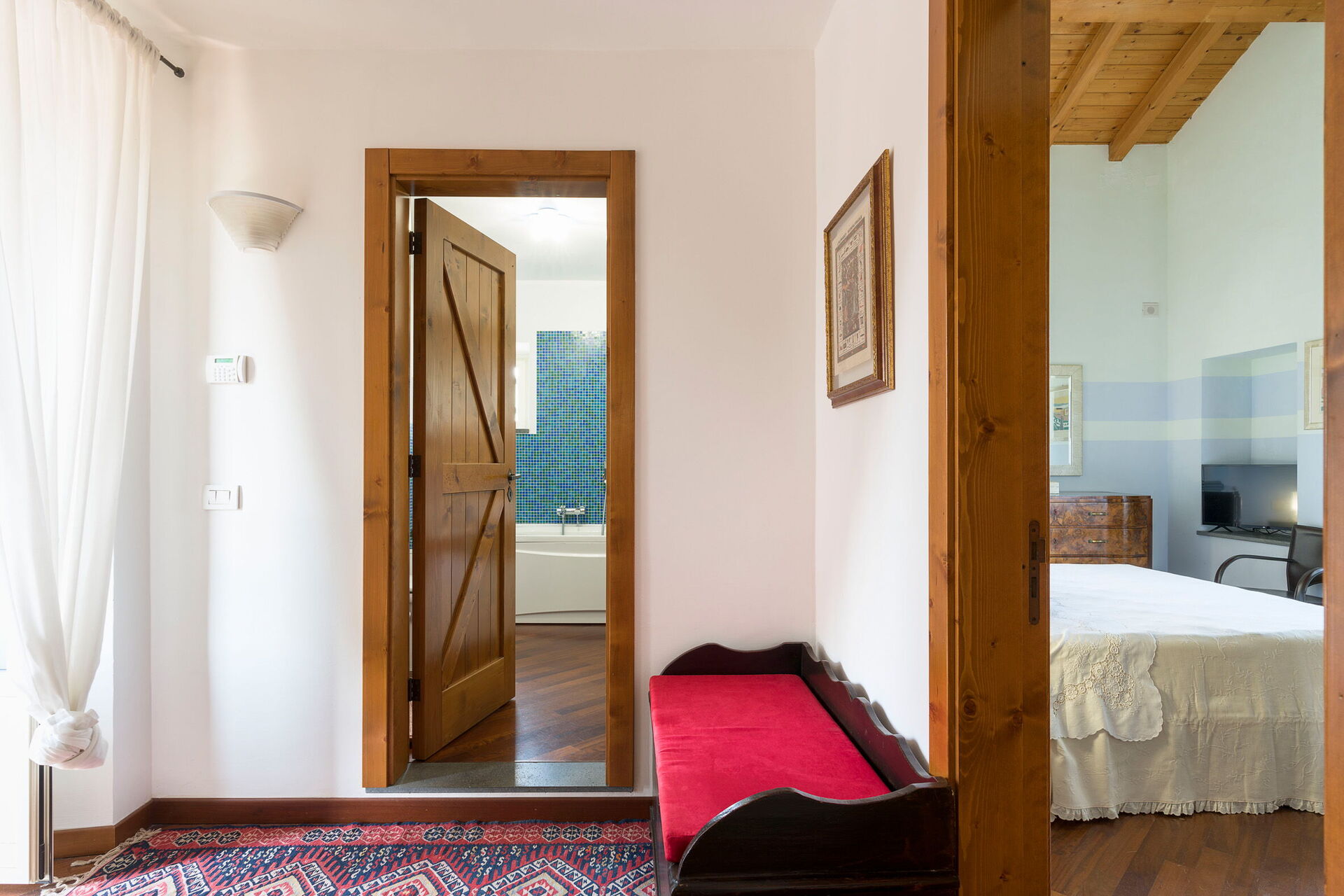 Slaapkamer met badkamer: tweepersoonsbed, baby wieg, WIFI internet, internet, airconditioning, tv, fauteuil, dubbele wastafel, toilet , bidet, bad, douche.
