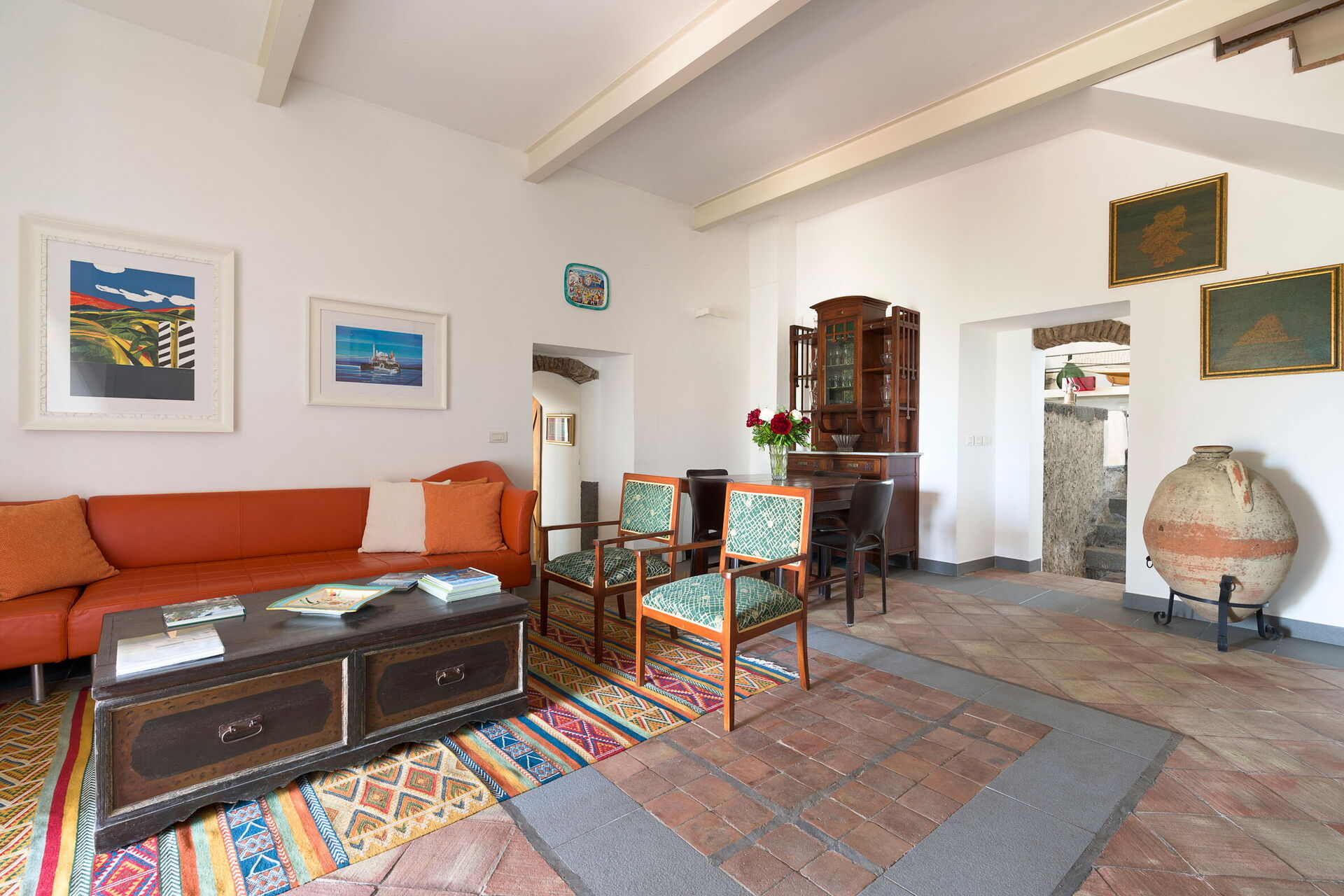 Woonkamer: drie banken (personen: 8), twee fauteuils, open haard, eettafel (personen: 6), WIFI internet, internet, airconditioning, tv.