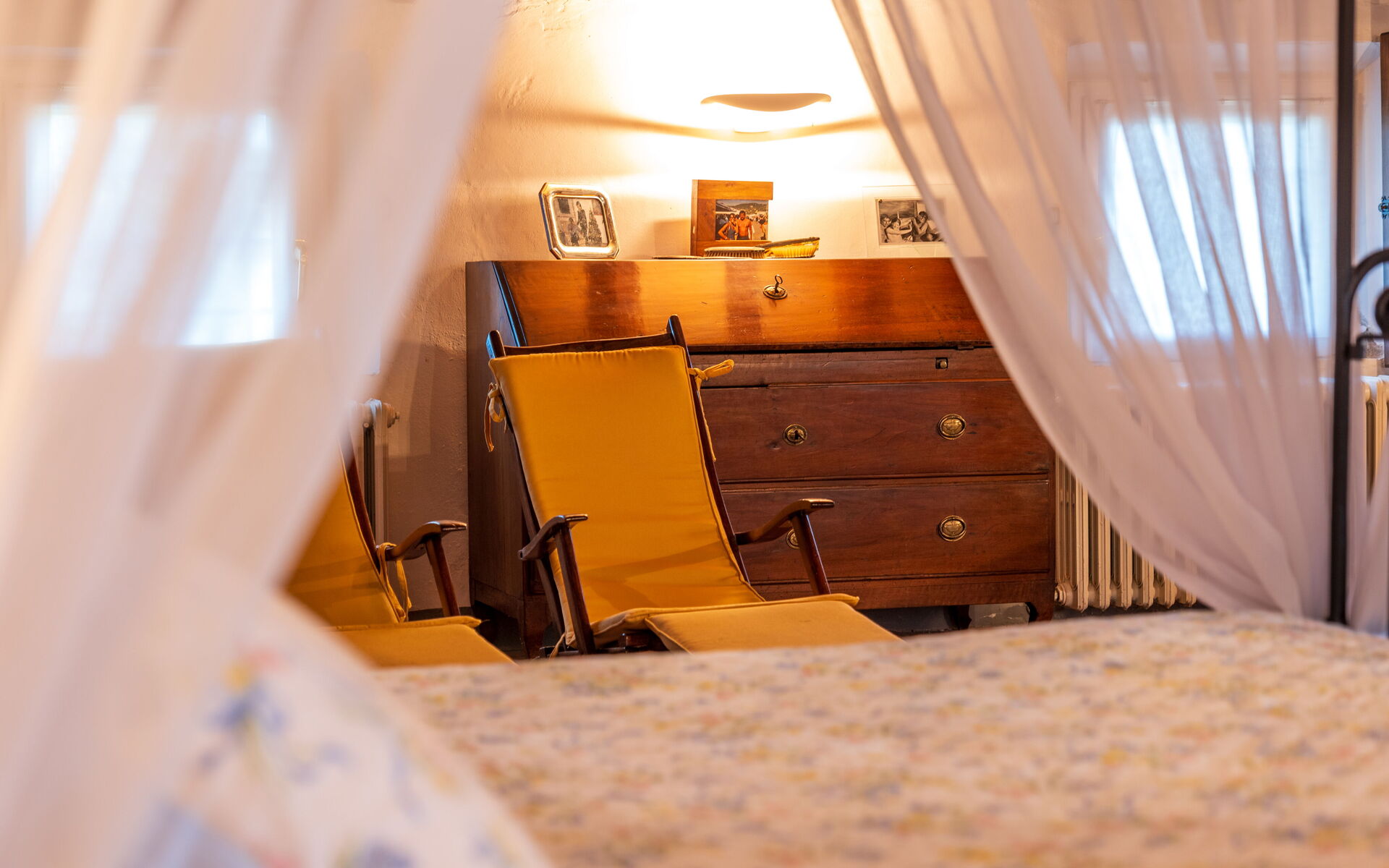 Slaapkamer: tweepersoonsbed, WIFI internet, hor, satelliet tv, tv, ventilator, twee fauteuils, bureau, open haard.