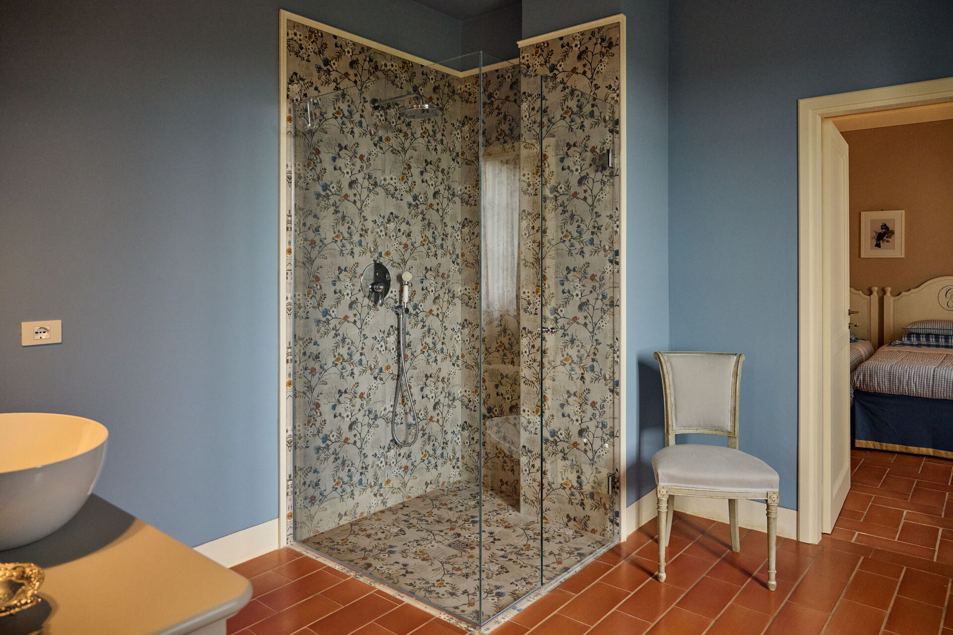 Eerste verdieping: slaapkamer met tweepersoonsbed met eigen badkamer met douche en inloopkast, suite met woonhoek en een badkamer met douche met toegang tot slaapkamer met tweepersoonsbed (4 treden naar beneden), slaapkamer met tweepersoonsbed met eigen badkamer met douche, slaapkamer met 2 eenpersoonsbedden, badkamer met douche, slaapkamer met tweepersoonsbed met eigen badkamer met douche, slaapkamer met eigen badkamer met douche en toegang tot vide met tweepersoonsbed.
